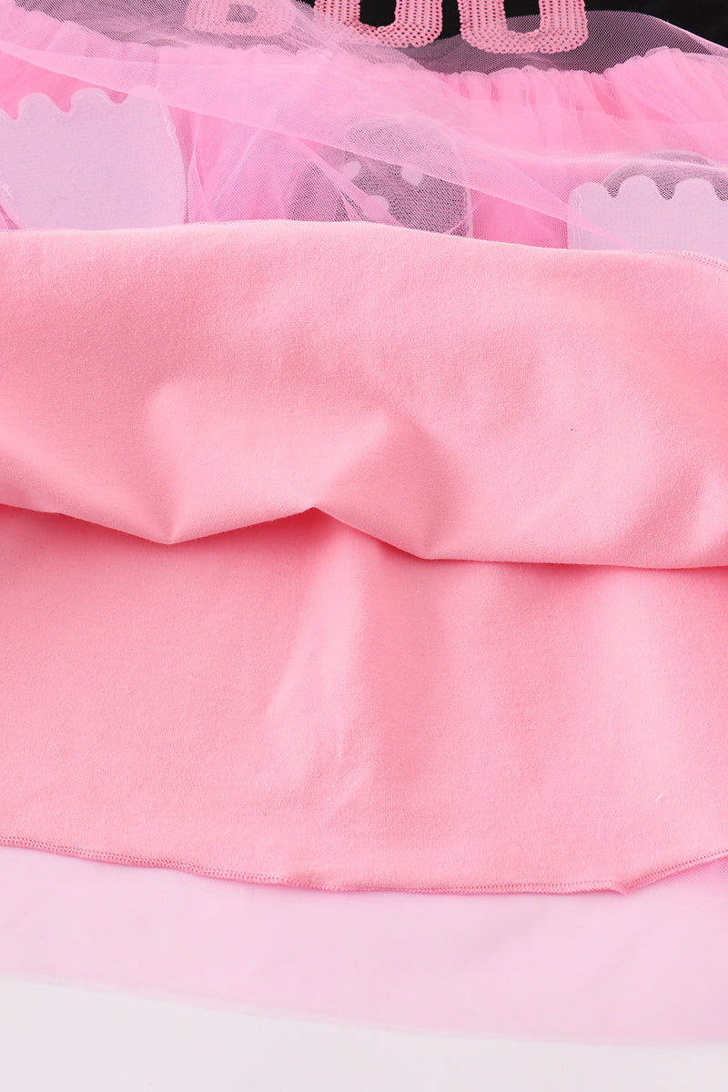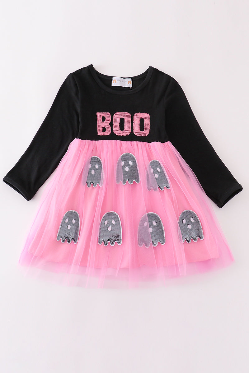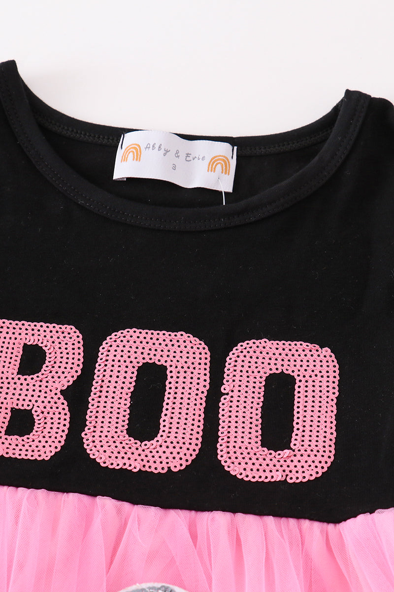 Boo! Get ready to be the life of the Halloween party in our black sequin tutu dress. With its playful "boo" design and sparkling sequins, you'll be sure to turn heads. This tutu dress is perfect for adding a touch of fun and spookiness to any costume.