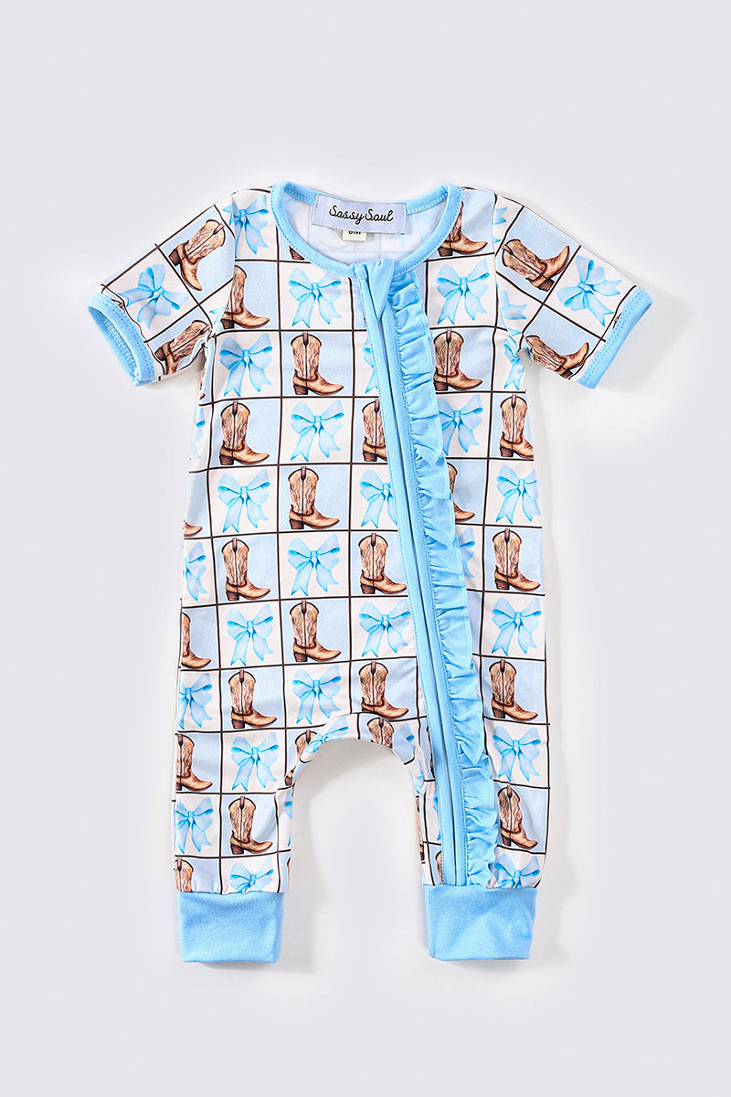 Get your little one ready for some stylish adventures with our blue boots print girl romper! This adorable romper features a playful print that will surely make a statement. Perfect for any occasion, this romper is a must-have addition to your little fashionista's wardrobe!