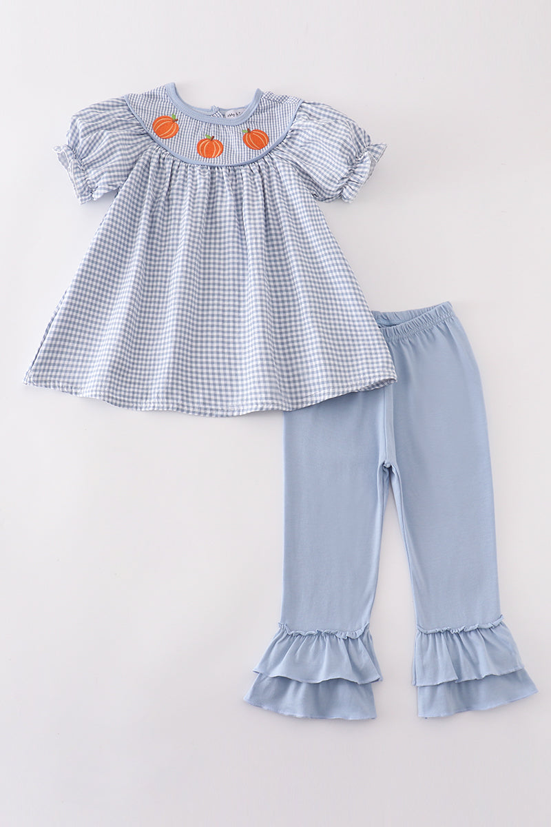 This charming set features playful blue gingham and delightful pumpkin embroidery for a unique and fun look. A must-have for any little girl's wardrobe, it's sure to add a touch of whimsy to any outfit. Perfect for twirling, playing, and creating unforgettable memories!