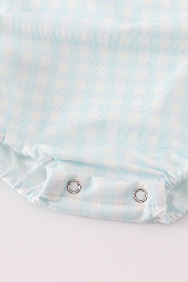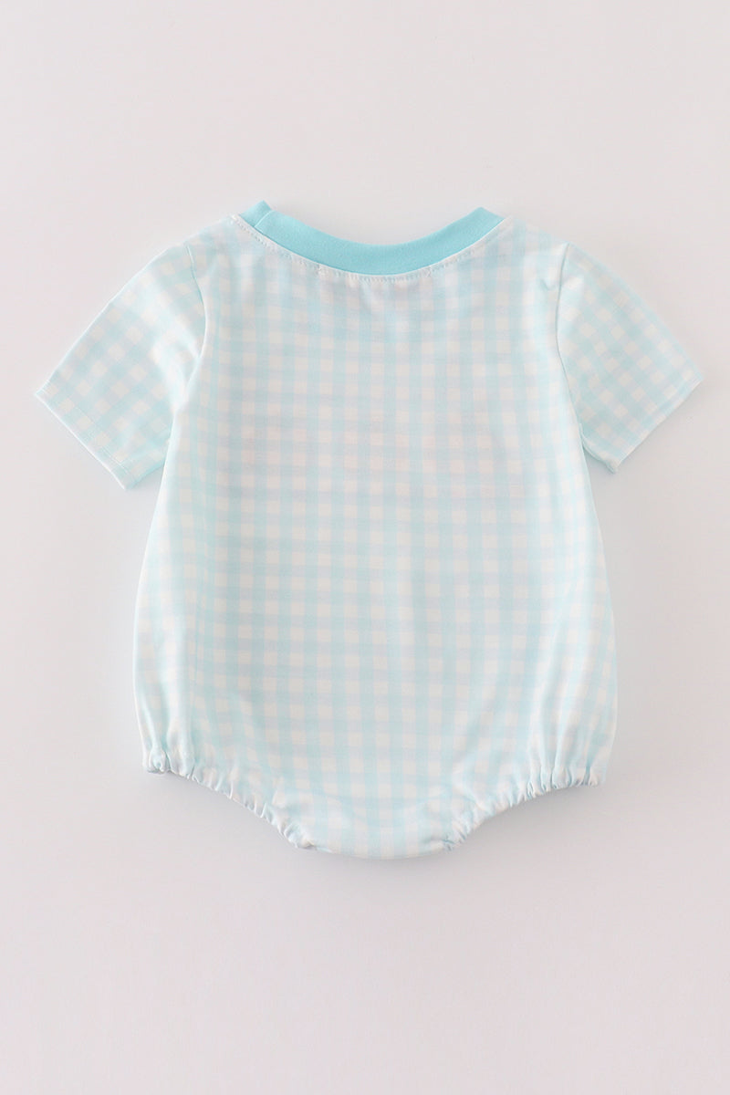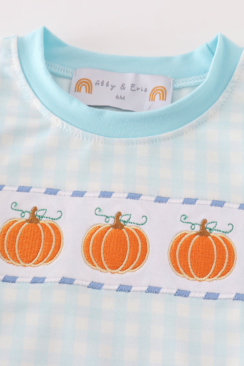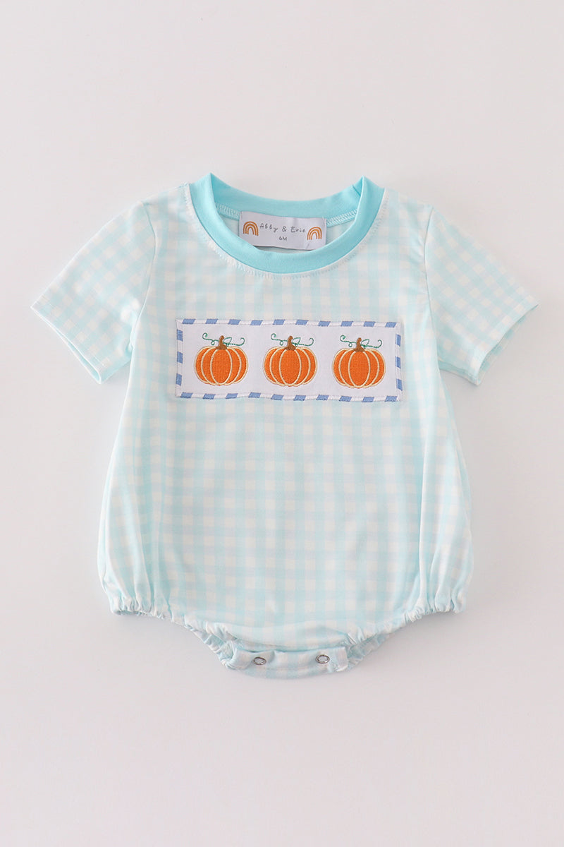 This adorable bubble features blue plaid with pumpkin embroidery, perfect for your little boy! Dress him up for fall fun (and pumpkin picking) in this playful piece.