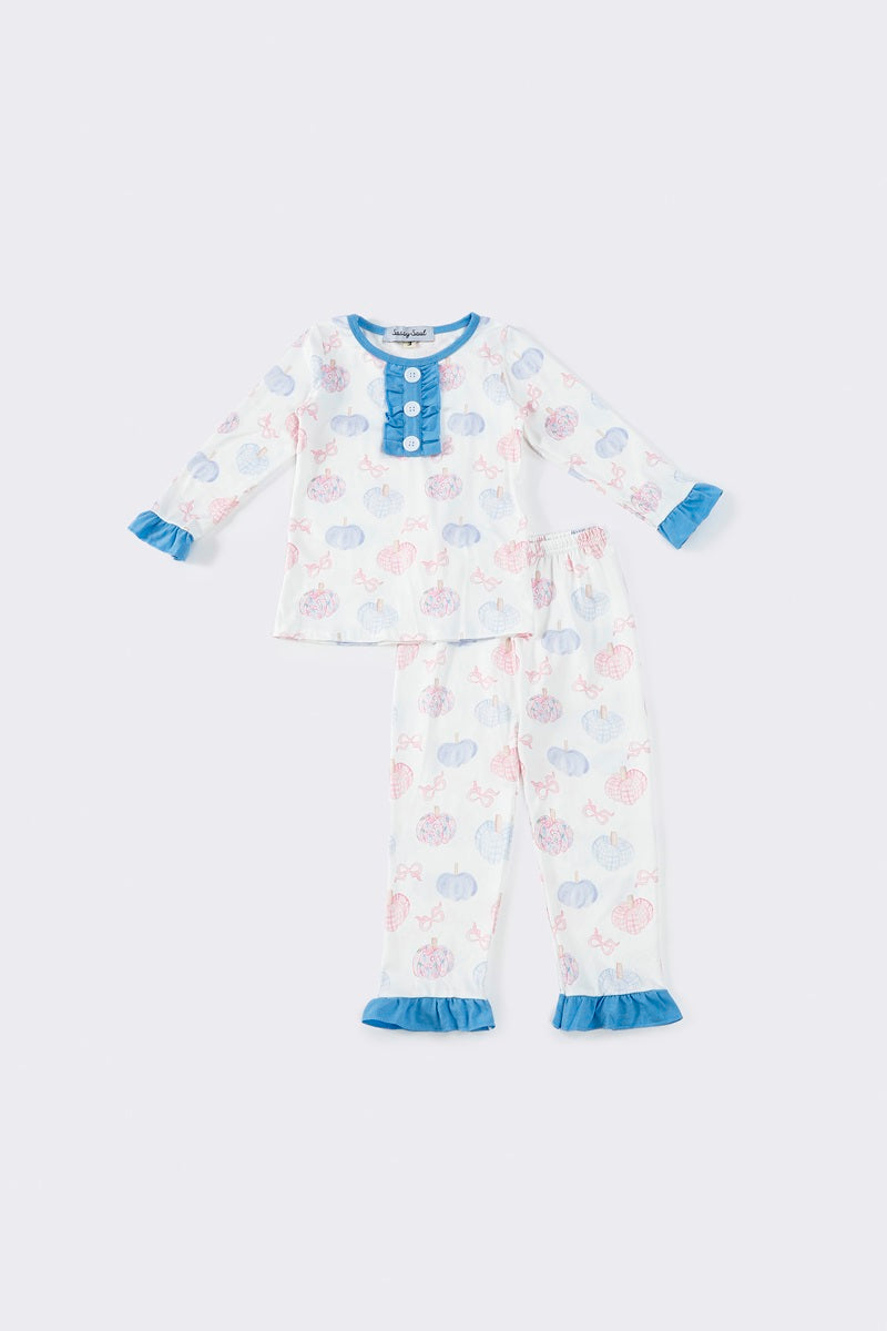 Introducing our Blue Pumpkin Print Girls Pajamas Set! These cozy PJs feature a playful pumpkin print that's perfect for the fall season. Made from high-quality fabric, your little girl will love snuggling up in these pajamas. Complete with a matching top and bottom, this set is both stylish and comfortable. Grab one now and get your little one ready for a spooktacular bedtime!