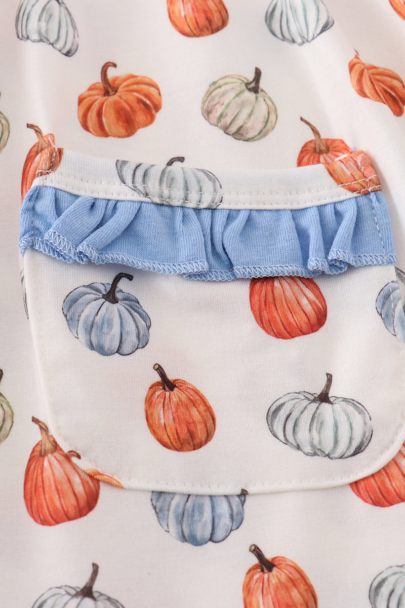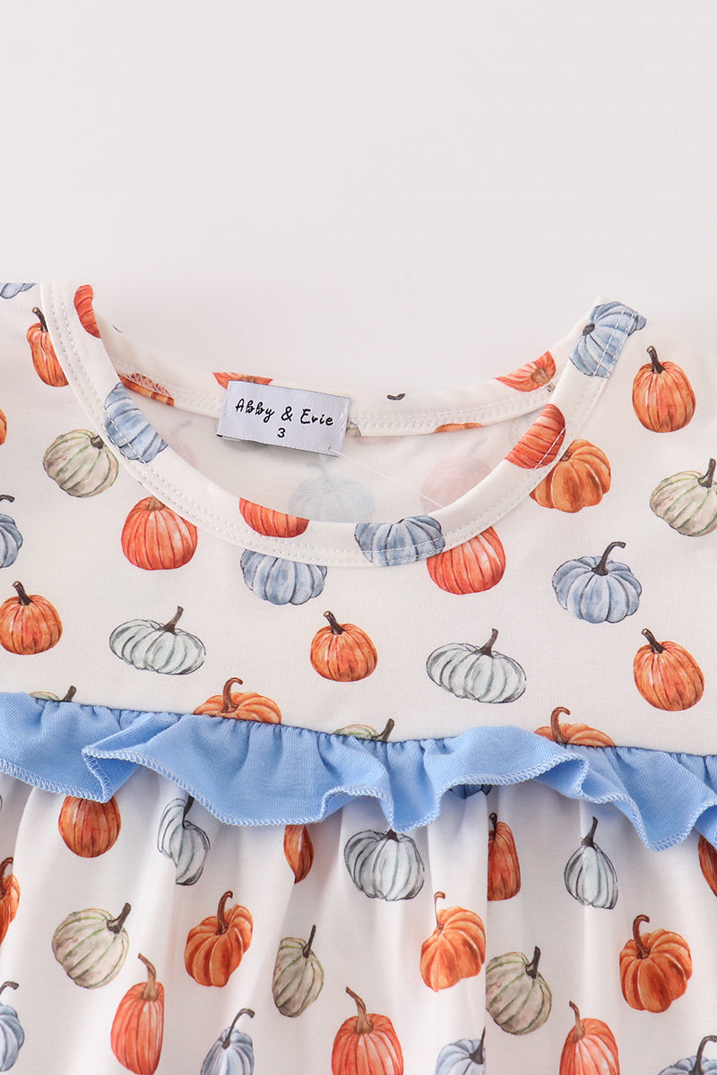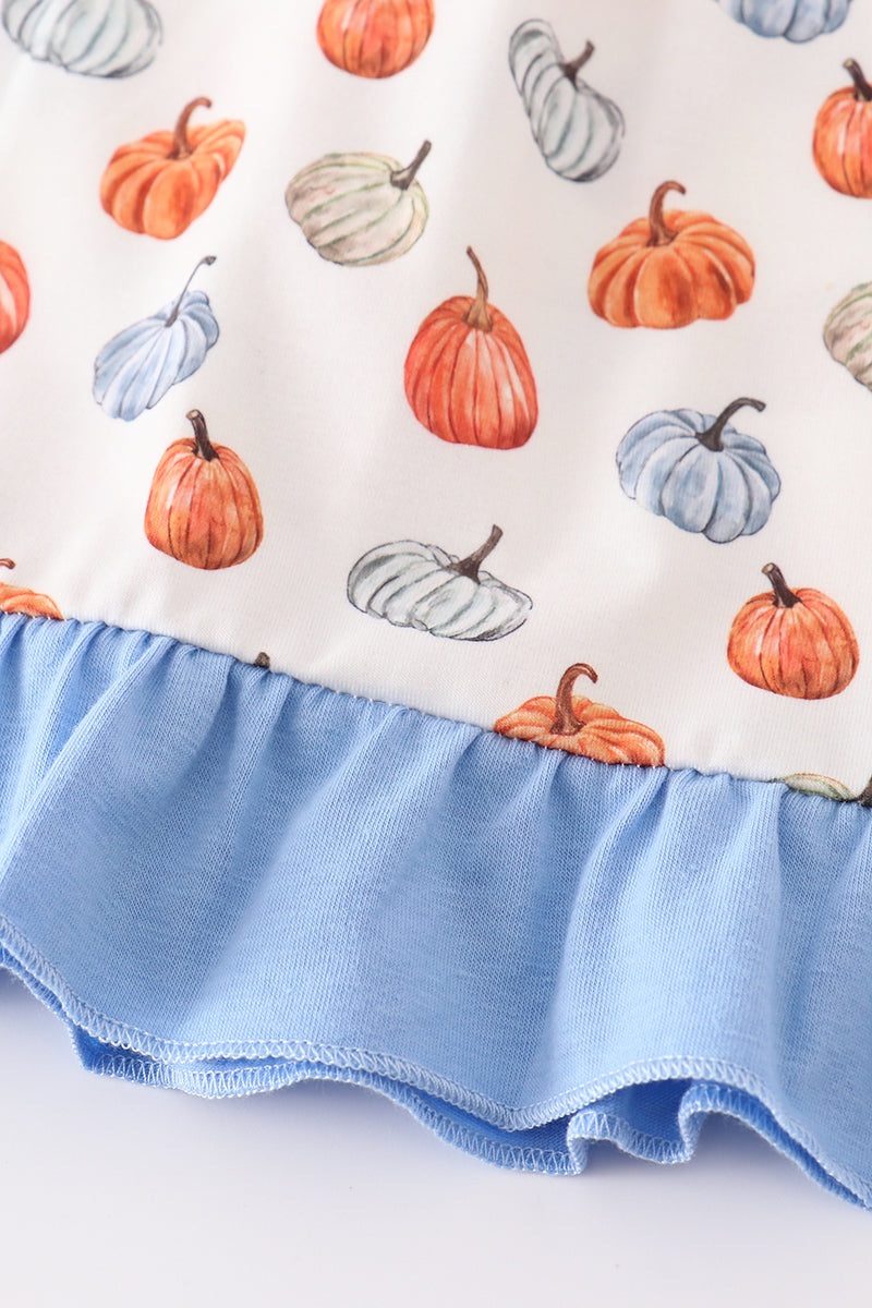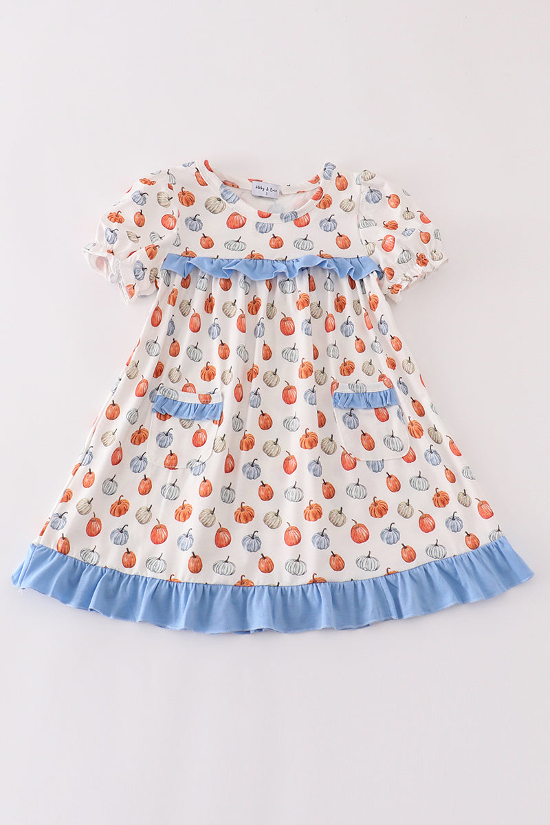 Get ready for fall with this blue pumpkin ruffle dress! Perfect for pumpkin patches and apple picking, this dress adds a touch of whimsy to your wardrobe. The ruffle detail adds texture and the blue color is a fun twist on the traditional autumn colors.