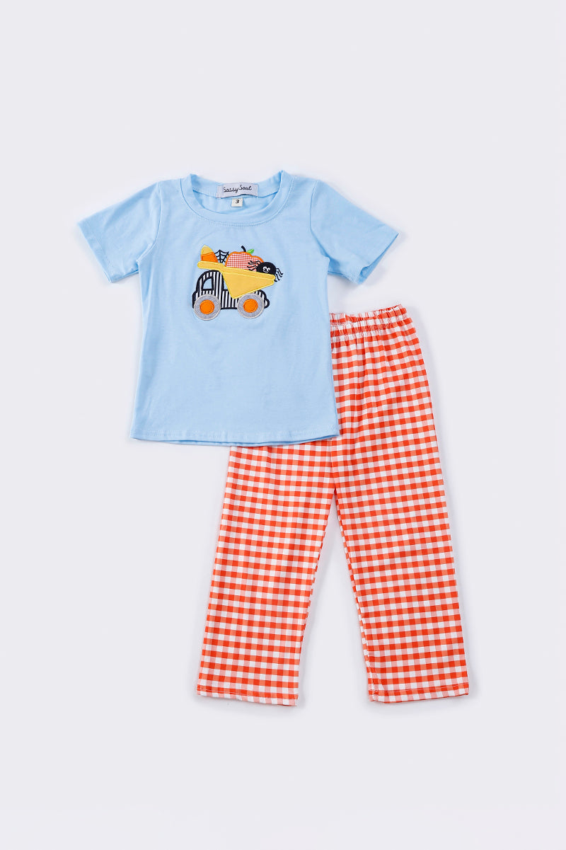 Add a playful and quirky touch to your little boy's wardrobe with our Blue Pumpkin Truck Applique Set! This set features a charming blue pumpkin truck applique, perfect for the fall season. Get your little one ready for the season with this unique and fun set!