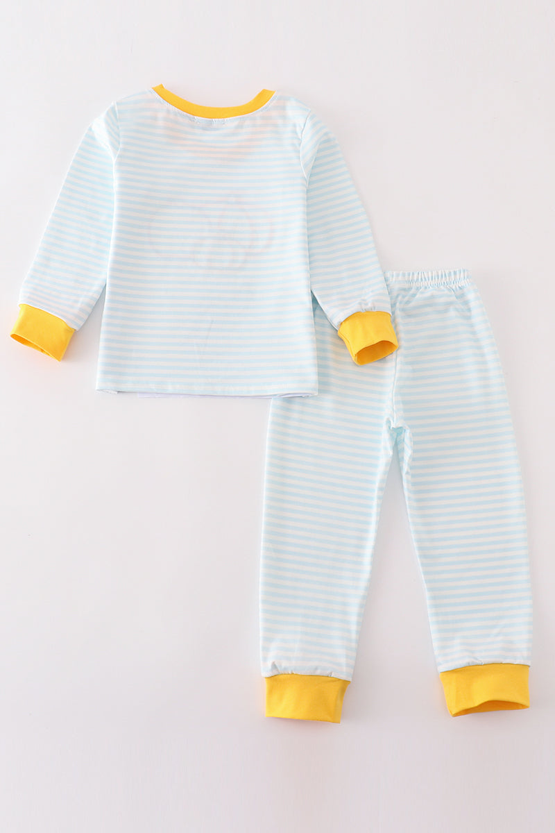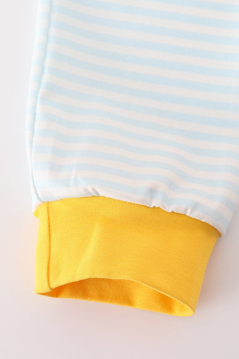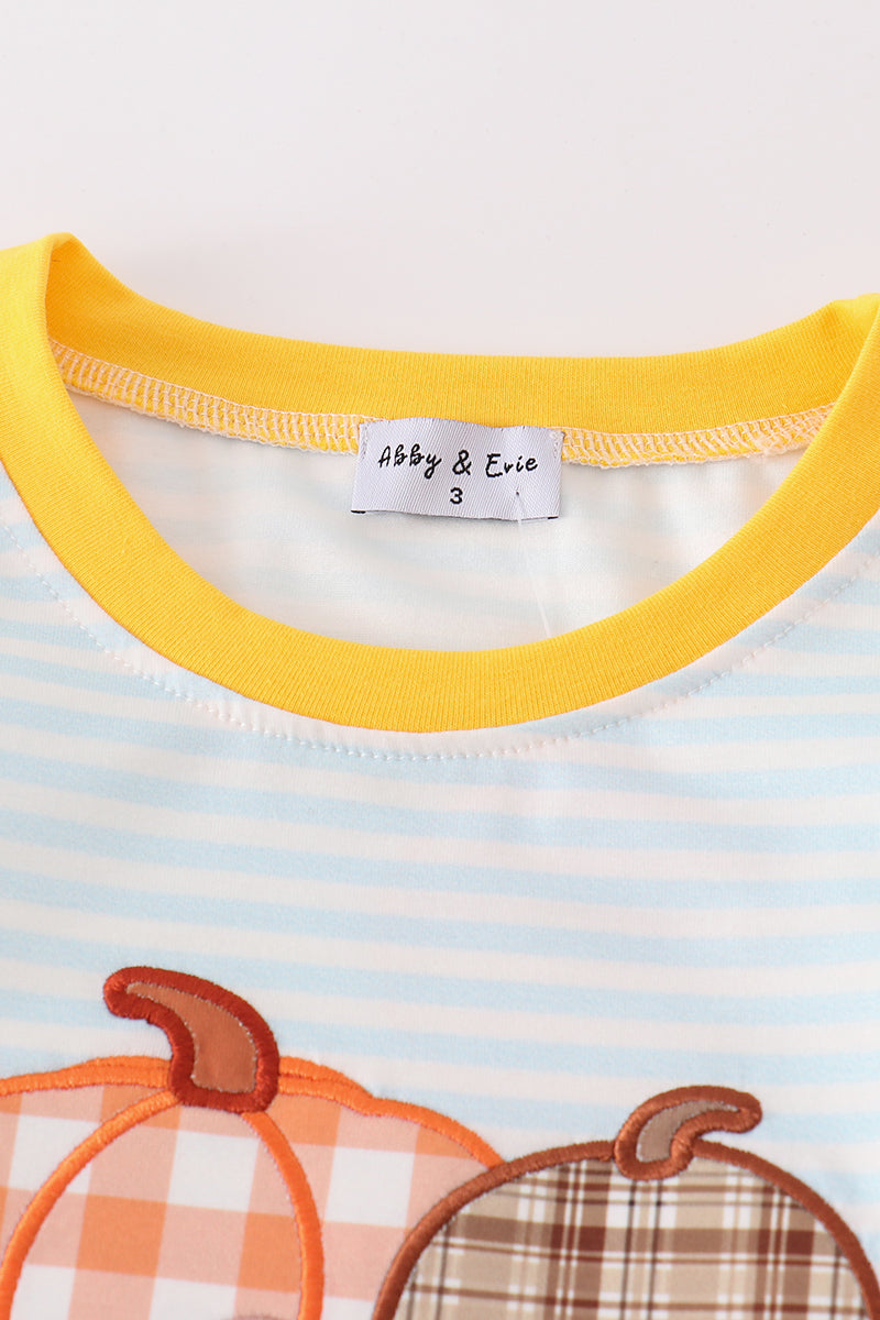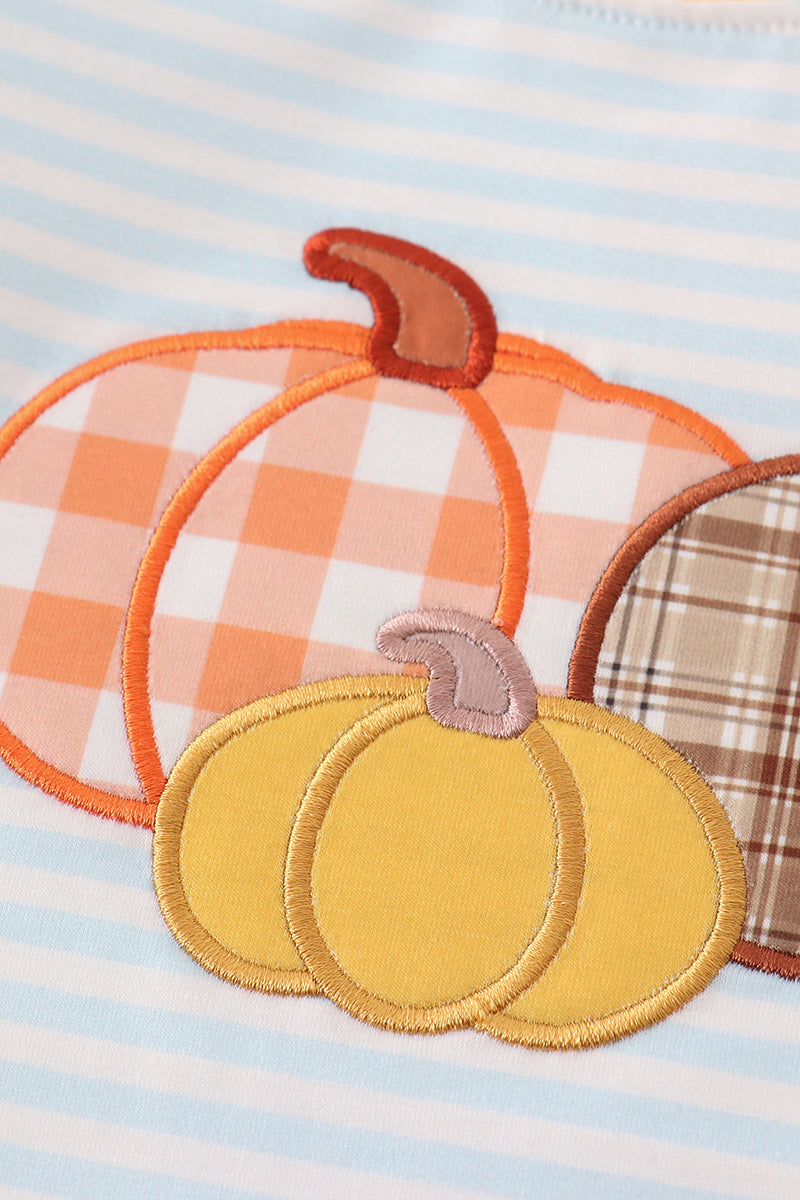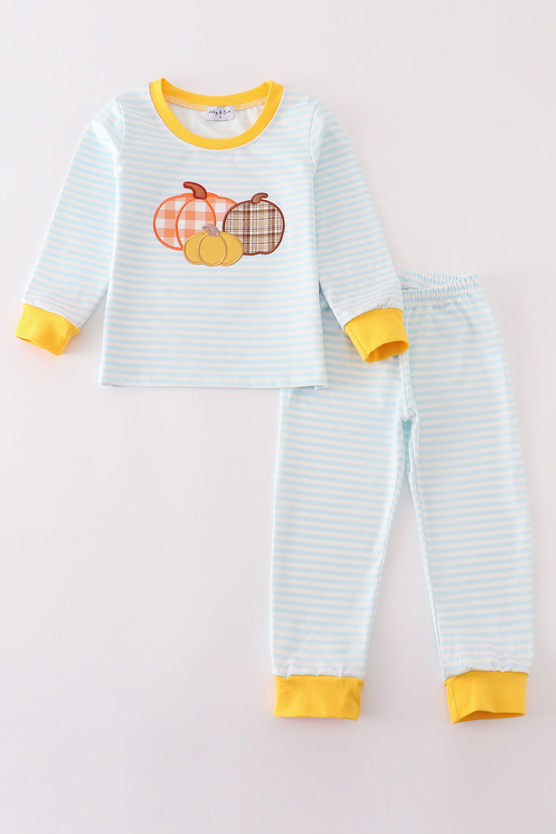 Get ready to fall in love with this adorable Blue Stripe Pumpkin Applique Boy Set! With its playful pattern and quirky pumpkin applique, your little one is sure to stand out in style. Perfect for any autumn occasion, this set is as comfortable as it is cute. Don't miss out on this must-have addition to your little boy's wardrobe!