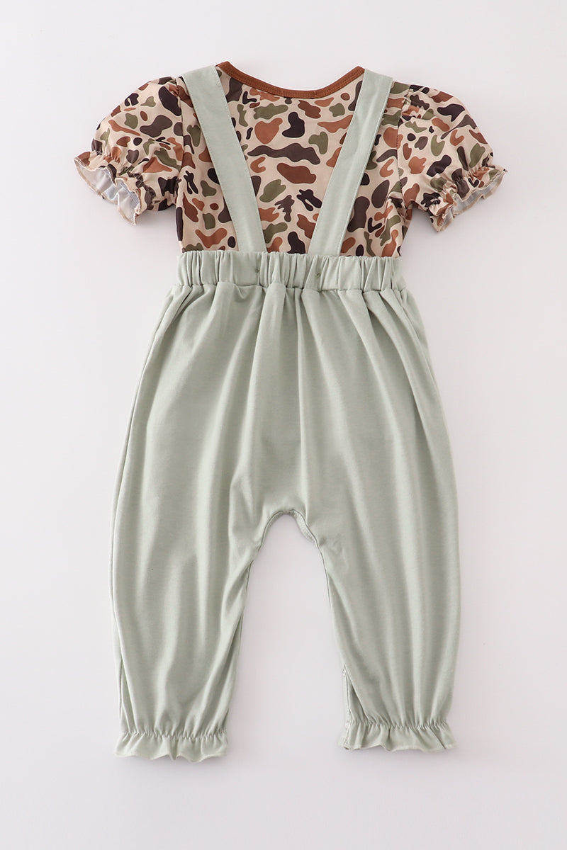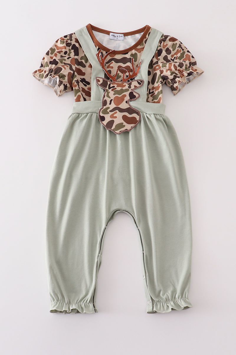 Unleash your little one's wild side with our Camouflage Deer Applique Girl Romper Set! Featuring a playful deer applique on a camo romper, this set is both stylish and comfortable. Perfect for outdoor adventures or just looking adorable, this romper set is a must-have for any trendy baby. (Wildly cute!)