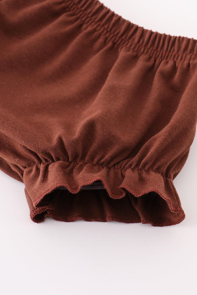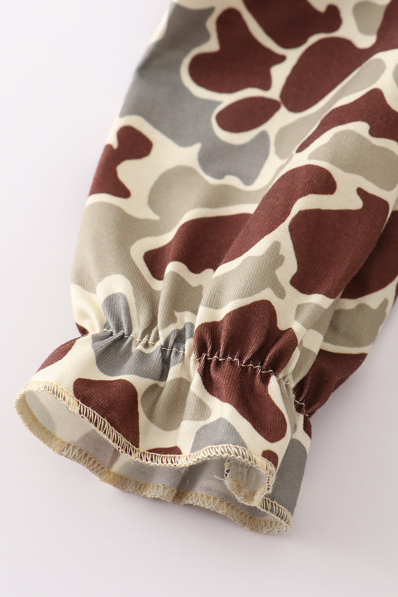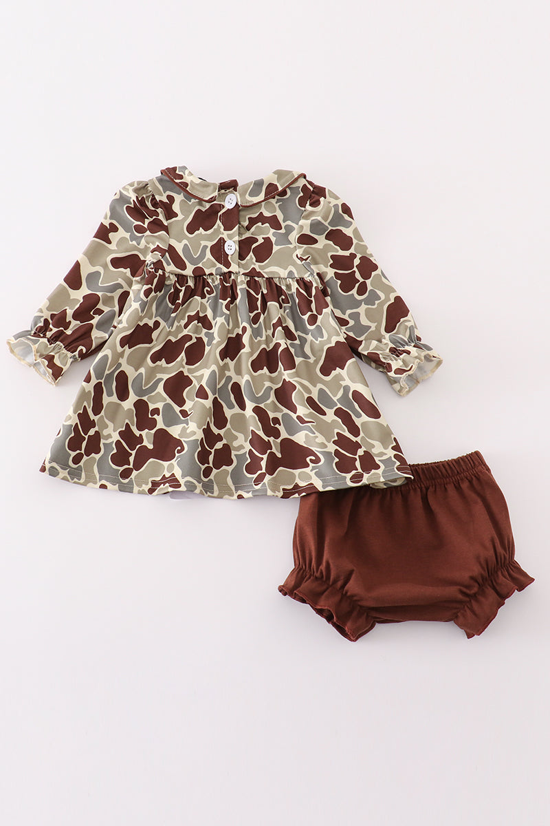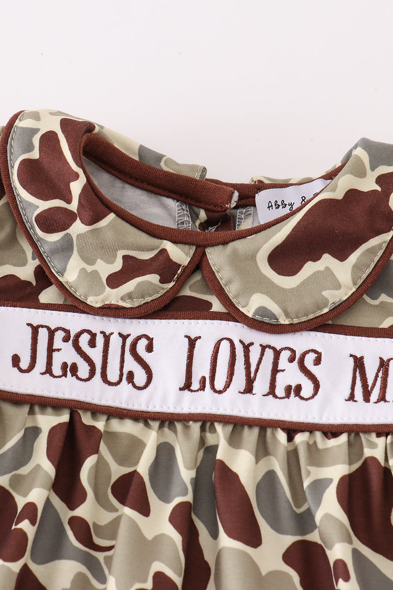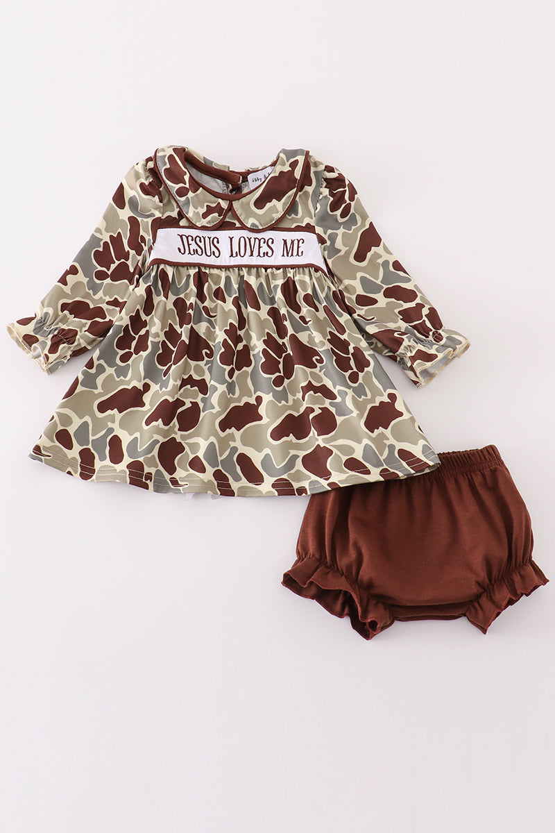 This cute Camouflage Jesus loves me bloomer set will make your little girl feel loved and fashionable. The embroidered design adds a charming touch while the camouflage pattern adds a unique twist. Perfect for any occasion, this set is a must-have for your little fashionista!