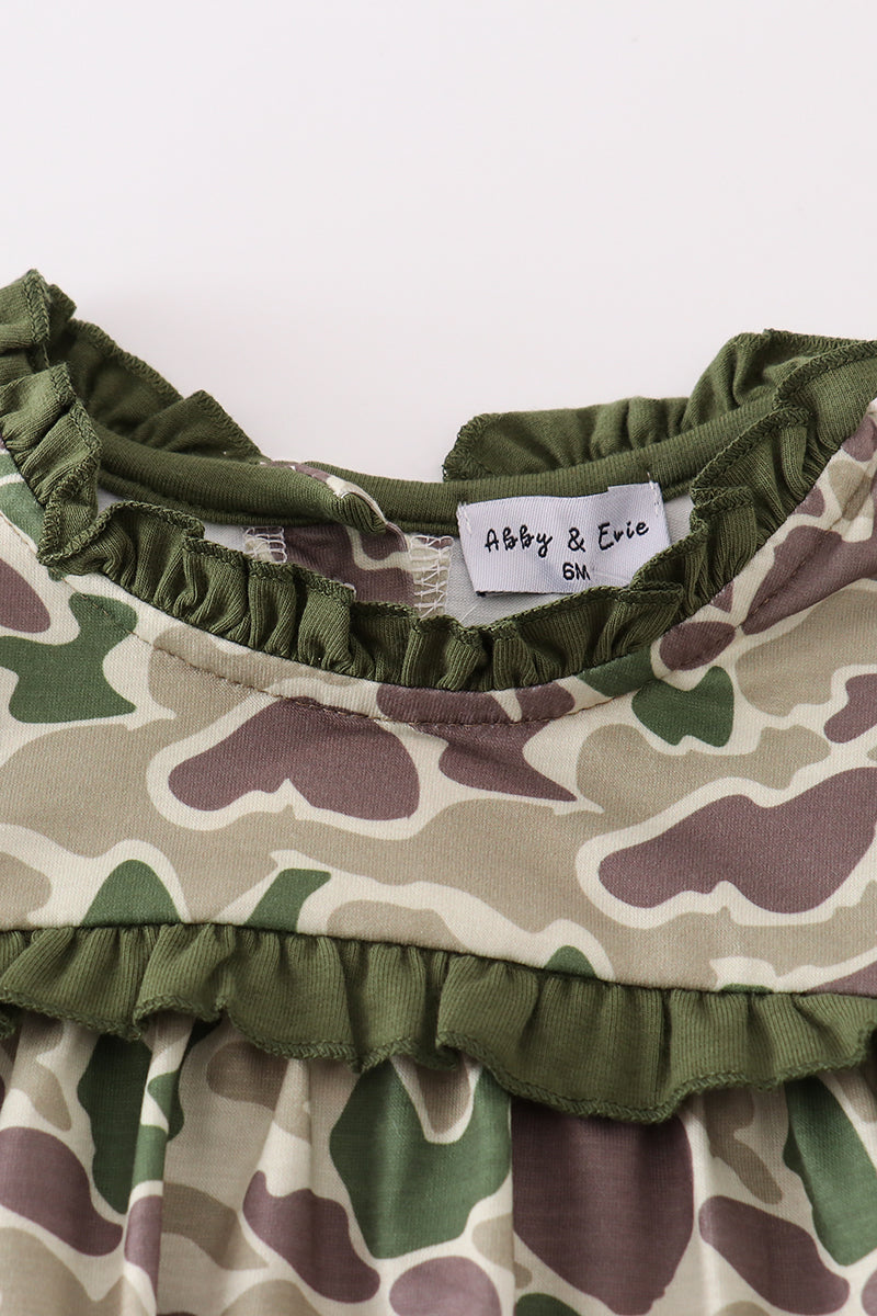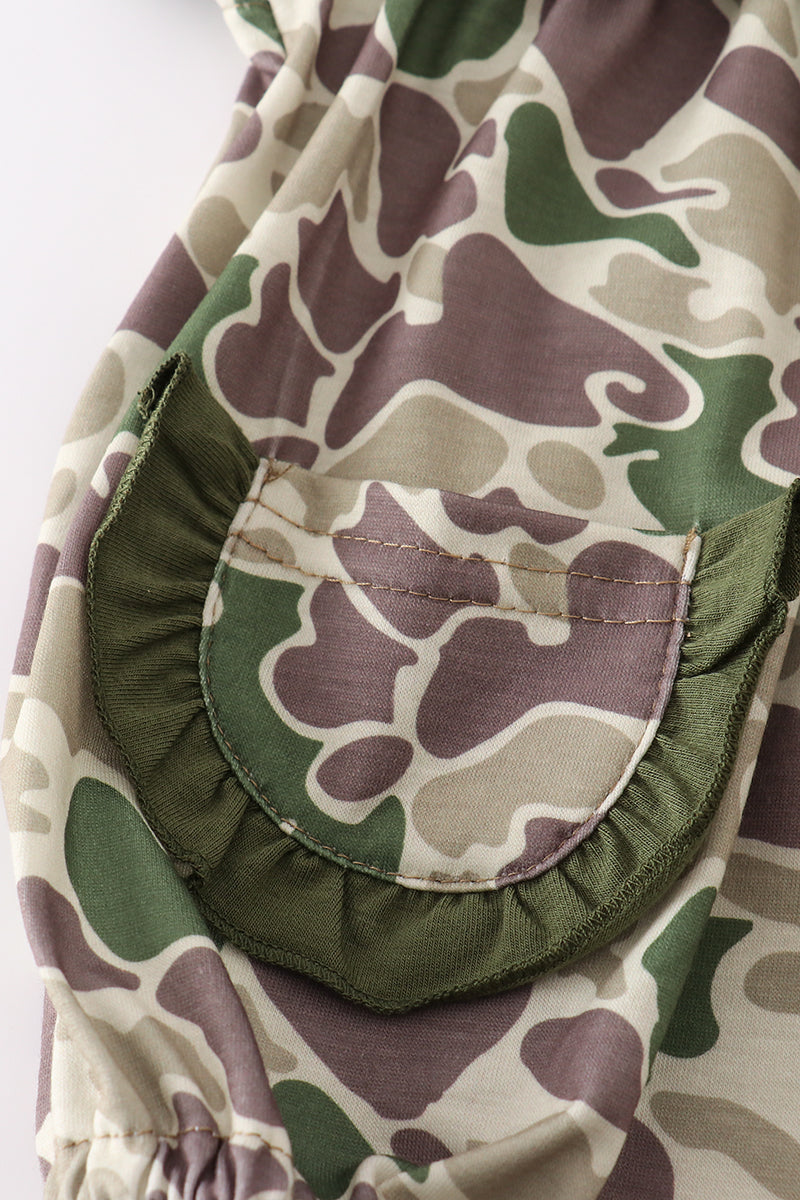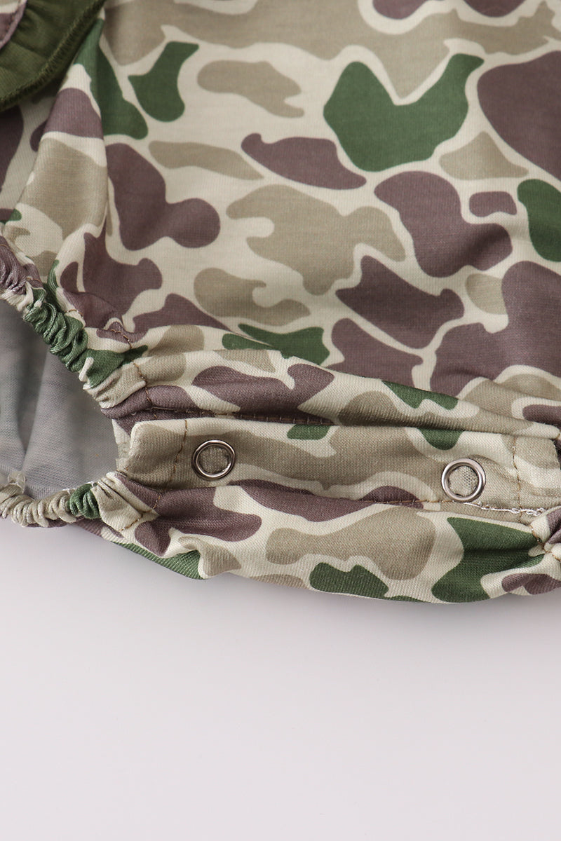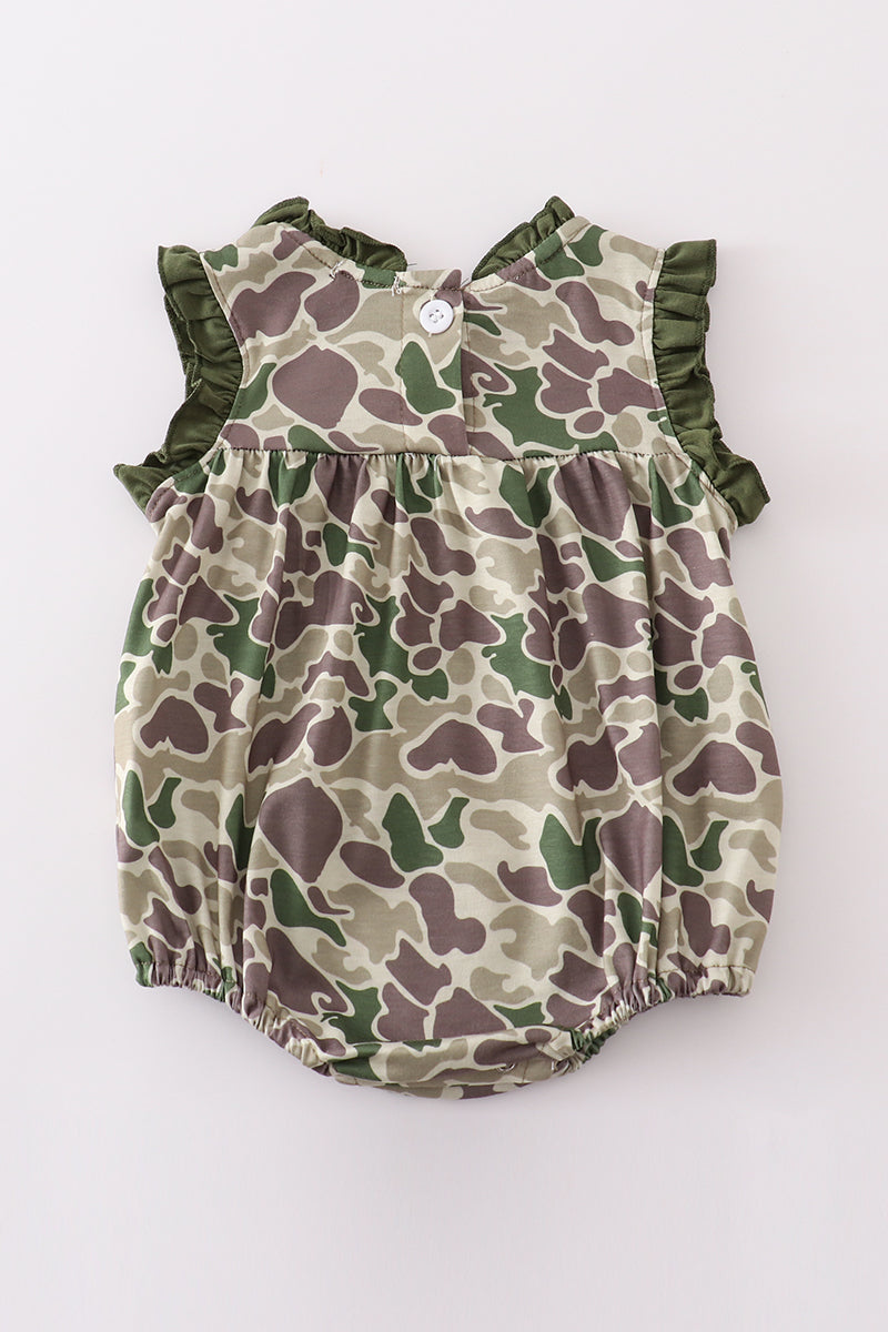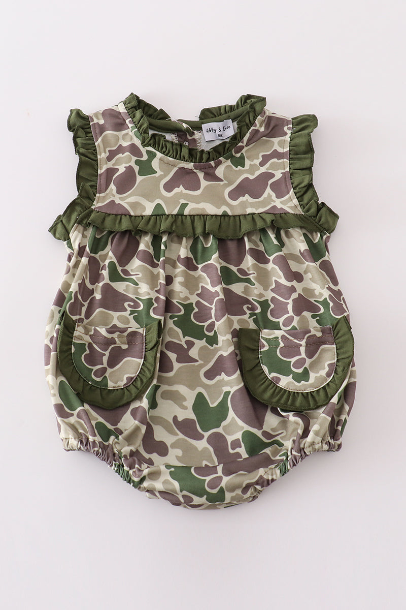 Get ready to blend in with style in our Camouflage print ruffle bubble! This unique and playful design features a fun camo print and ruffled detailing, making it perfect for any fashion-forward individual. Stand out from the crowd with this quirky and fun piece.