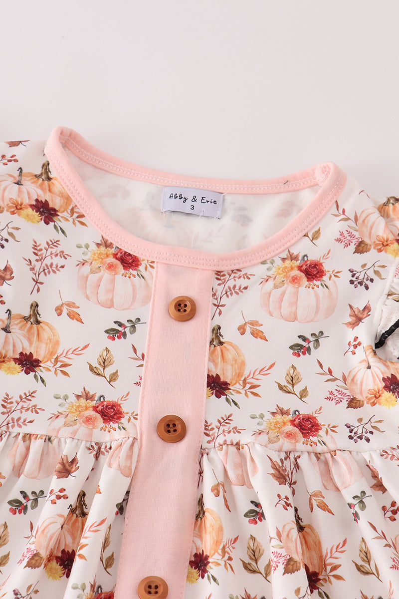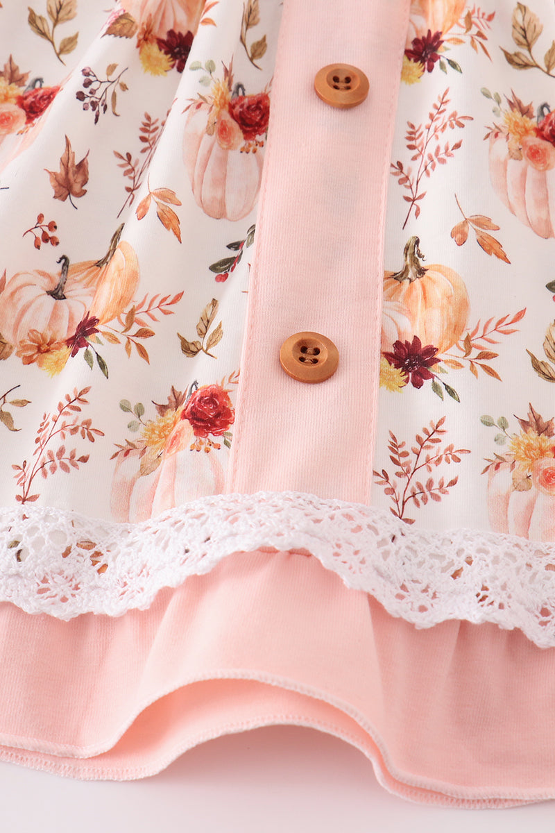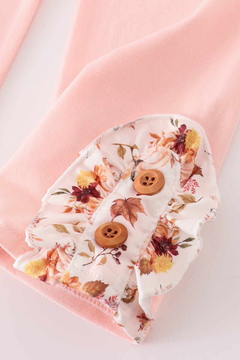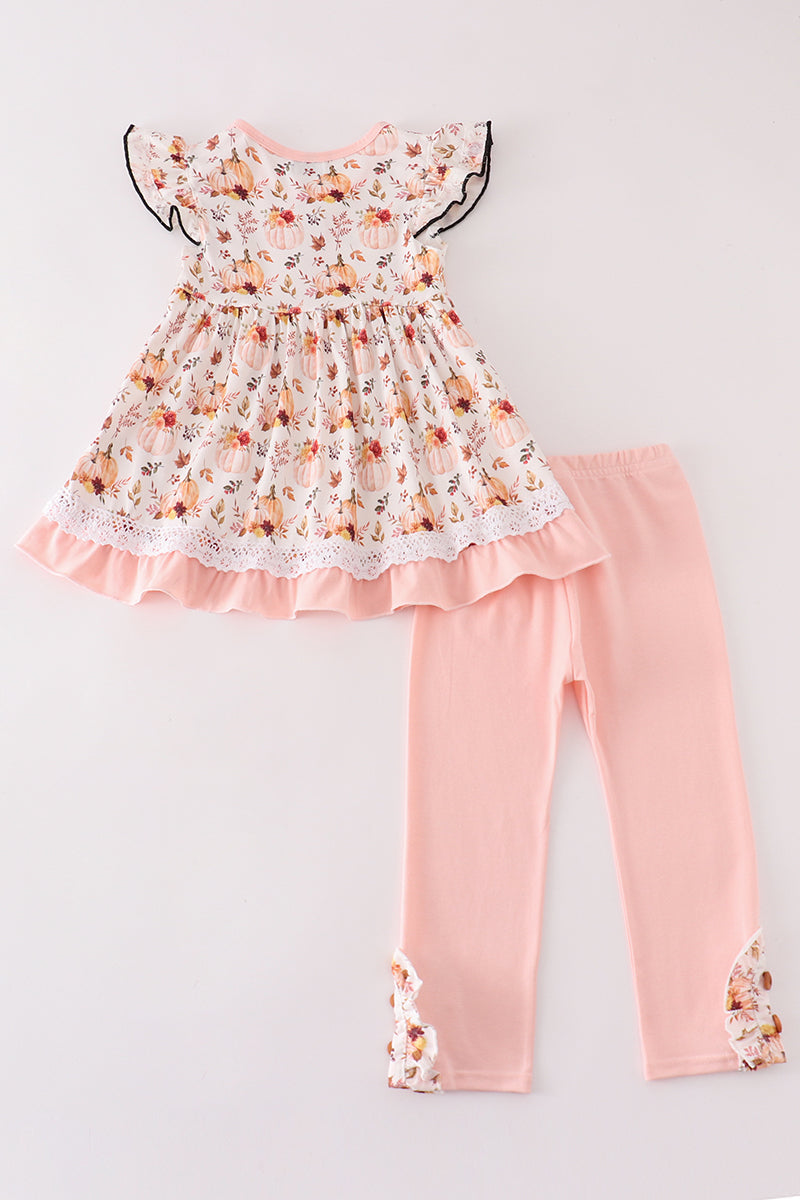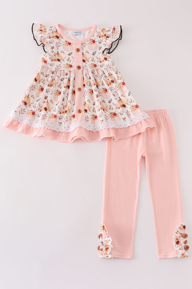 Spice up your little girl's wardrobe with this adorable Coral Pumpkin Print Girl Set! With its playful pumpkin print and trendy coral color, this set is sure to make a statement. Perfect for fall photoshoots or just everyday wear. Get yours today!