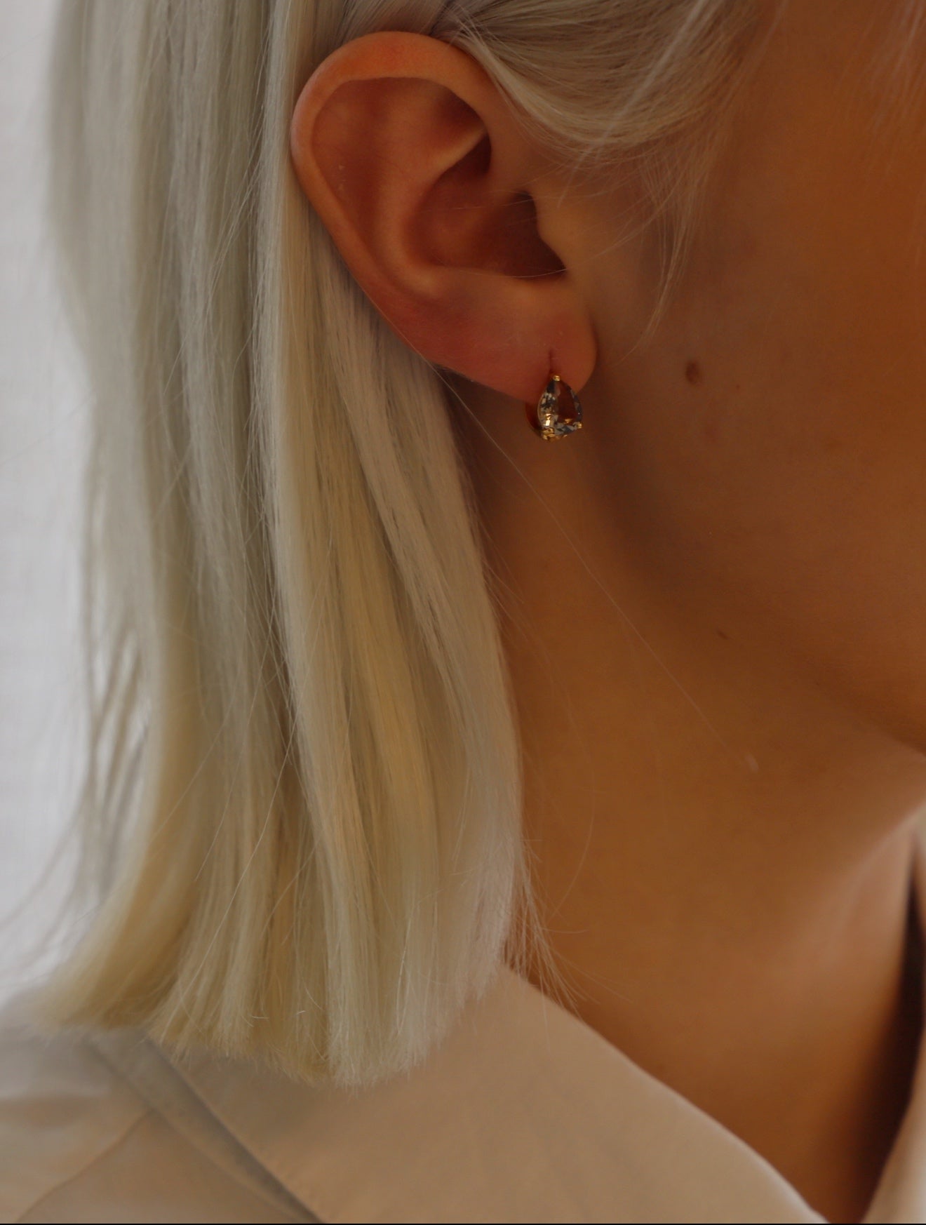 Materials: Crystal cz teardrop, 16kt gold plated brass huggie