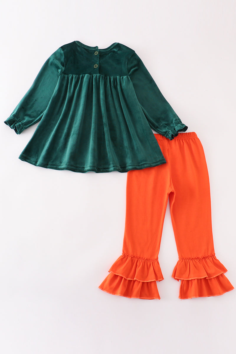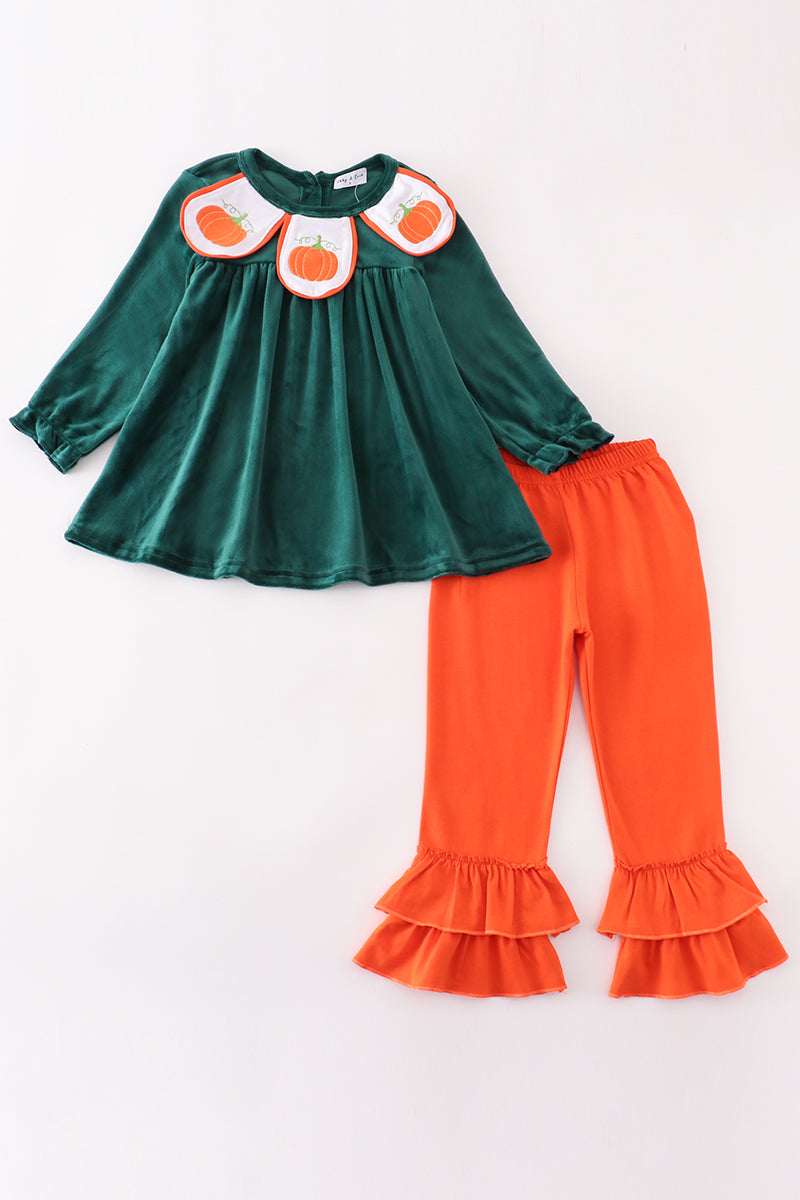 Get cozy with our Forest Velvet Pumpkin Embroidery Girl Set. Made with soft velvet fabric and adorned with playful pumpkin embroidery, this set is perfect for any fall adventure. Whether she's playing in the leaves or enjoying a pumpkin spice latte, your little girl will love this quirky and fun outfit. Add some whimsy to her wardrobe today!