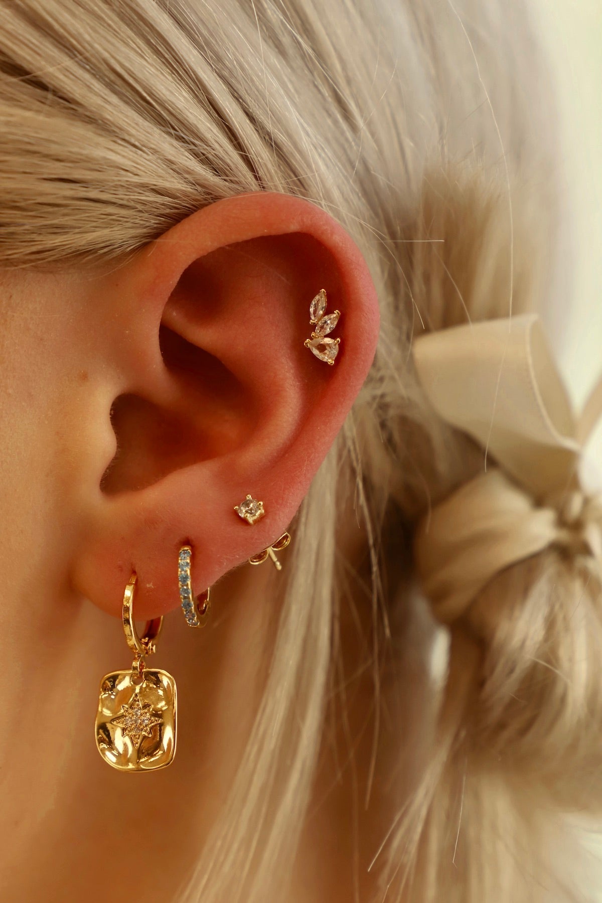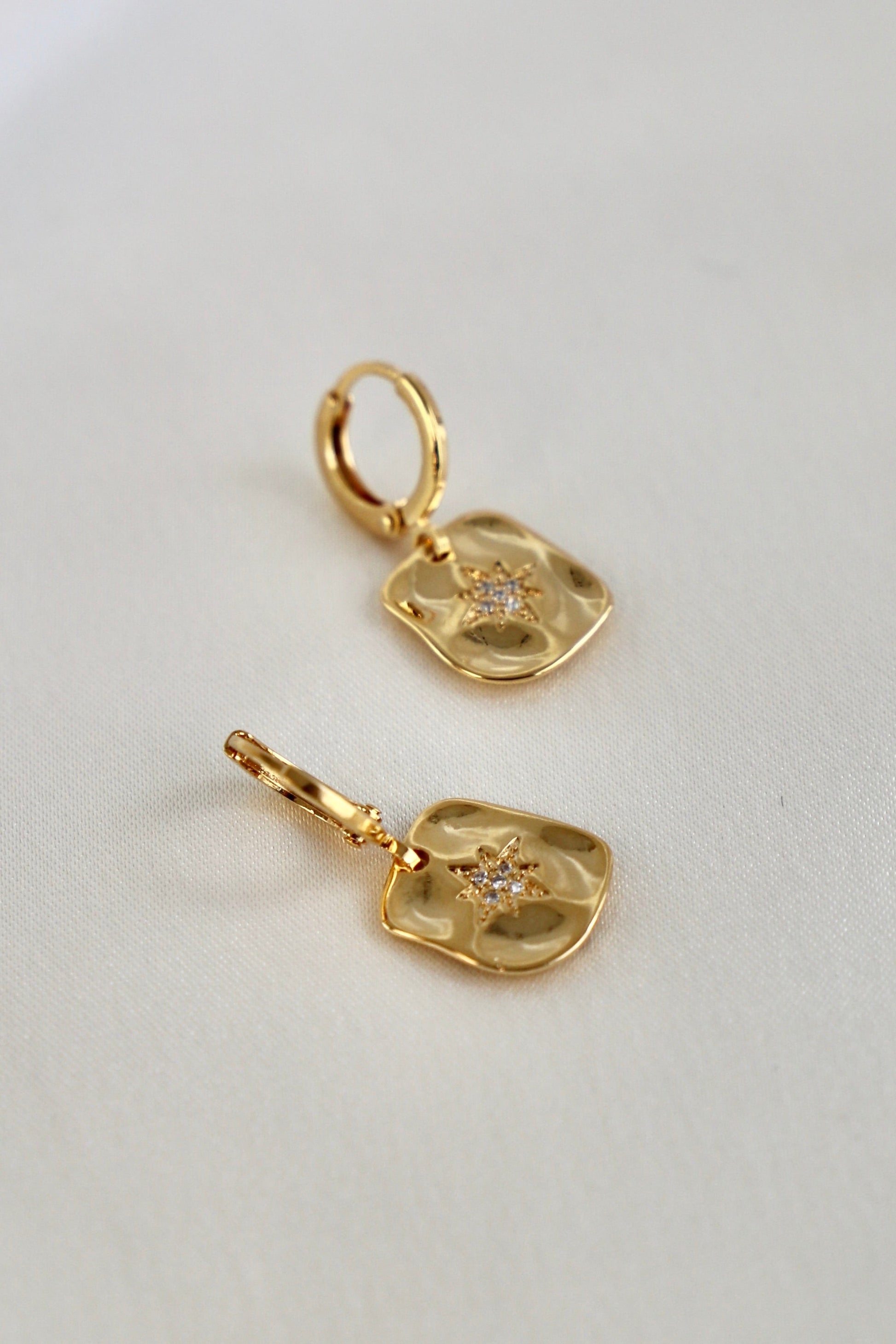 We can't get enough of our pressed styles! These huggies features a misshapen rectangular north star that drops down from the huggie, creating an effortless, lightweight style that you'll want to style 24/7.