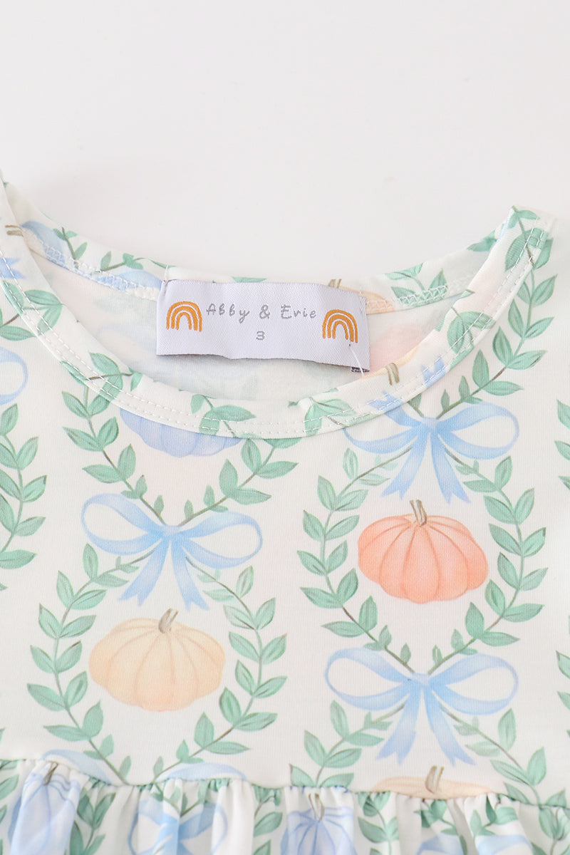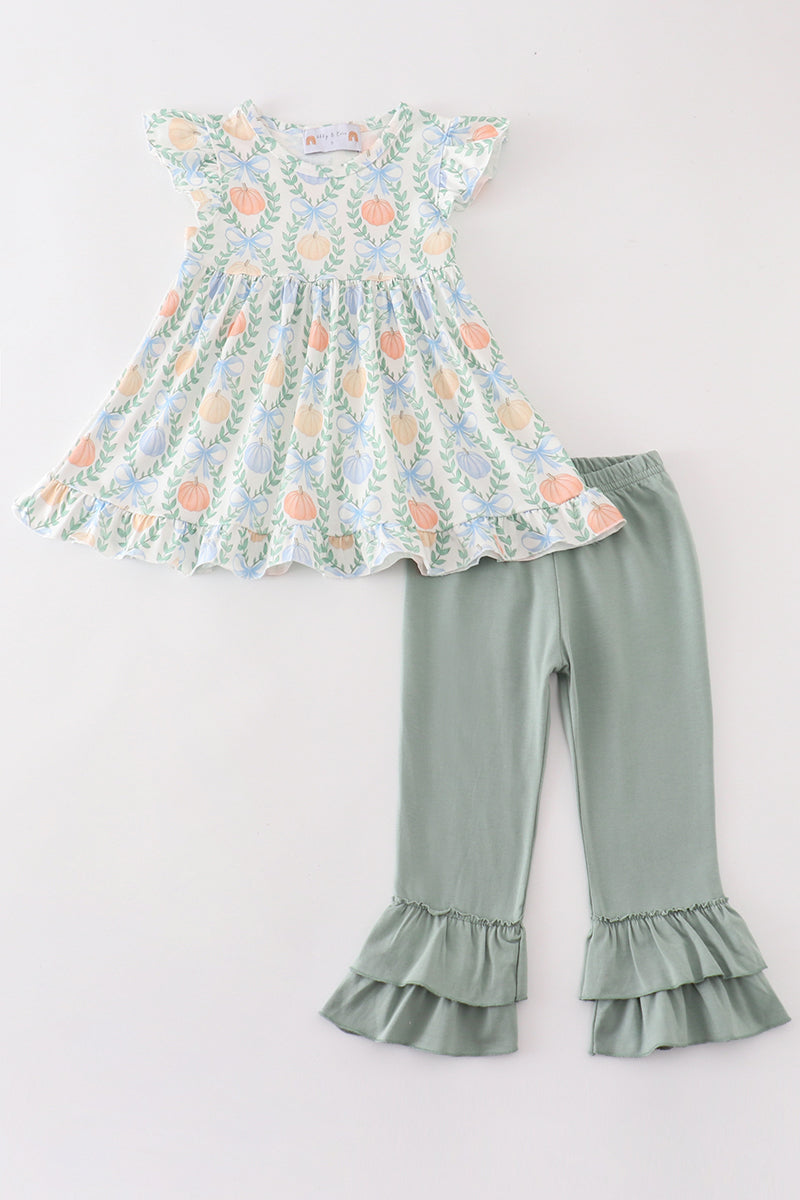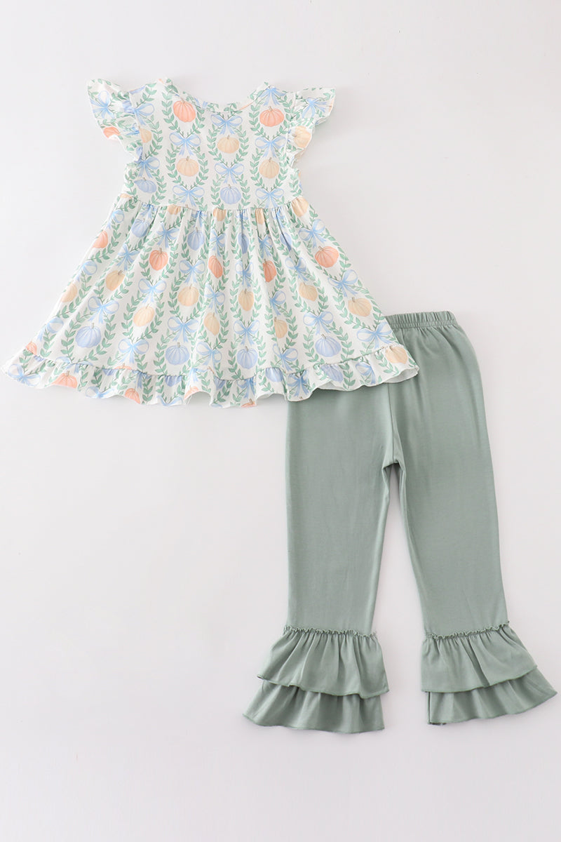 Get in the autumn spirit with our Green Bow Pumpkin Print Girl Set! This adorable set features a playful pumpkin print that will make your little girl stand out. The green bow adds a touch of whimsy to this charming outfit. Perfect for any fall occasion, this set is sure to bring joy to your little one's wardrobe.