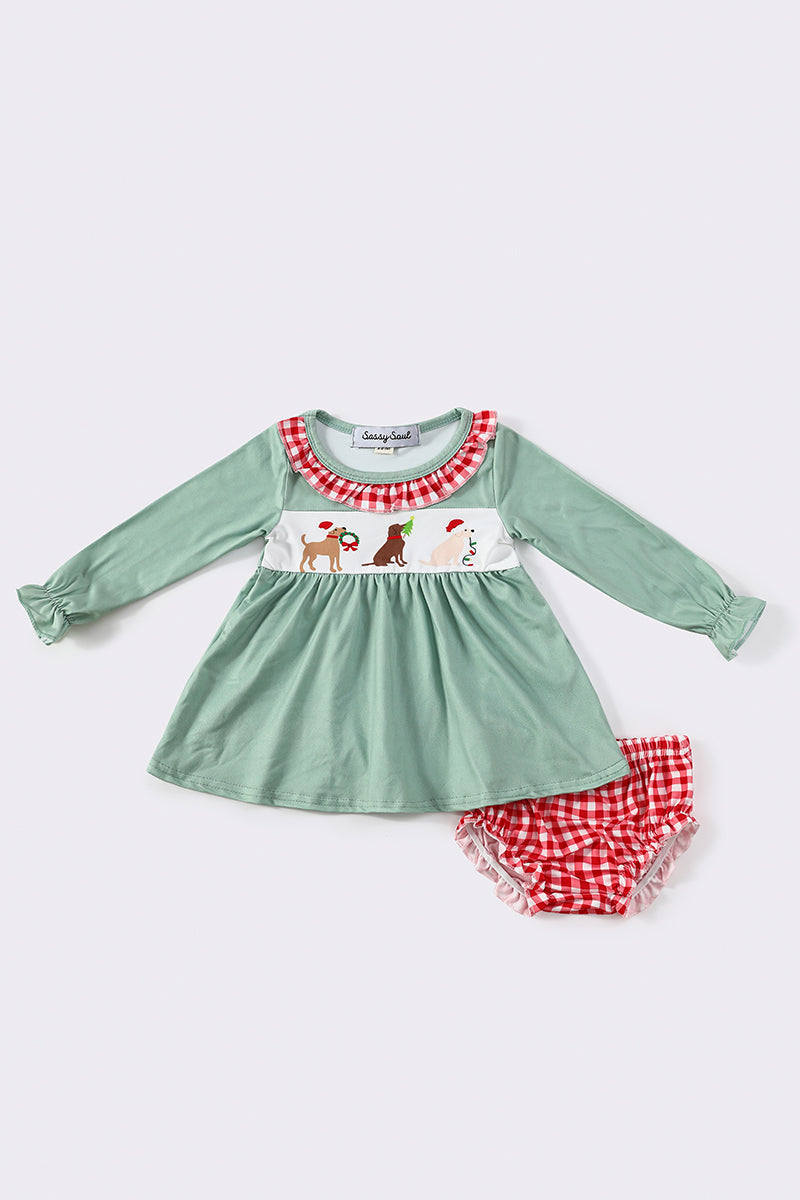 Introducing our Green Christmas Puppy Print Baby Girl Set! Adorable, festive, and oh-so-cute, this set is perfect for your little one's first holiday season. The green color and puppy print add a playful touch to this cozy and comfy ensemble. Get ready for some serious cuteness overload!