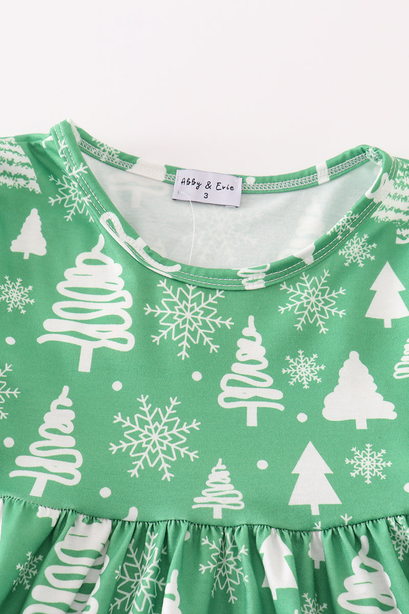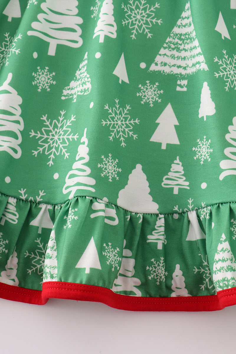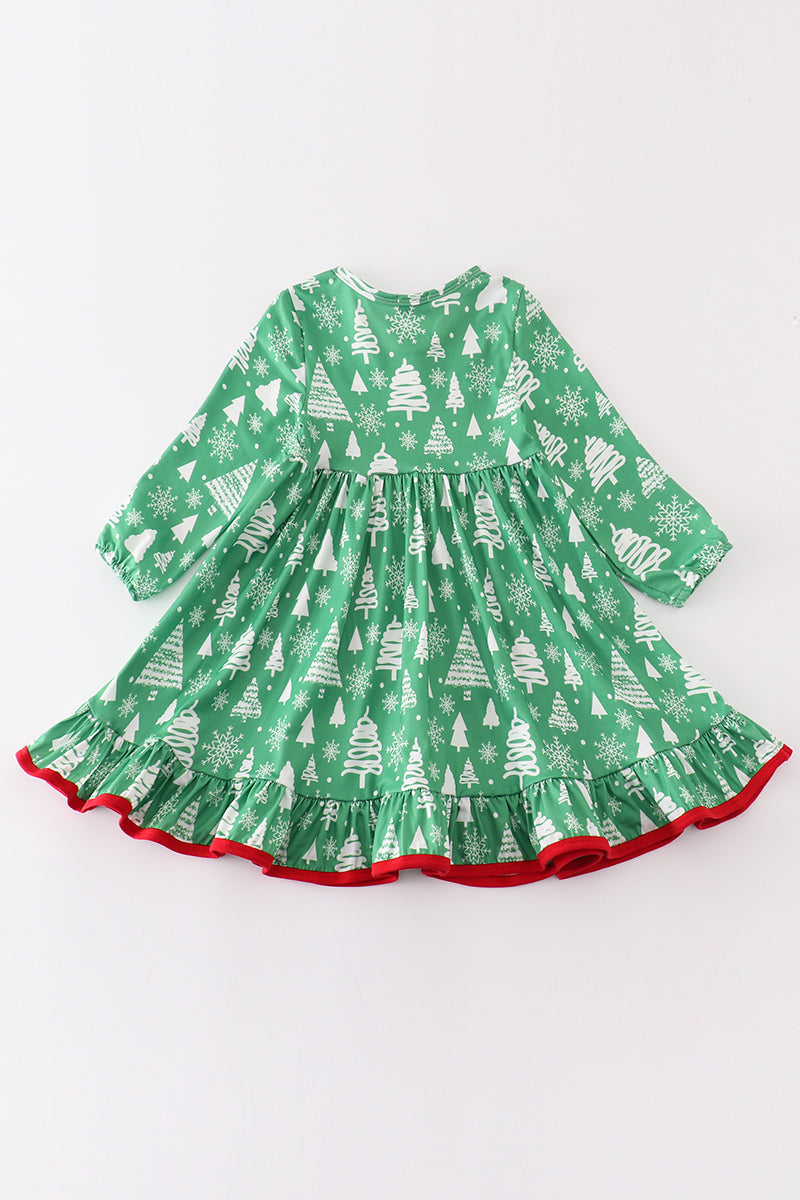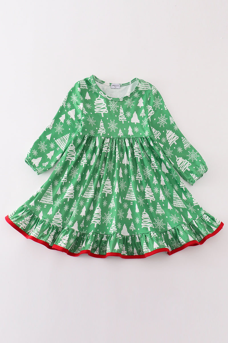 This festive dress will have you standing out at any holiday party! The green ruffle design gives a playful twist to the classic Christmas tree pattern. Perfect for making a statement and spreading holiday cheer.