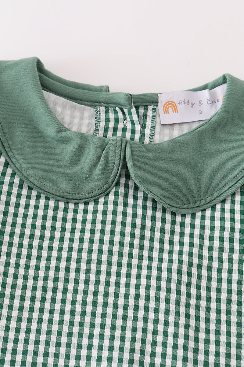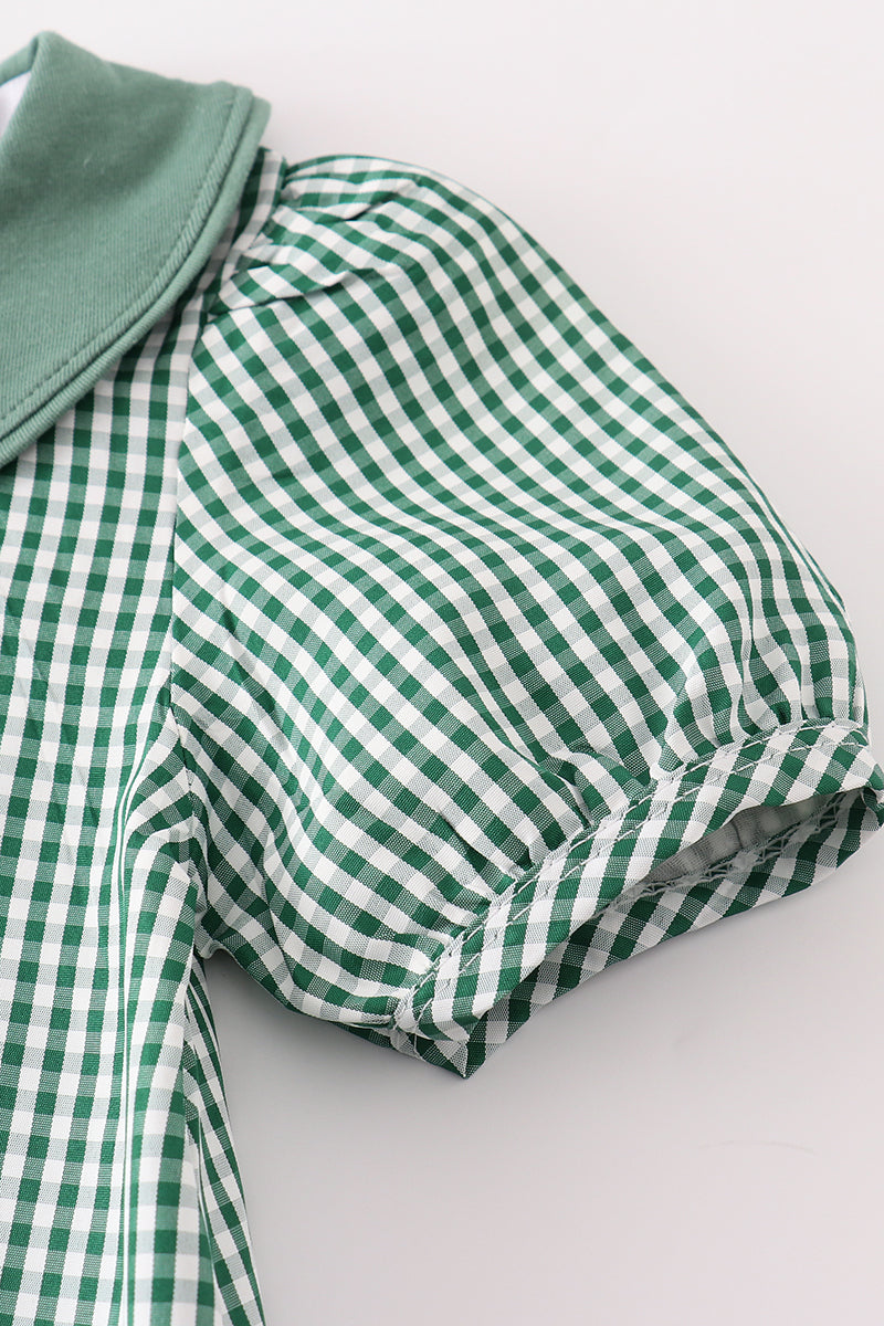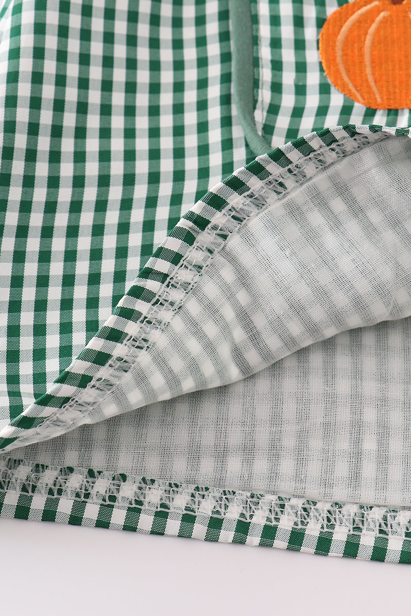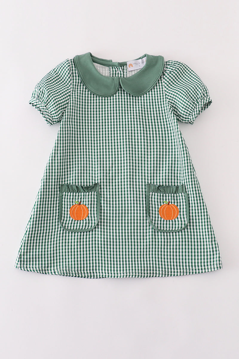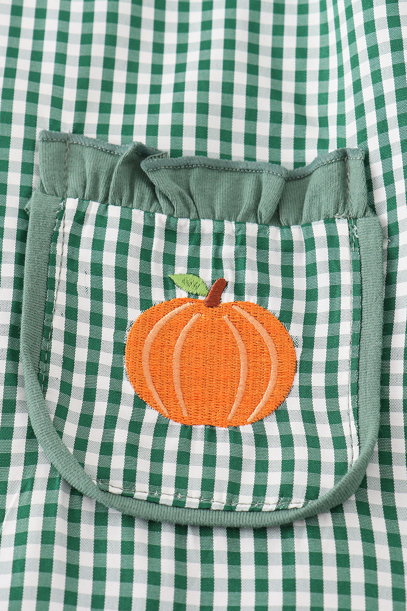 Get ready for some fun with this trendy Green Gingham Pumpkin Embroidery Dress! Perfect for fall, this dress features a playful pumpkin embroidery and a classic gingham pattern. Sure to make a statement at any event, it's both stylish and whimsical. (Pumpkin spice latte not included.)