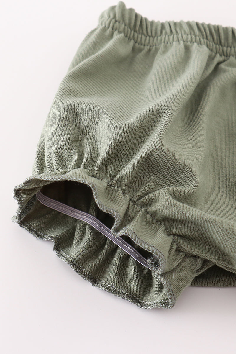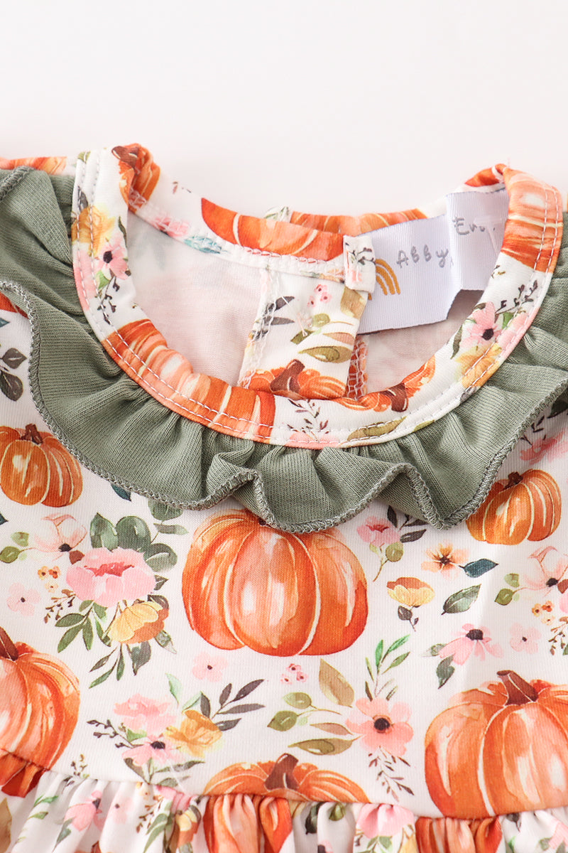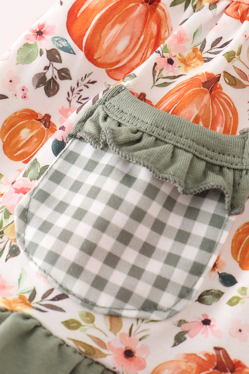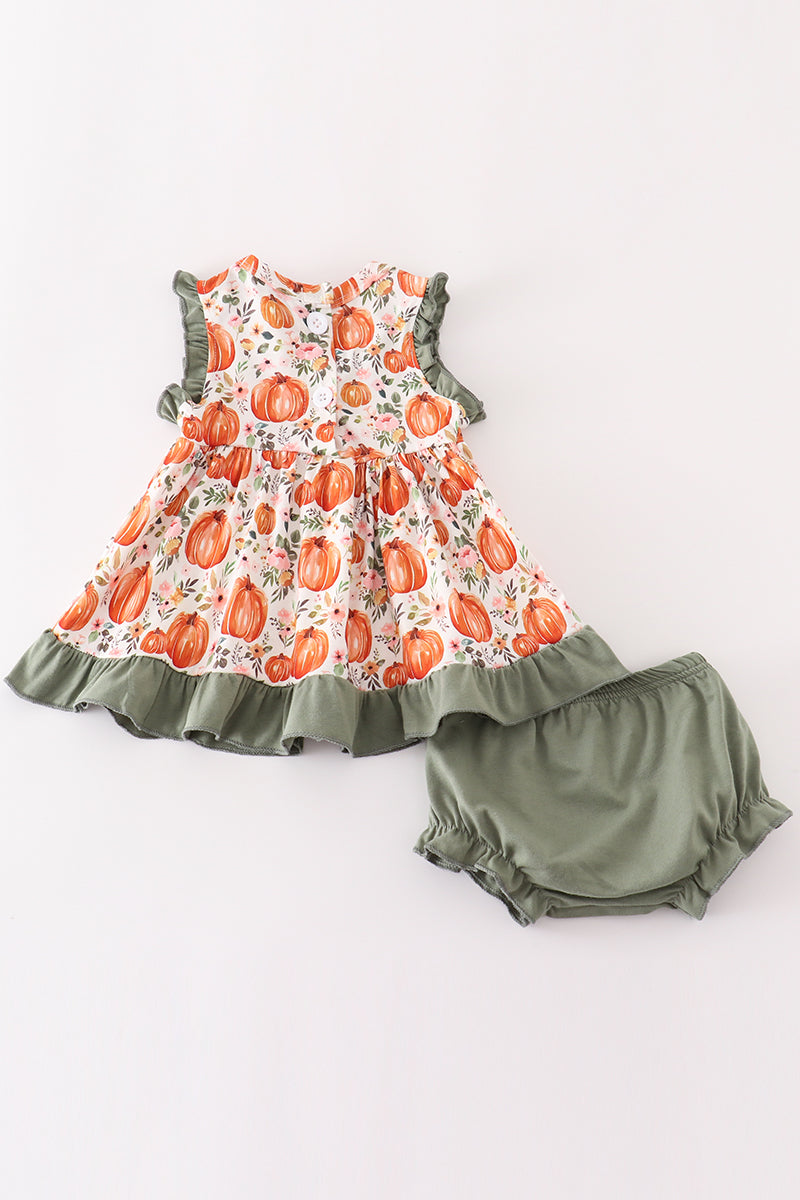Add some fall fun to your baby's wardrobe with our Green Pumpkin Ruffle Baby Set. This adorable set features ruffled details and a playful pumpkin design, perfect for autumn photo ops. Made with soft and comfortable fabric, your little one will look cute and feel cozy all season long.