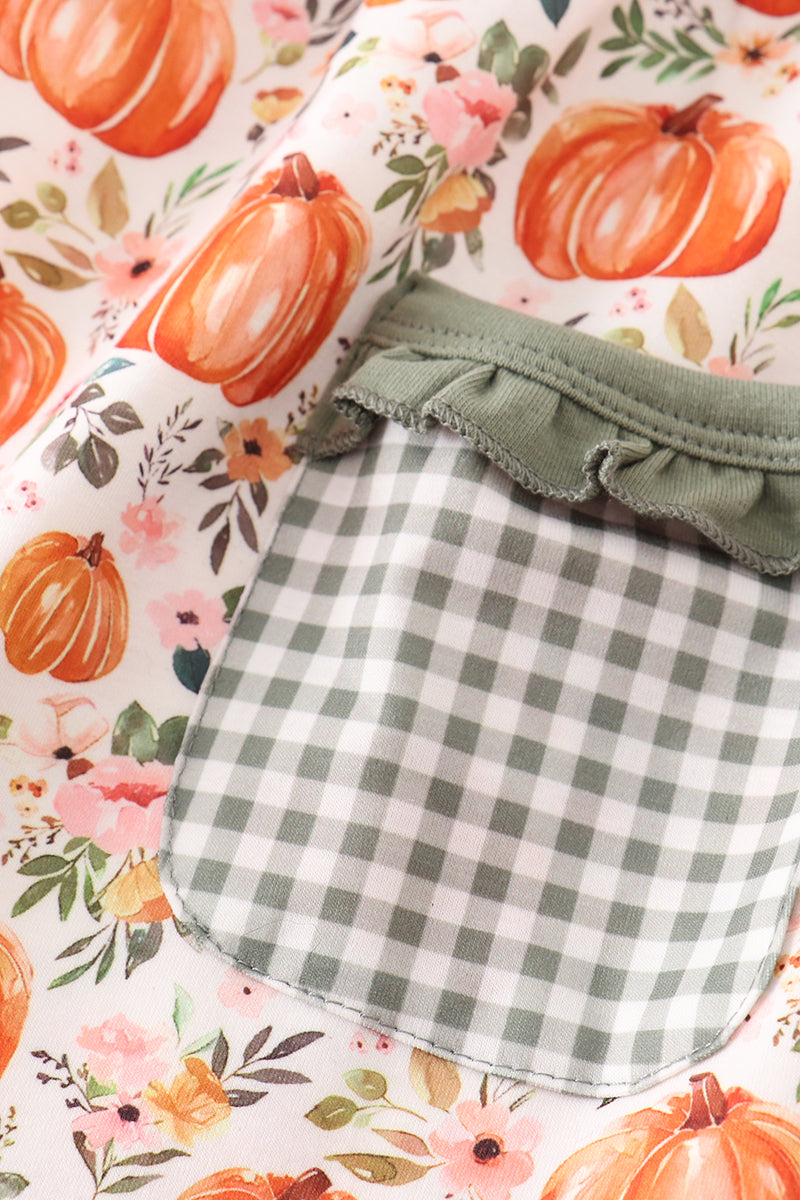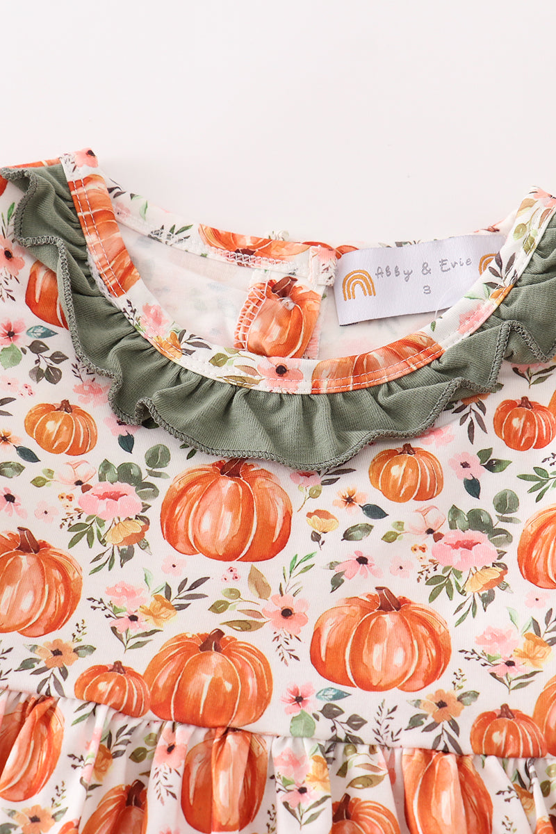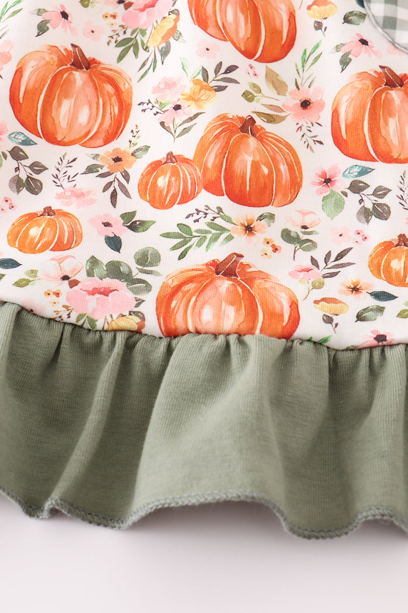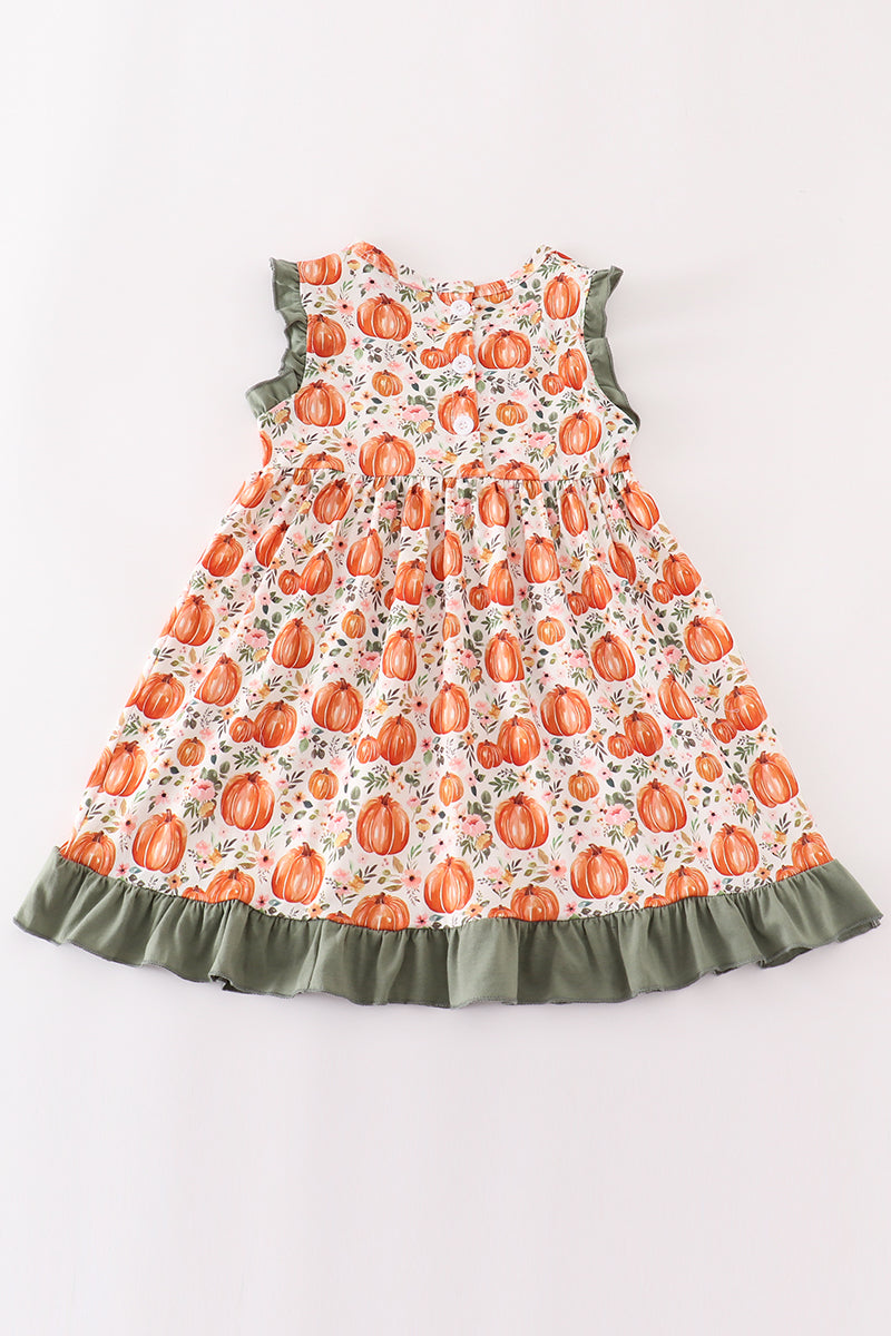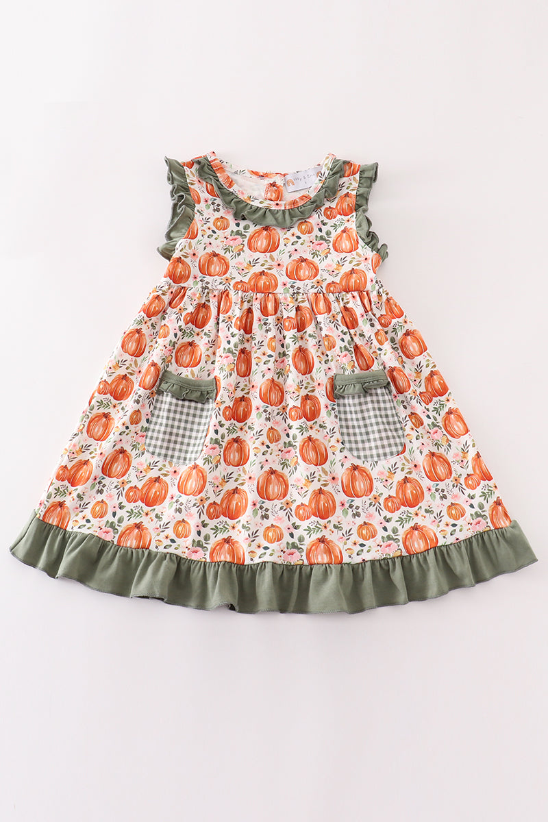 Add some playful style to your wardrobe with our Green pumpkin ruffle dress. Featuring a unique pumpkin print and flirty ruffle detailing, this dress is perfect for any occasion. You'll stand out in the crowd and feel confident in this quirky and fun dress. (Pumpkin spice not included!)
