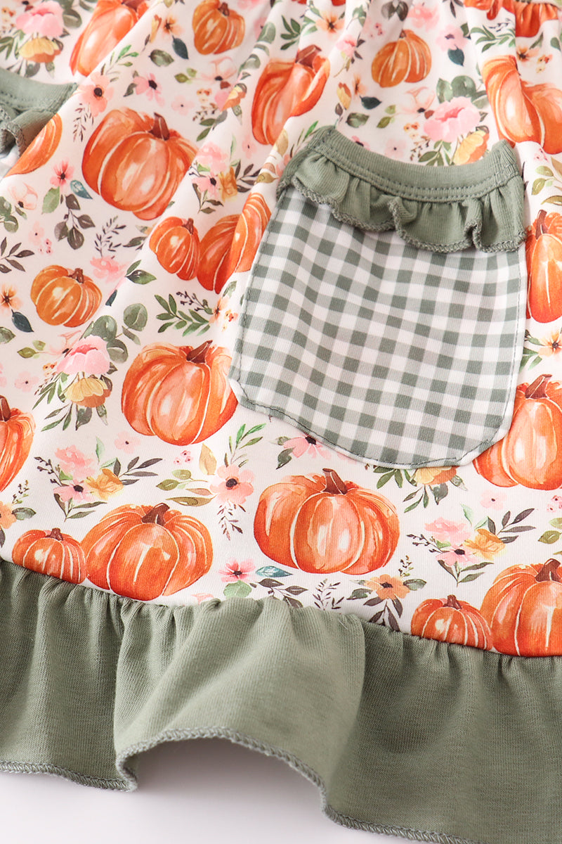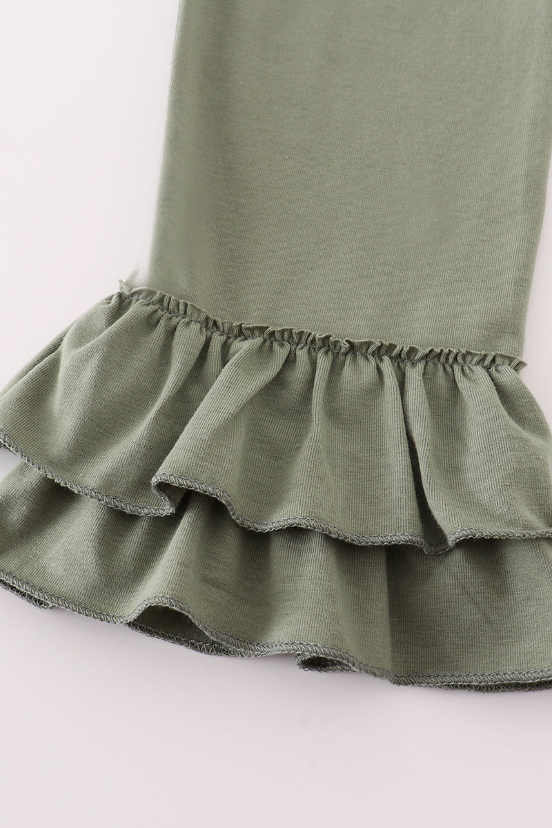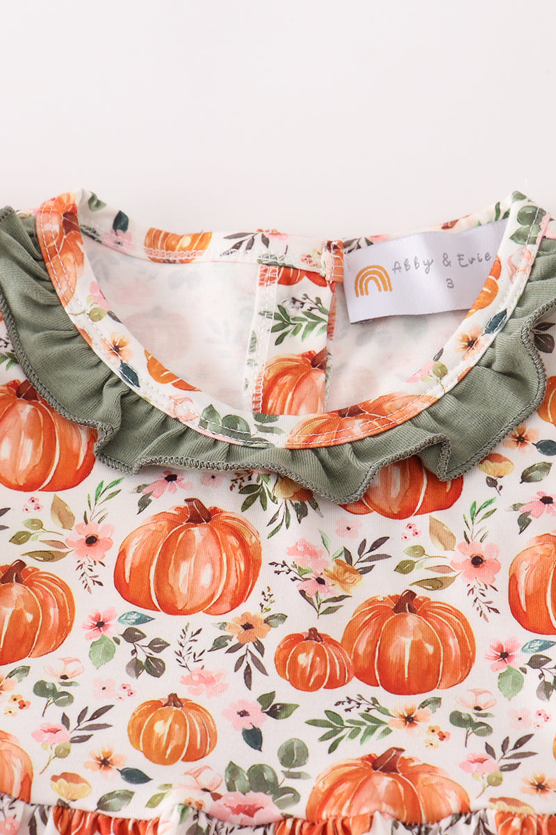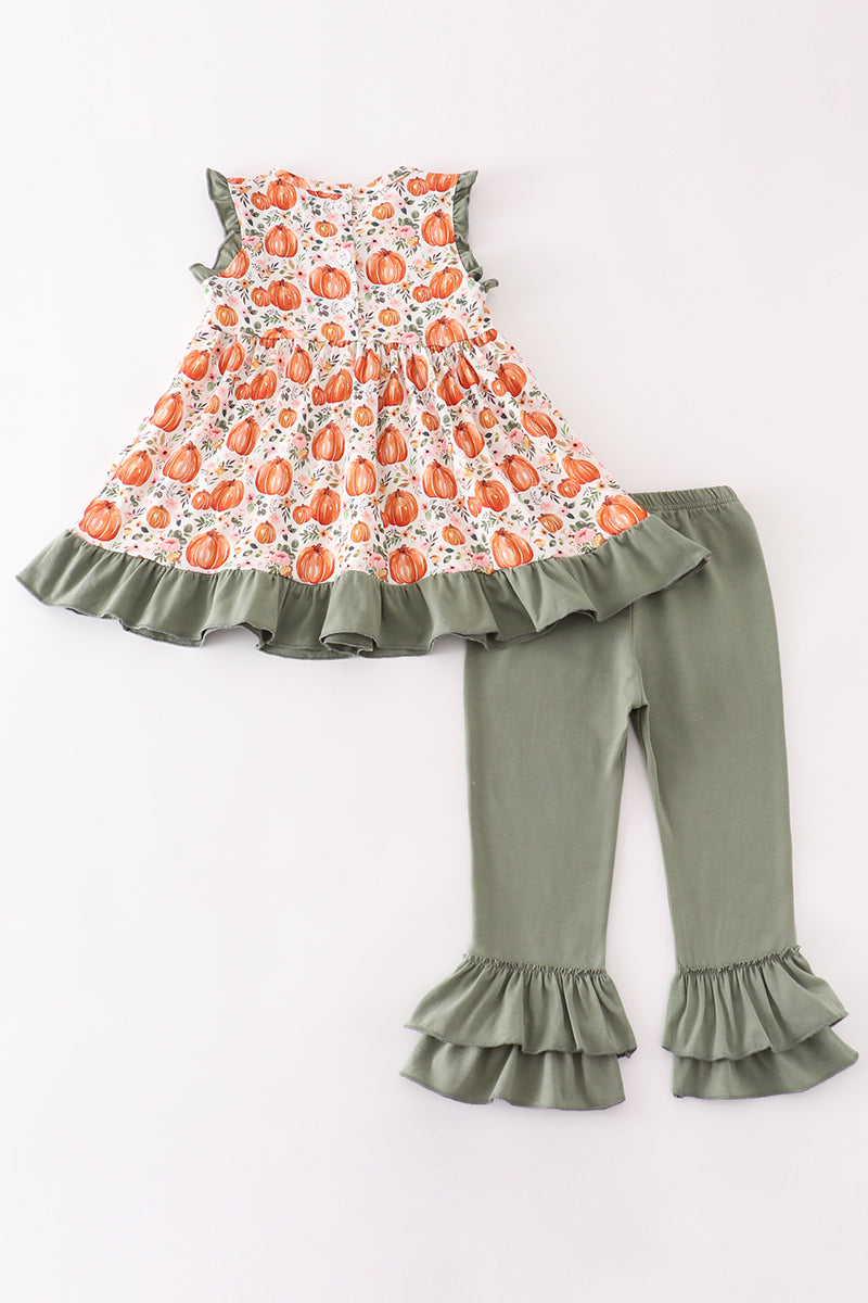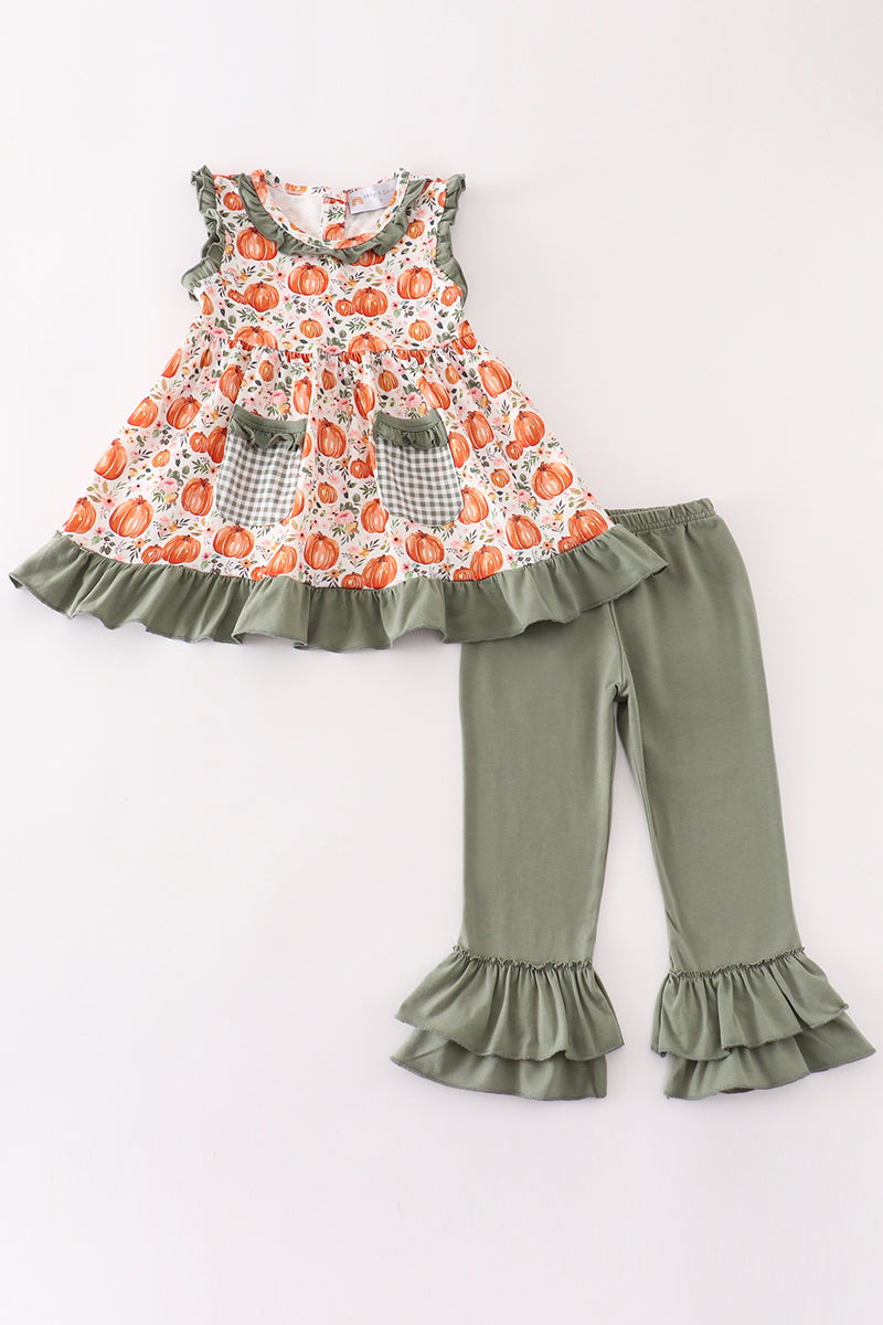 Get ready for fall with our adorable green pumpkin ruffle girl set! With its unique color and playful pumpkin design, this set is perfect for your little one's wardrobe. Stay stylish and comfortable with this must-have set!