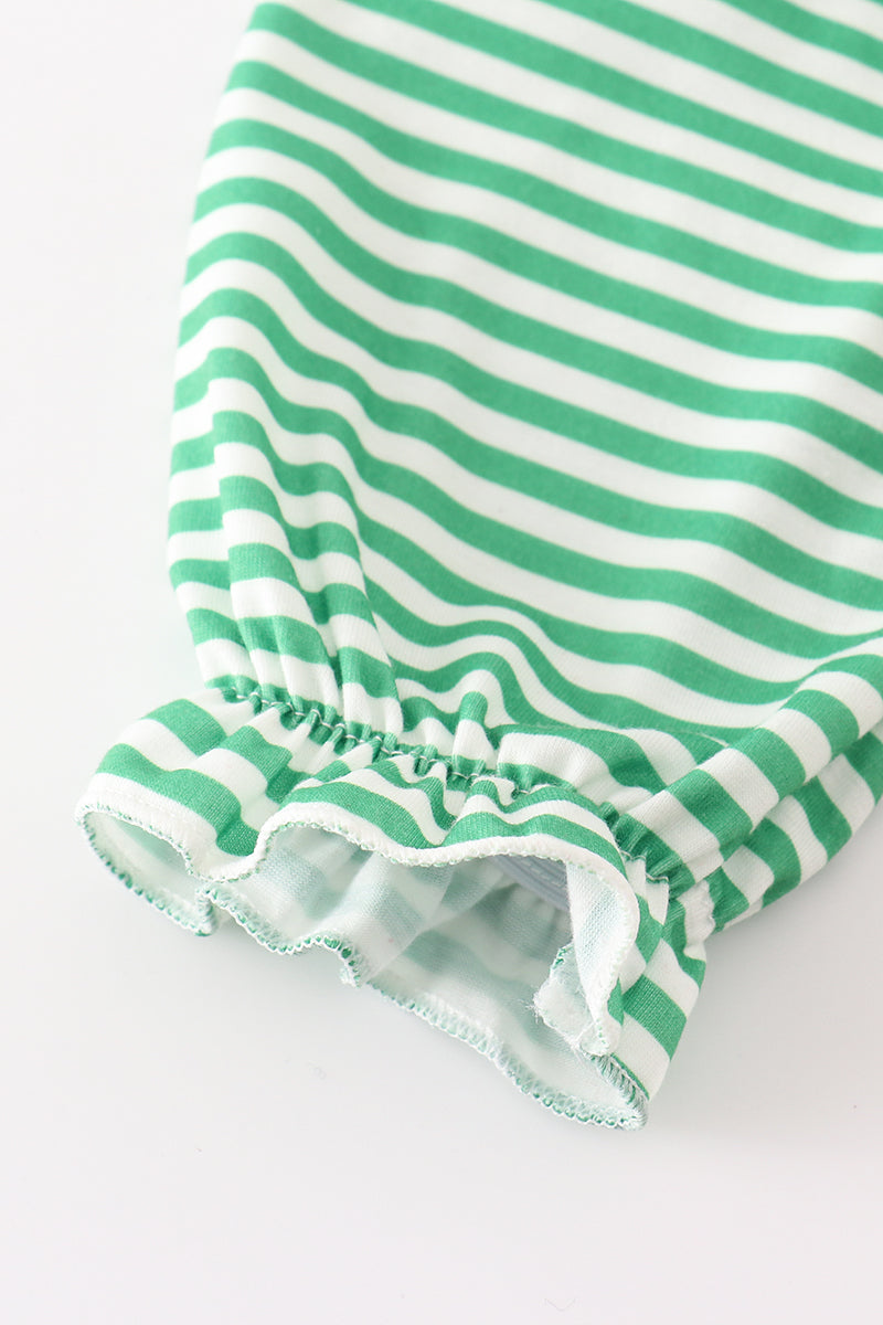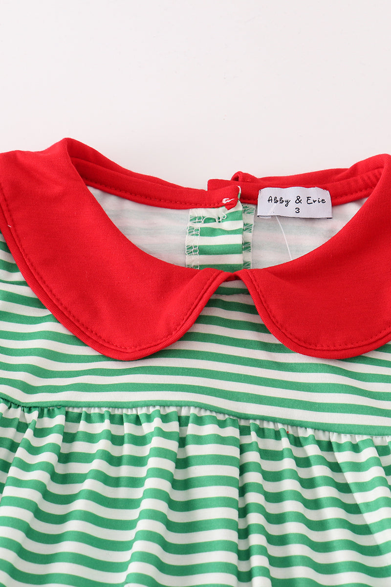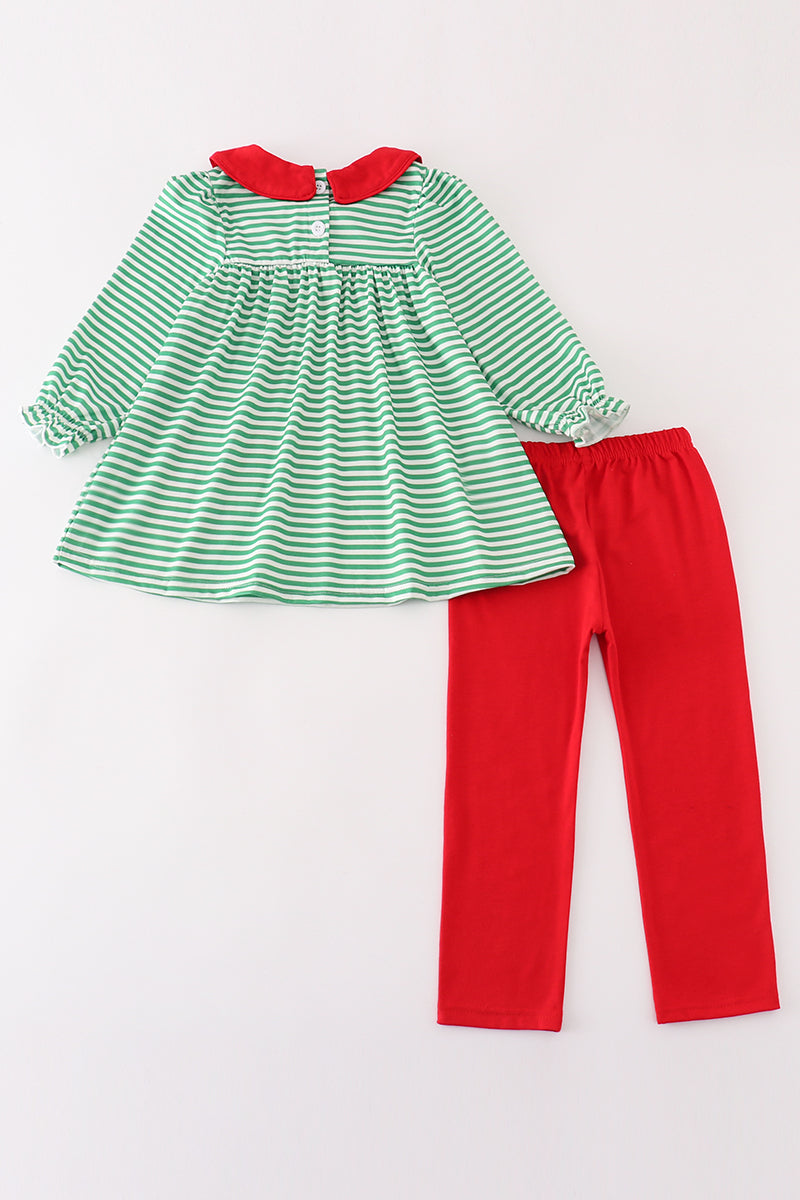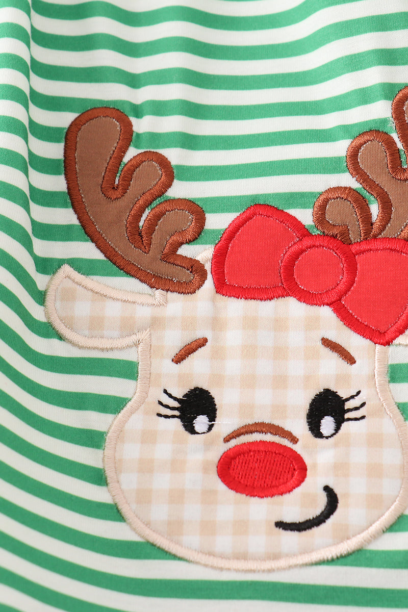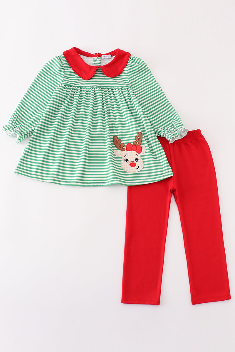 This two-piece set adds a charming holiday touch to your little girl's wardrobe. The green stripes and festive deer applique make for a quirky and playful look. Perfect for holiday photos or family gatherings.