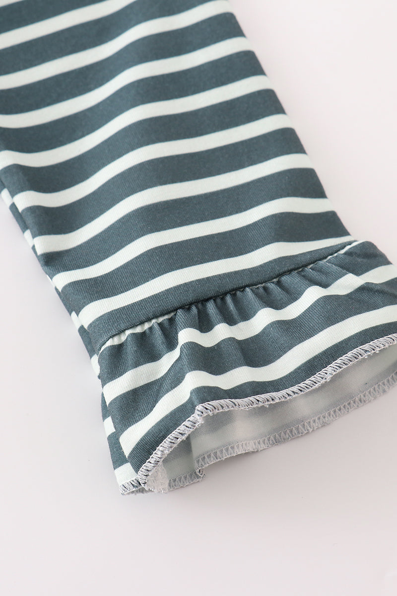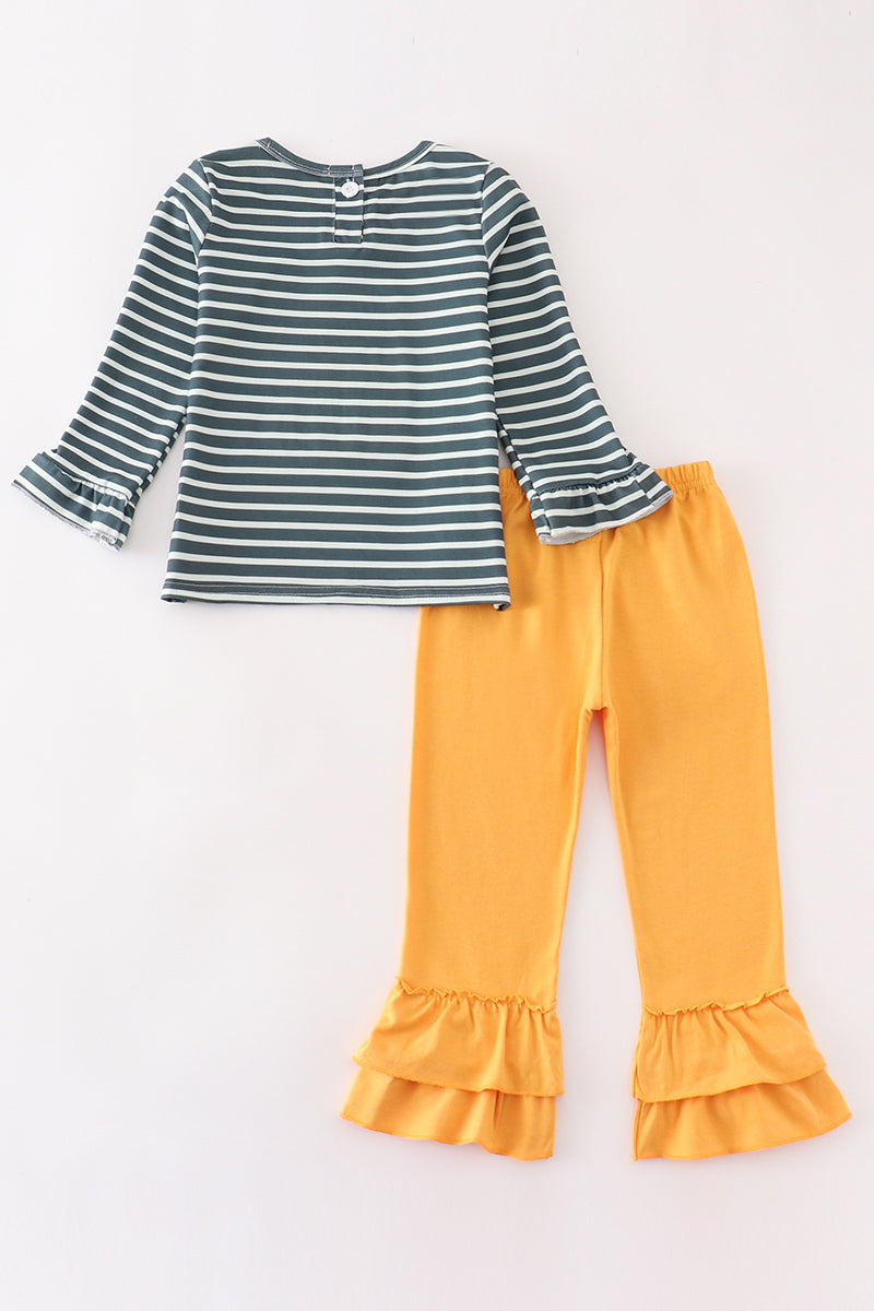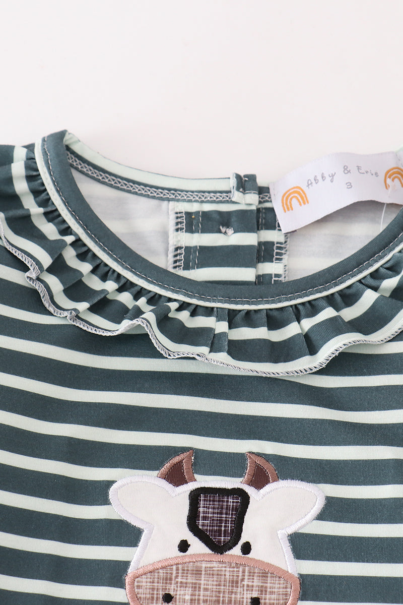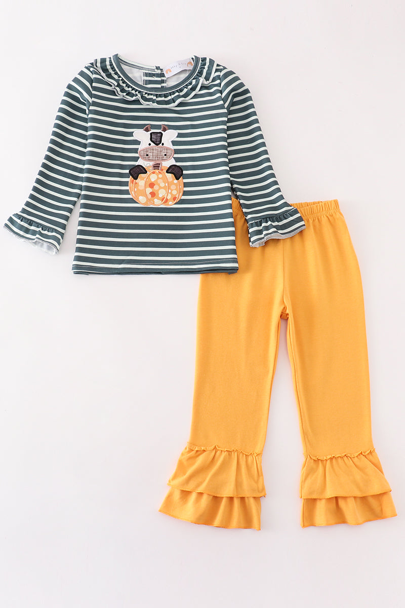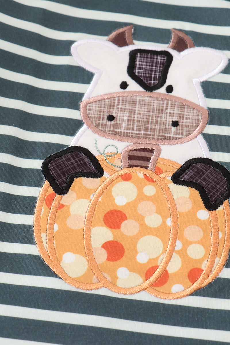 Get ready to milk all the fun out of fall with our Green Stripe Cow Pumpkin Applique Girl Set! This adorable set features a playful cow design on a green striped top and a pumpkin applique on the bottoms. Perfect for your little pumpkin's autumn adventures. (Moos and gourds not included.)