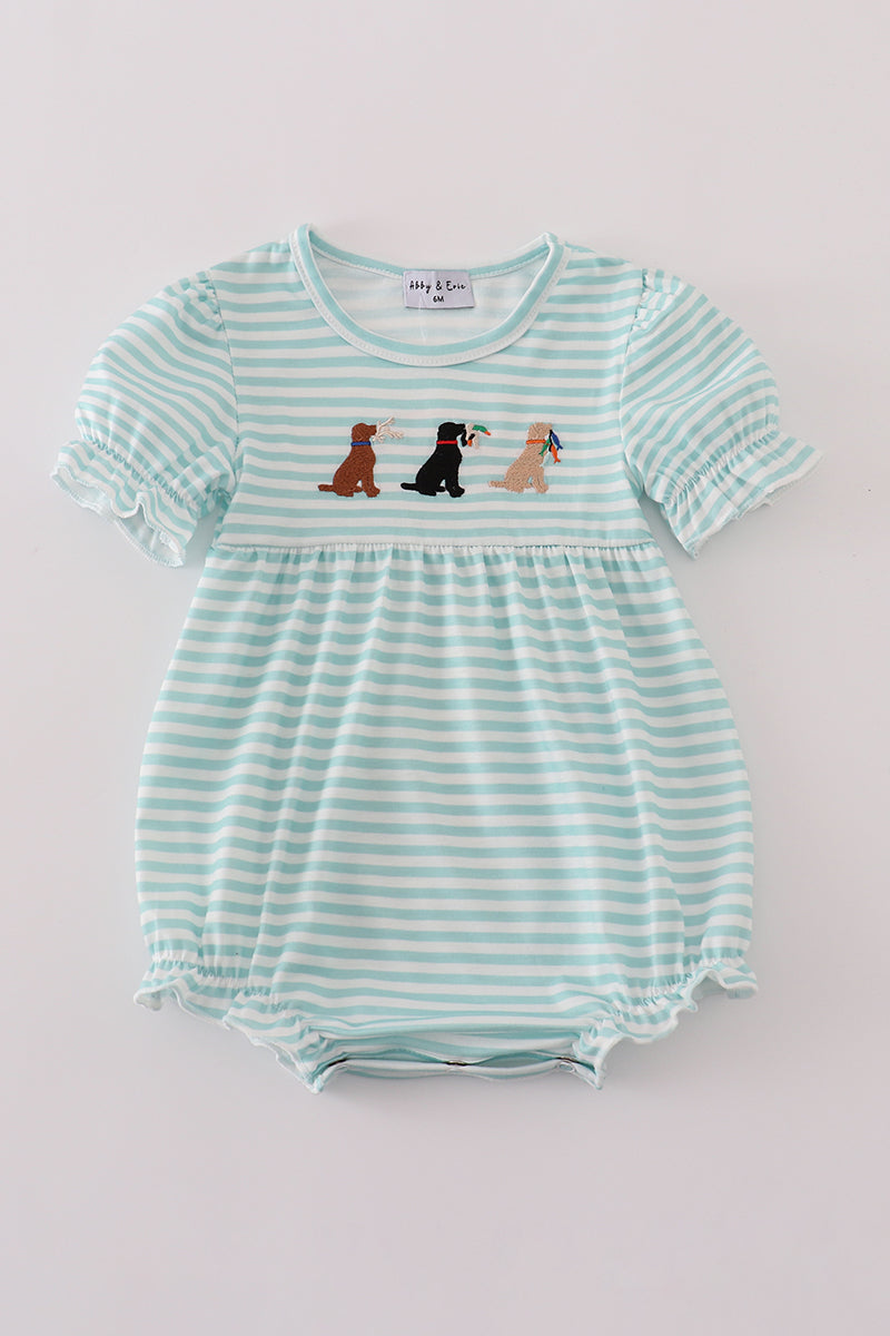Dress your little one in this adorable green striped bubble outfit featuring charming puppy hunting embroidery! Perfect for playdates or special occasions, this playful ensemble combines comfort with whimsical style. The bubble silhouette keeps your child looking cute while allowing plenty of wiggle room for all their adventures!
