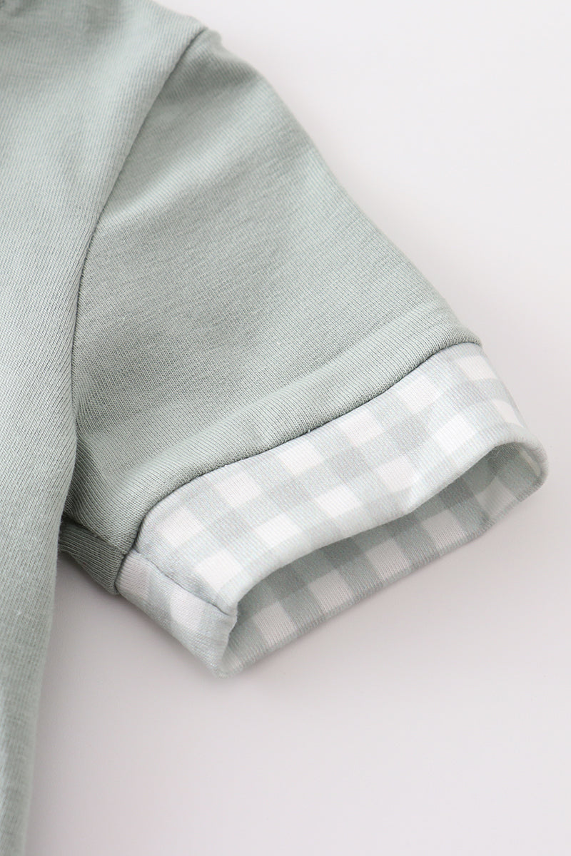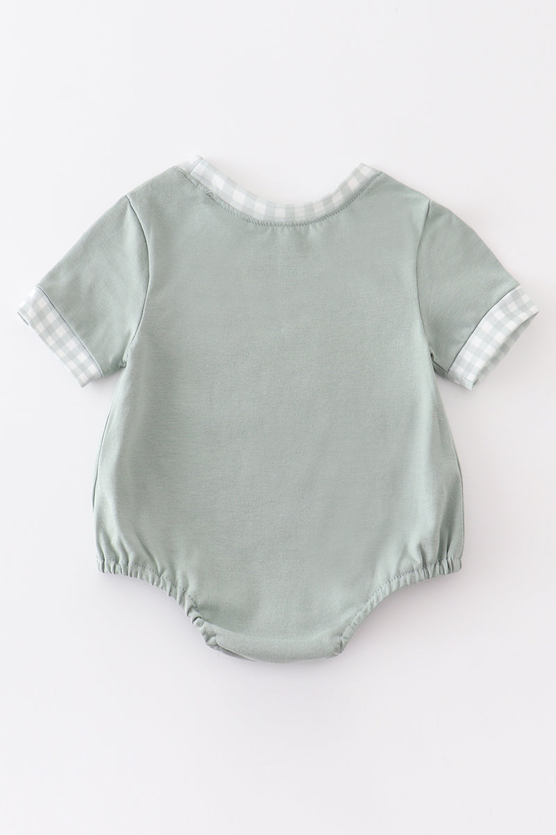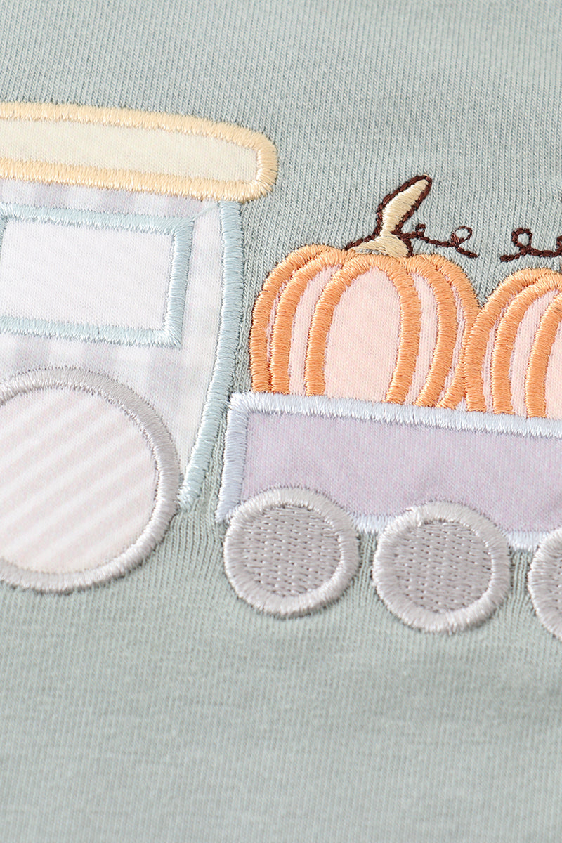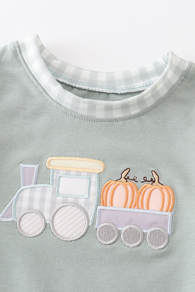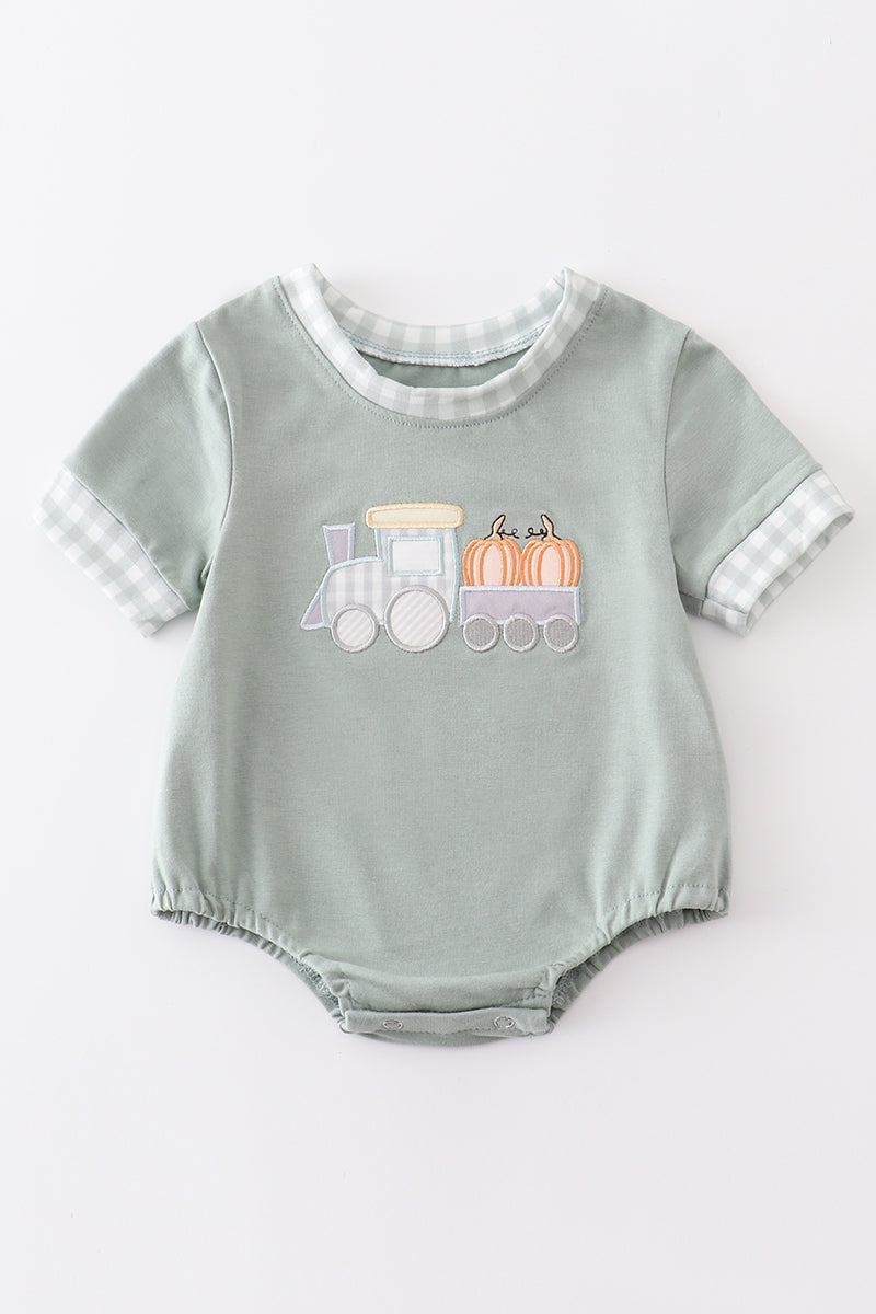Make your little train enthusiast look extra dapper in this Green Train Pumpkin Applique Boy Bubble! This unbelievably cute bubble is the perfect way to bring joy to your kid's wardrobe! This special little gem is sure to delight with its charming applique, so hop on board and let your little cutie ride in style!