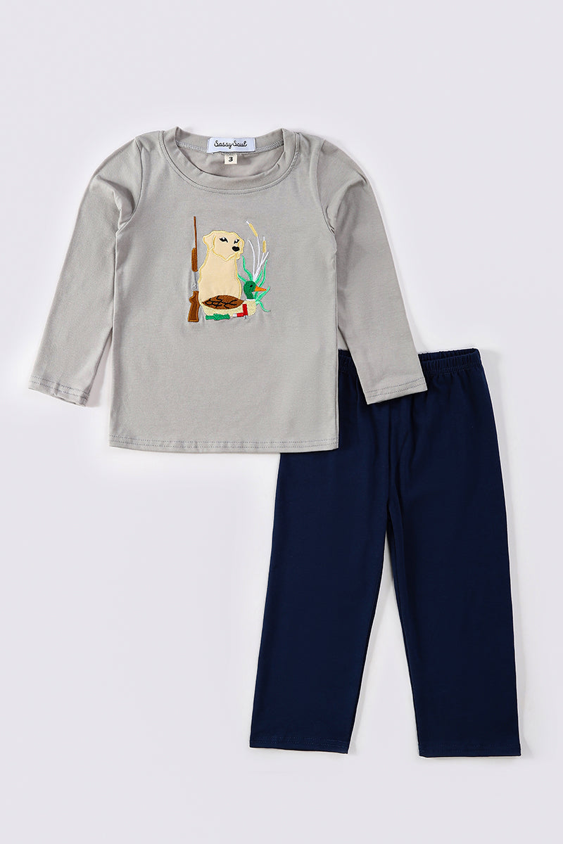 Get your little one ready for adventure with our Grey Hunting Applique Boy Set. This playful, yet practical set features a stylish grey design with a hunting-themed applique. Perfect for any little explorer, this set is sure to add some fun to their wardrobe.