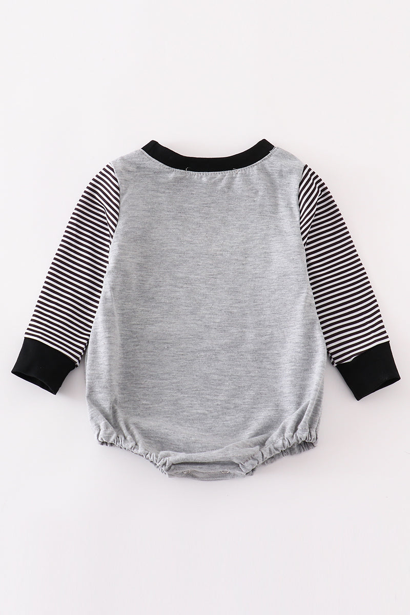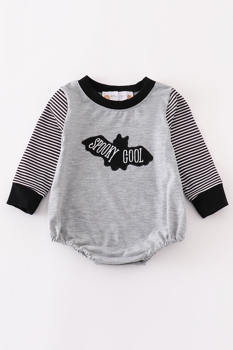 Get your little man ready for Halloween with our Grey Stripe Halloween Spooky Cool Boy Bubble! This playful and stylish outfit features a grey stripe design that is perfect for the spooky season. Dress your little one in this cool and comfy bubble for a fun and festive look.
