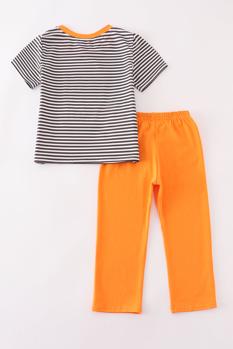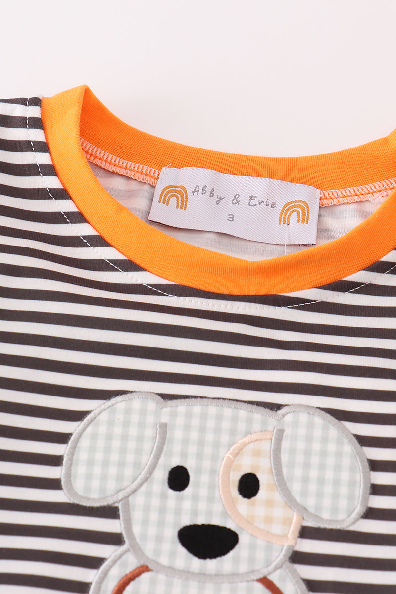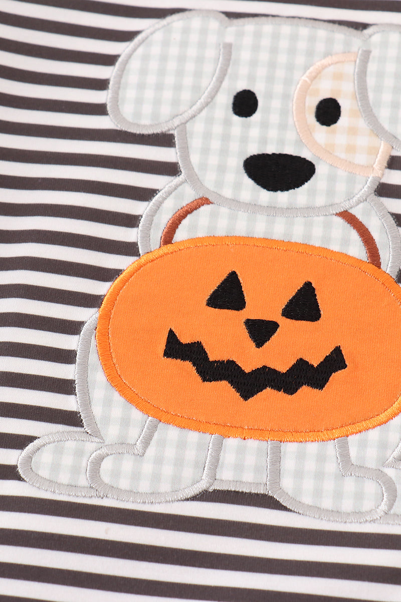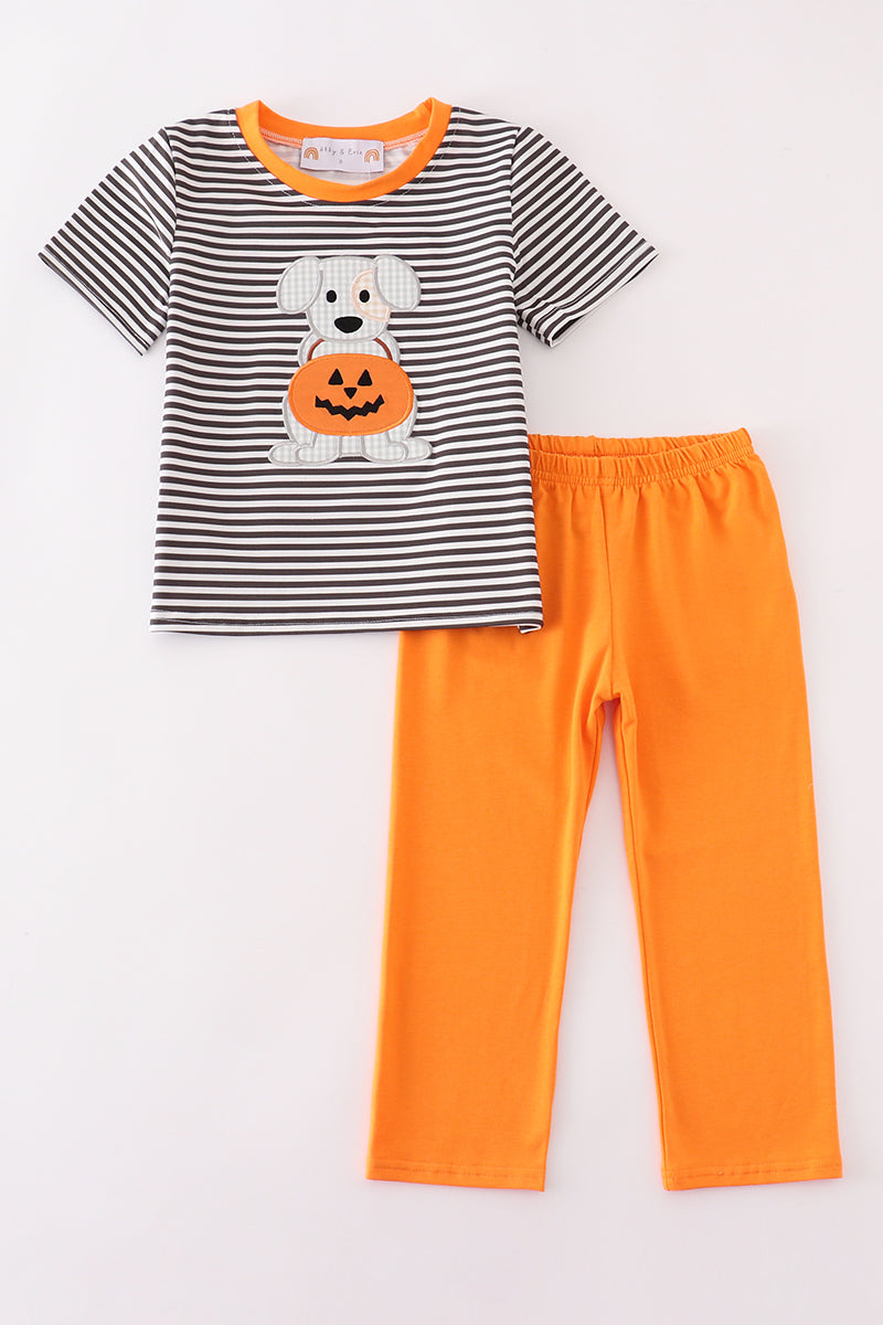 Get your little one ready for Halloween with this adorable pumpkin puppy stripe applique set! This set features a festive Halloween pumpkin design and playful stripe pattern, making it the perfect outfit for trick-or-treating. Made with soft, comfortable material for all-day wear.