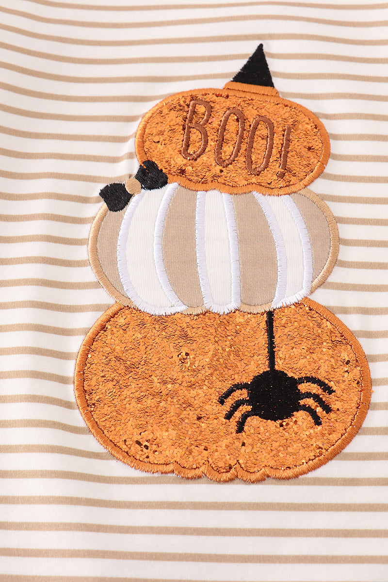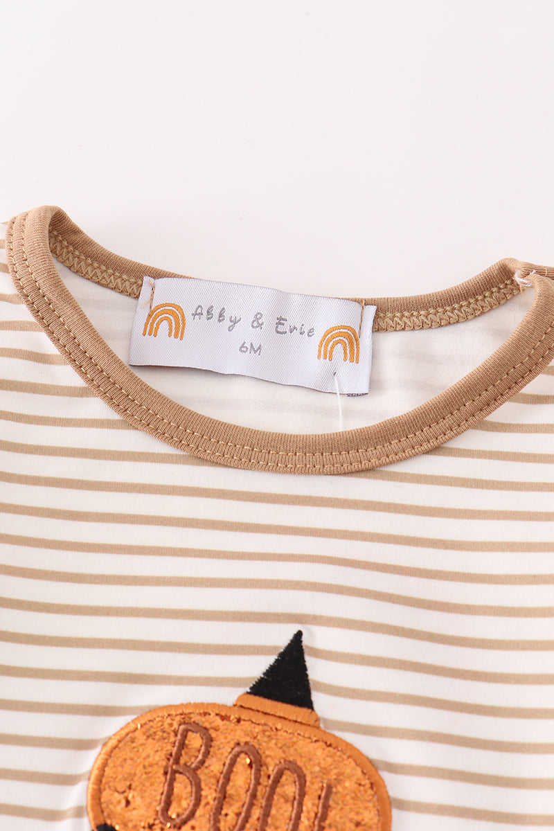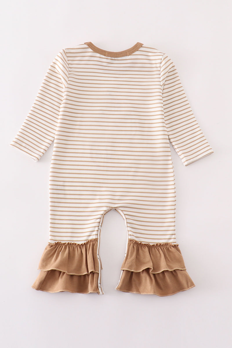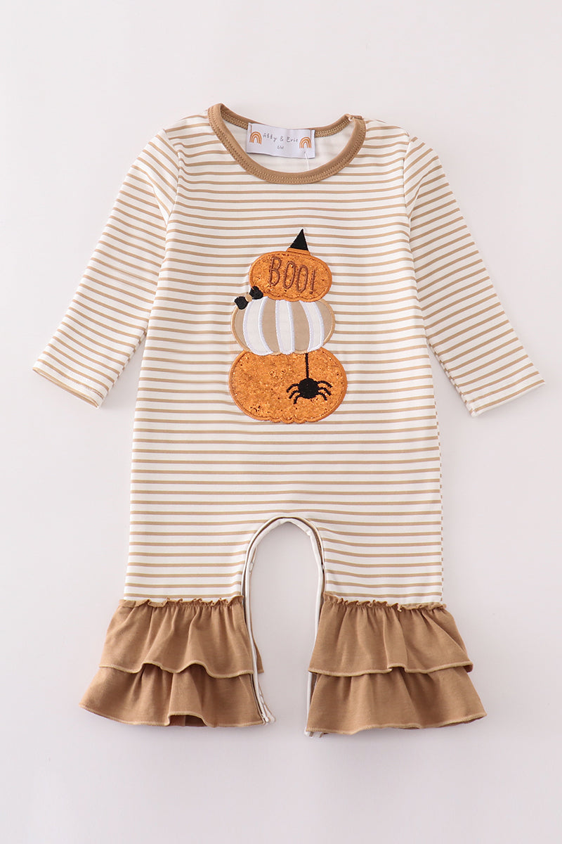 Get ready for fall in style with our Khaki Stripe Pumpkin Glitter Girl Romper! This adorable romper features a fun pumpkin glitter design and a trendy khaki stripe pattern. Perfect for playdates or parties, it's guaranteed to make your little one stand out.