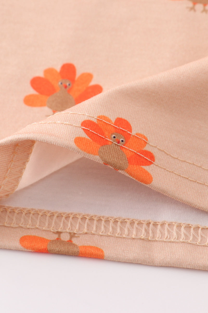 Get ready for a gobble good time with these Khaki turkey print girl pajamas set. Comfortable pajamas featuring a playful turkey print in a stylish Khaki color. Perfect for cozy nights and imaginary Thanksgiving feasts. Let your little one show off their unique style with this fun and quirky sleepwear set.