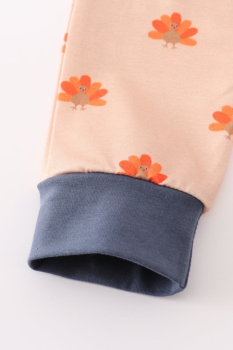 Gobble up the compliments with this adorable Khaki Turkey Print Zip Boy Romper. Easy on and off with a zip feature, this romper features a playful khaki turkey print, making it perfect for Thanksgiving or any day your little one is feeling festive.