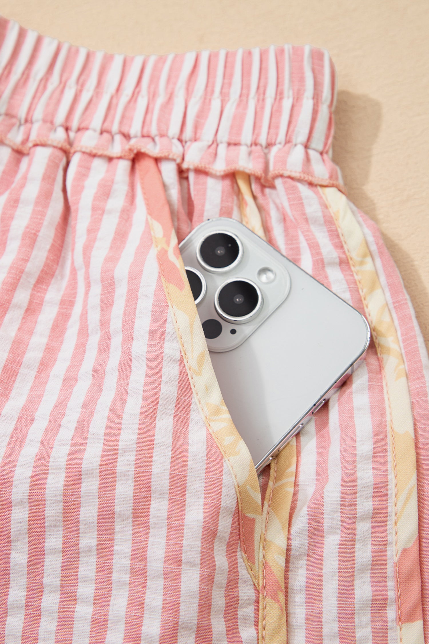 Light Pink Floral Trim Ribbon Knot Striped Casual Shorts