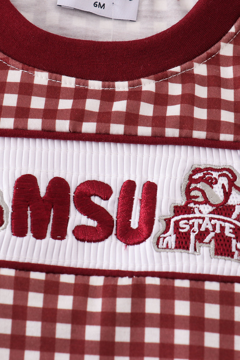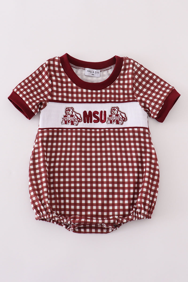 Get ready to show off your Mississippi pride with this adorable MSU embroidery smocked gingham bubble! Perfect for game days or just lounging around, this bubble features a playful smocked design, trendy gingham print, and detailed Mississippi MSU embroidery. Go Bulldogs!