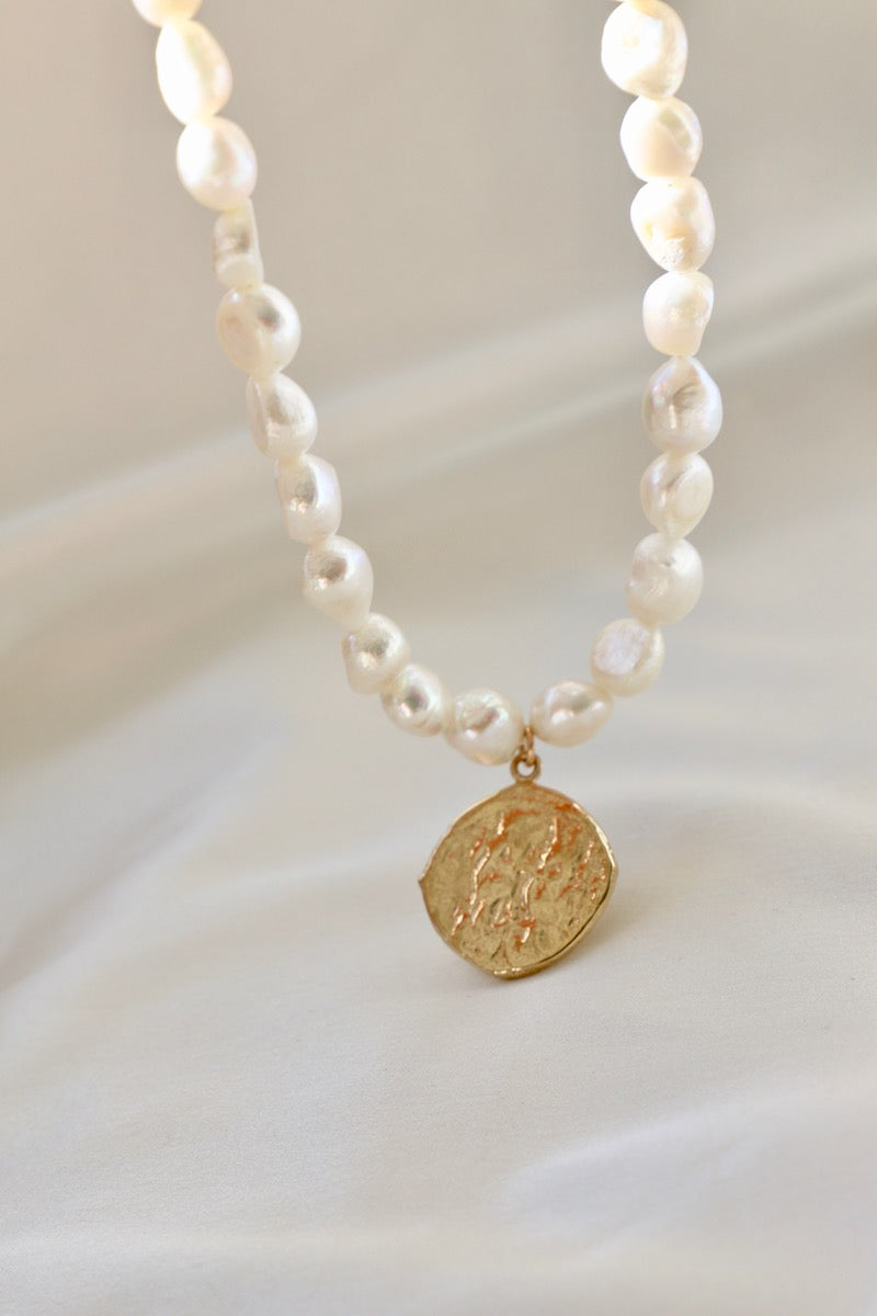 The Modena Pearl Necklace is a classic statement piece made of hand picked pearls and a large vintage coin replica. It's a great option for dressing up, but don't be afraid to wear this casually with your favorite tee.