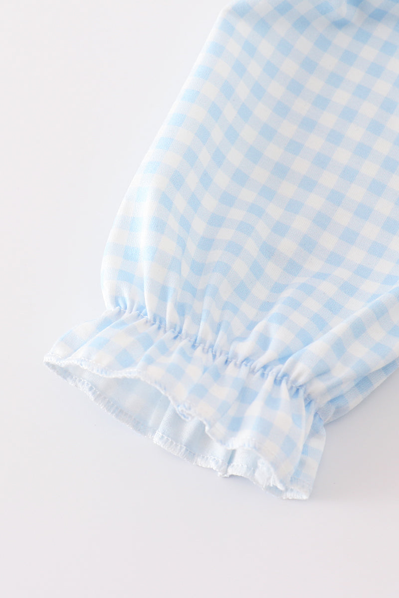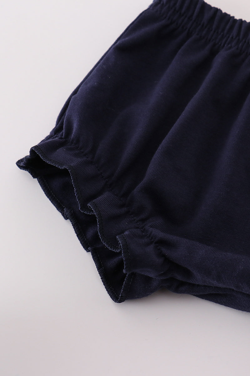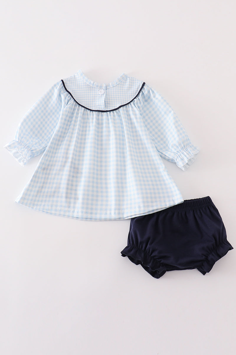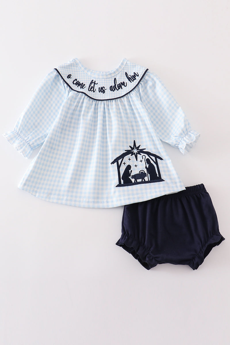 Navy nativity embroidery gingham girl bloomer set