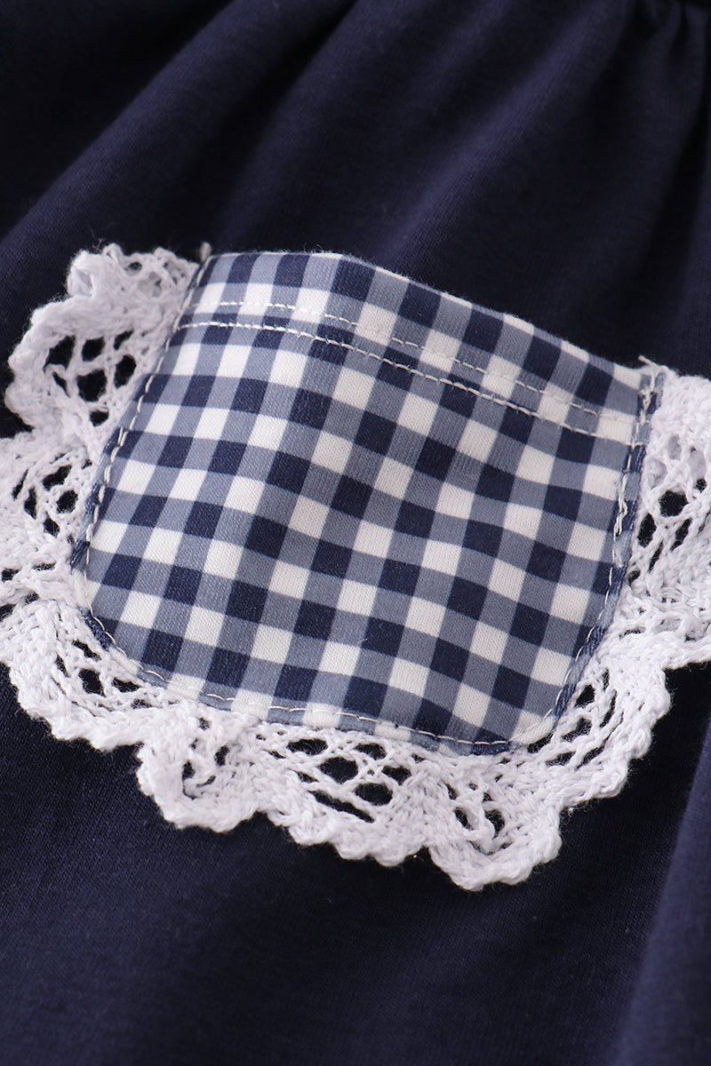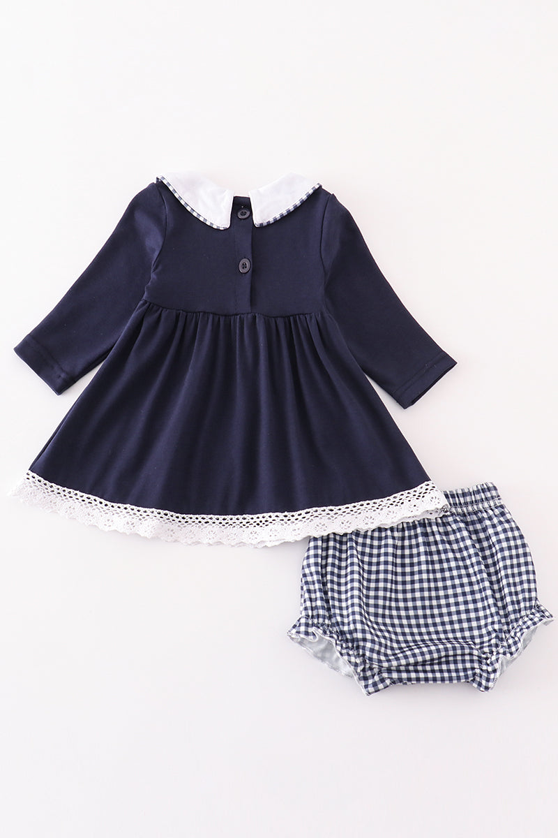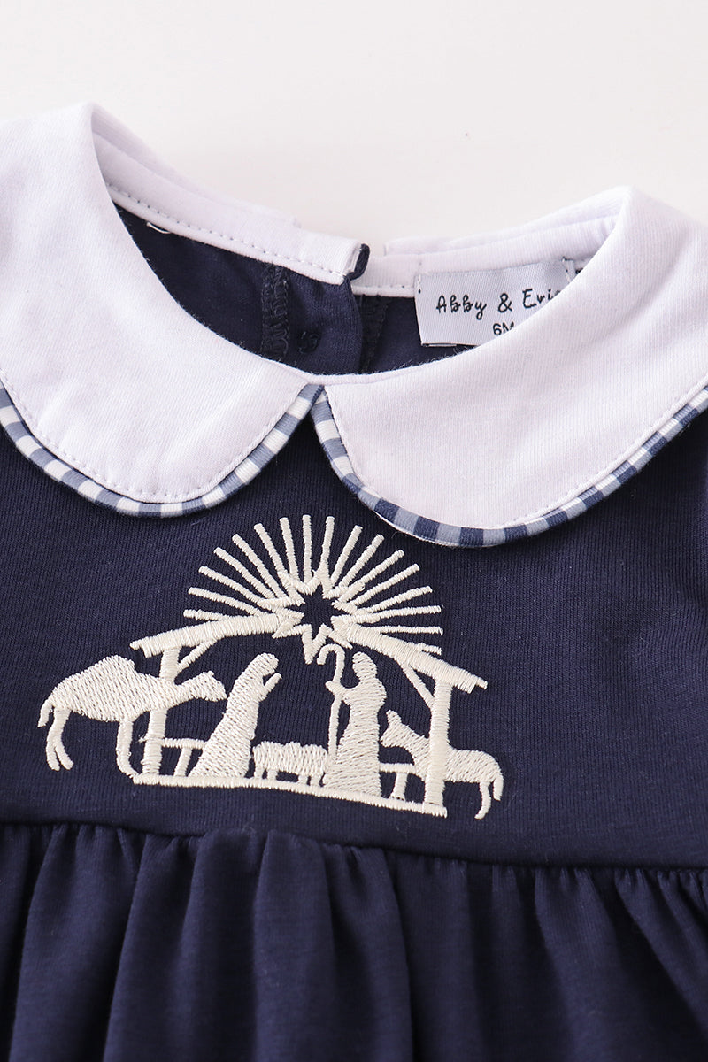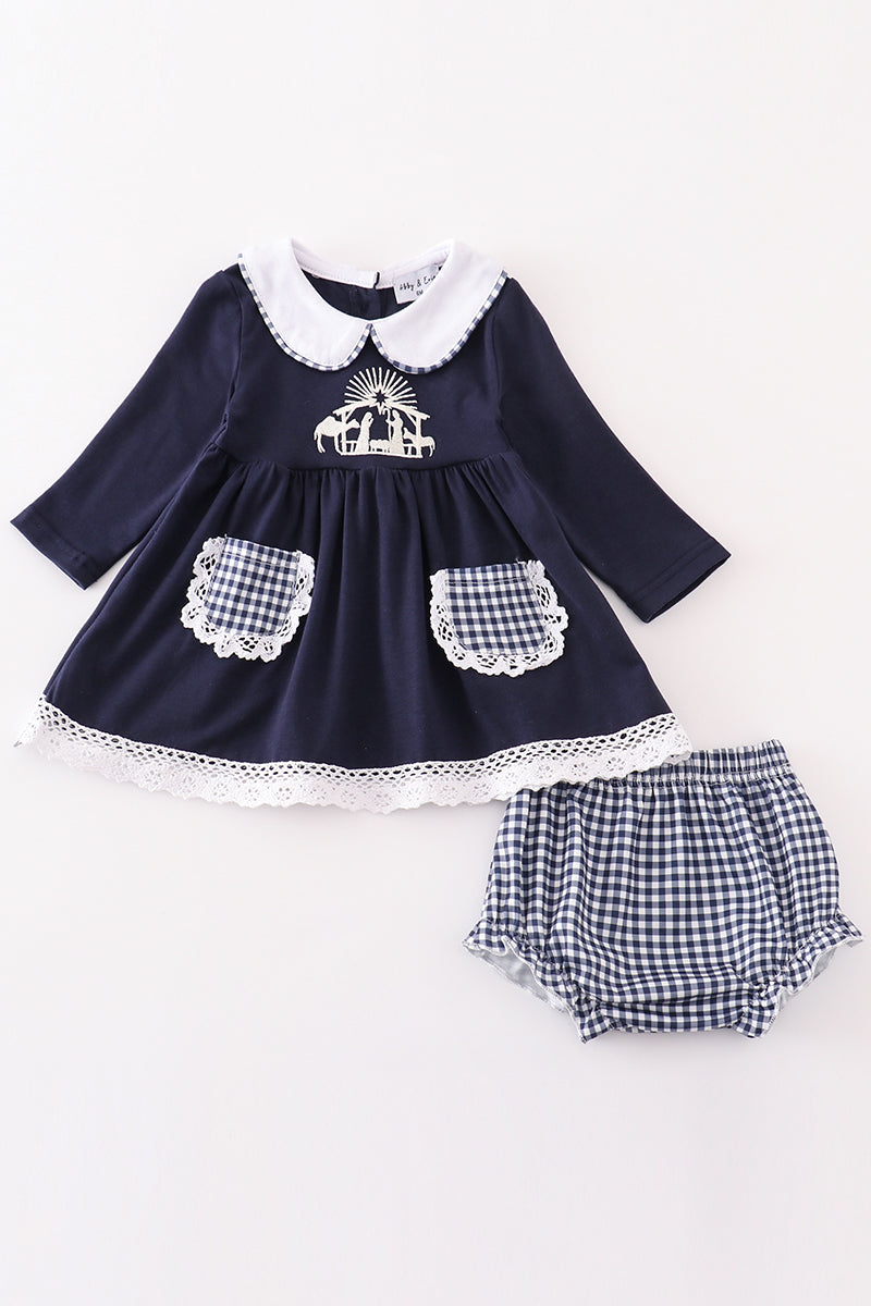 Get ready for the holidays with this cute and quirky navy nativity embroidery gingham girl bloomers set. Featuring a festive nativity themed embroidery and a stylish gingham print, these bloomers will add a fun twist to your little girl's holiday outfit. Perfect for holiday photos and celebrations!