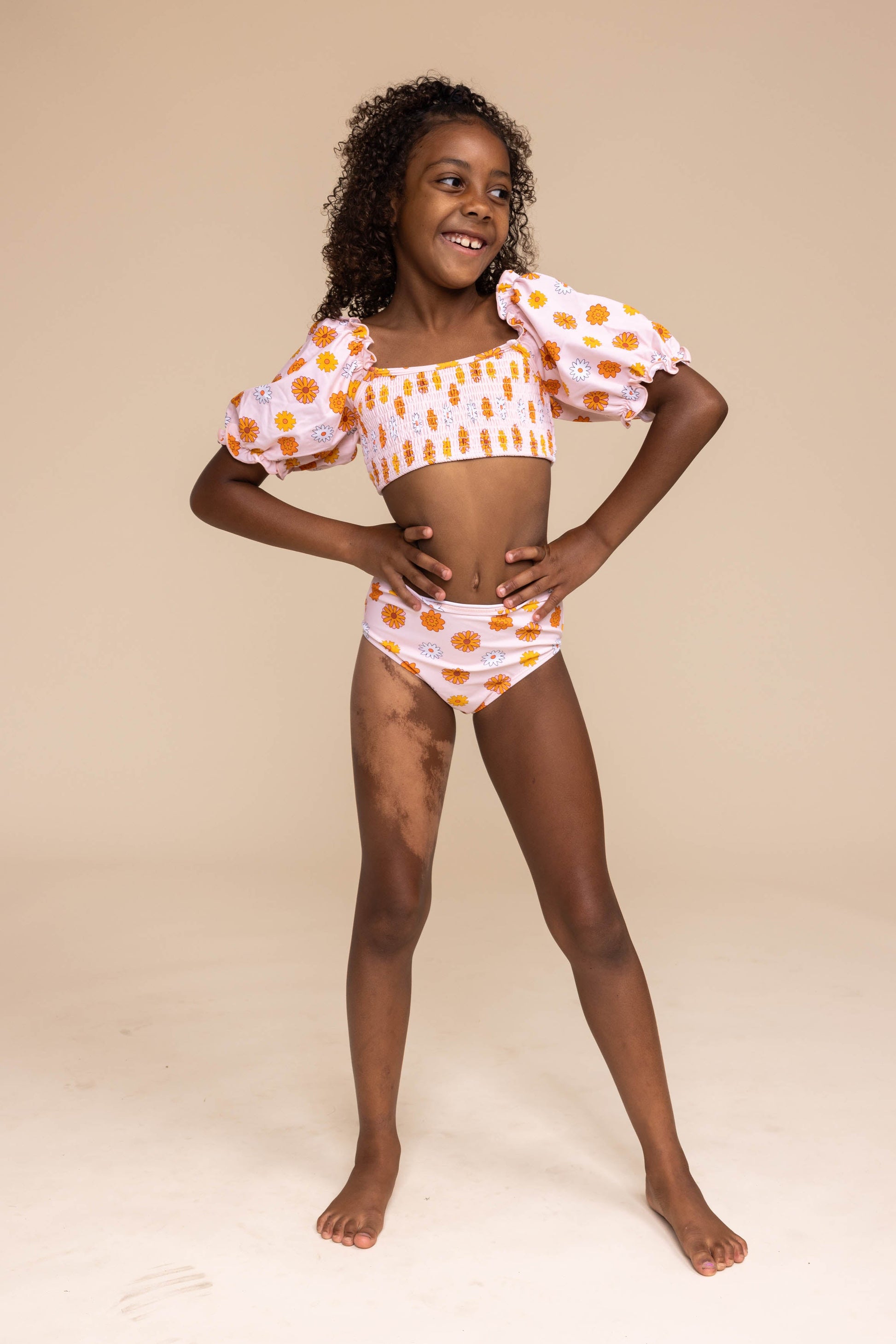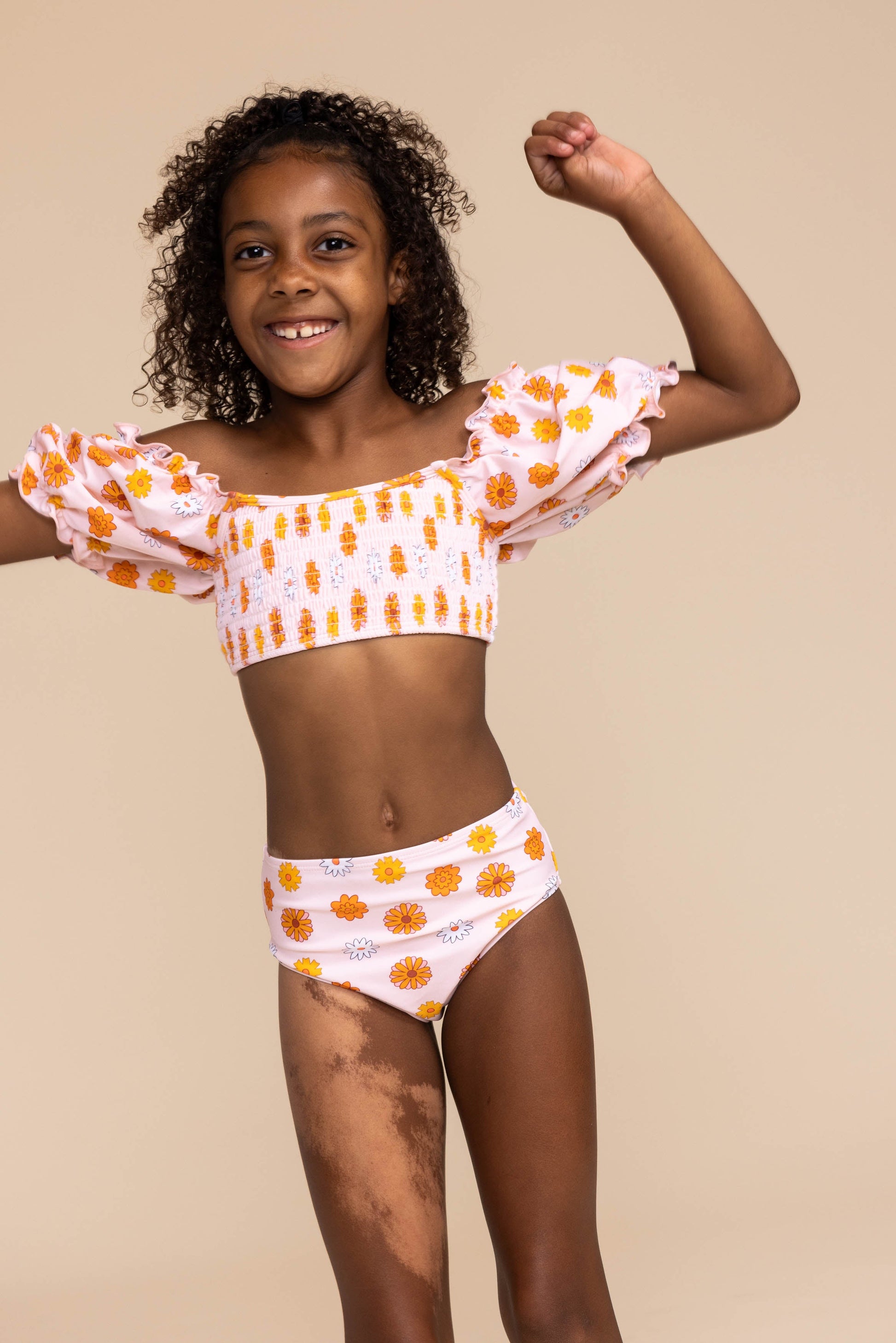 Orange floral print smocked 2pc girl swimsuit (size run small, go up 2-3 sizes)