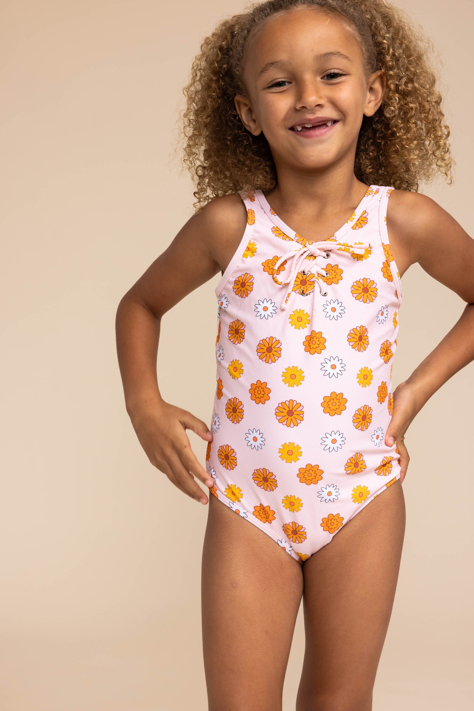 This bright and playful orange floral print tie one piece girl swimsuit is perfect for your little one's beach adventures! With its fun and eye-catching design, she'll stand out while staying comfortable and stylish. A must-have addition to her summer wardrobe!