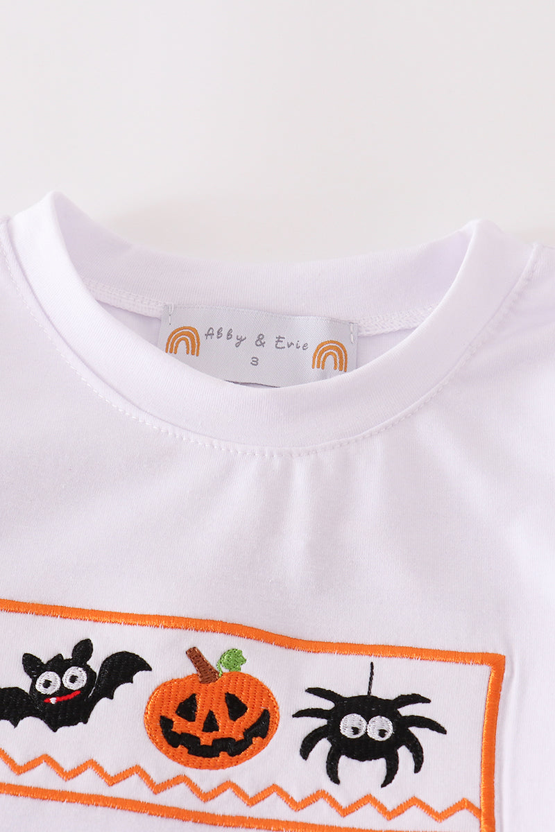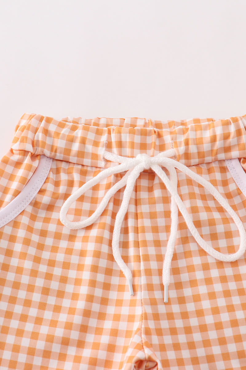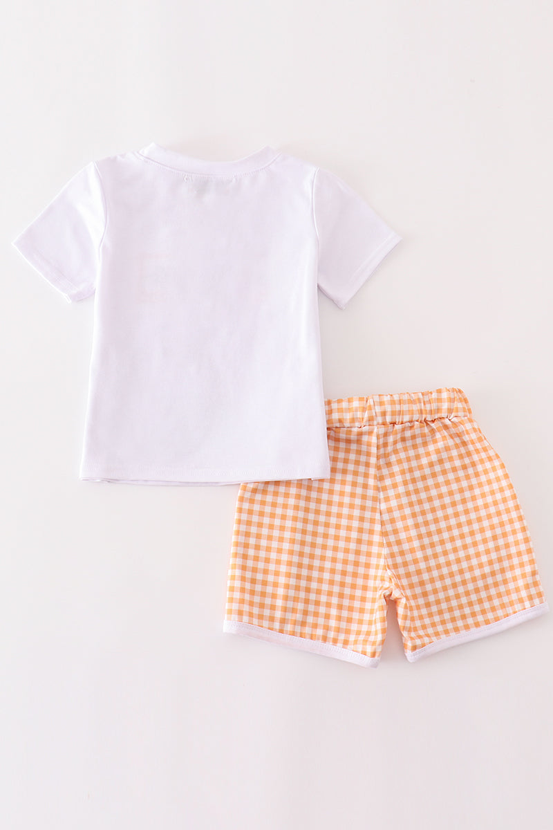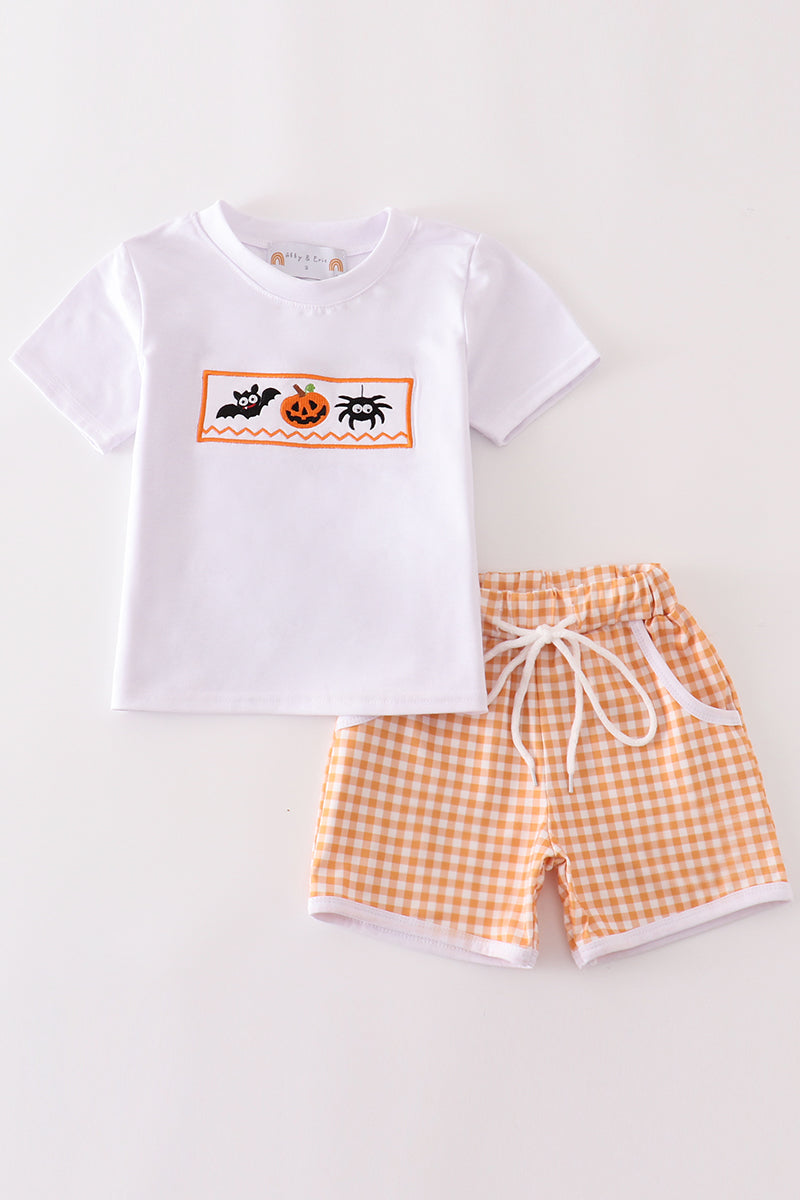 Get into the spooky spirit with this Orange Halloween Embroidery Plaid Boy Set. The vibrant color and playful detail will have your little one standing out in the crowd. Perfect for trick-or-treating or a fun costume party, this set is sure to bring a smile to their face (and yours)!