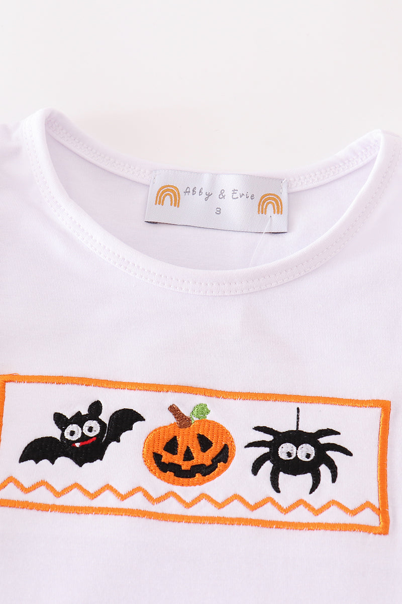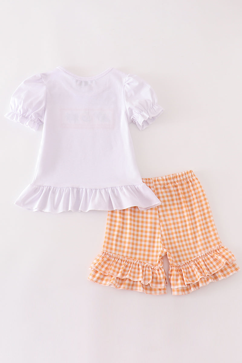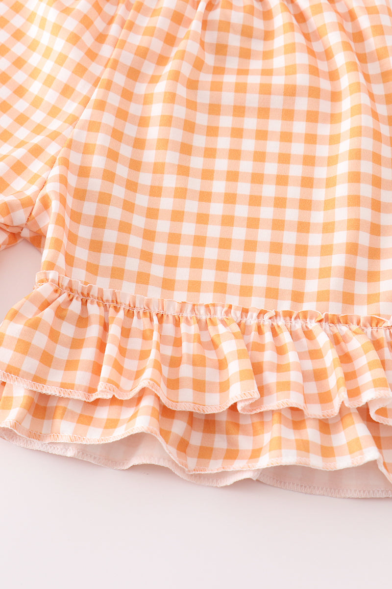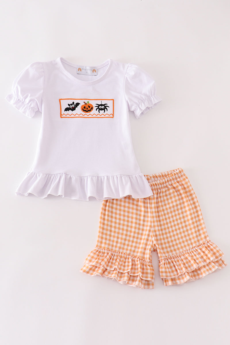 Get ready to spook up the season with our orange Halloween embroidery plaid girl set! Perfect for little ghouls and goblins, this set features festive embroidery and a playful plaid pattern. Trick or treat in style and stay comfortable all night long.
