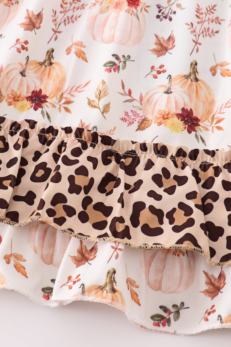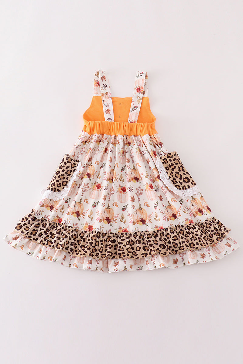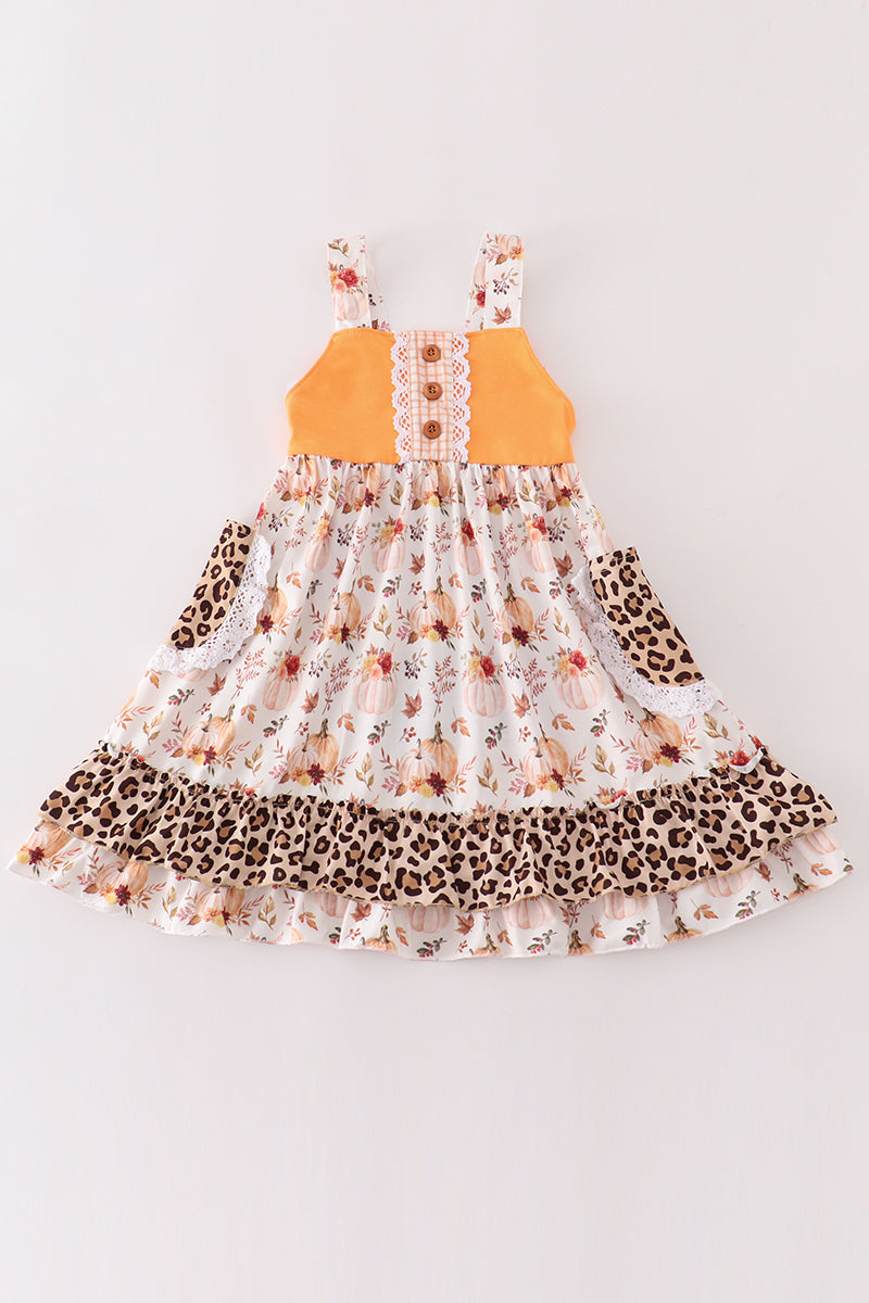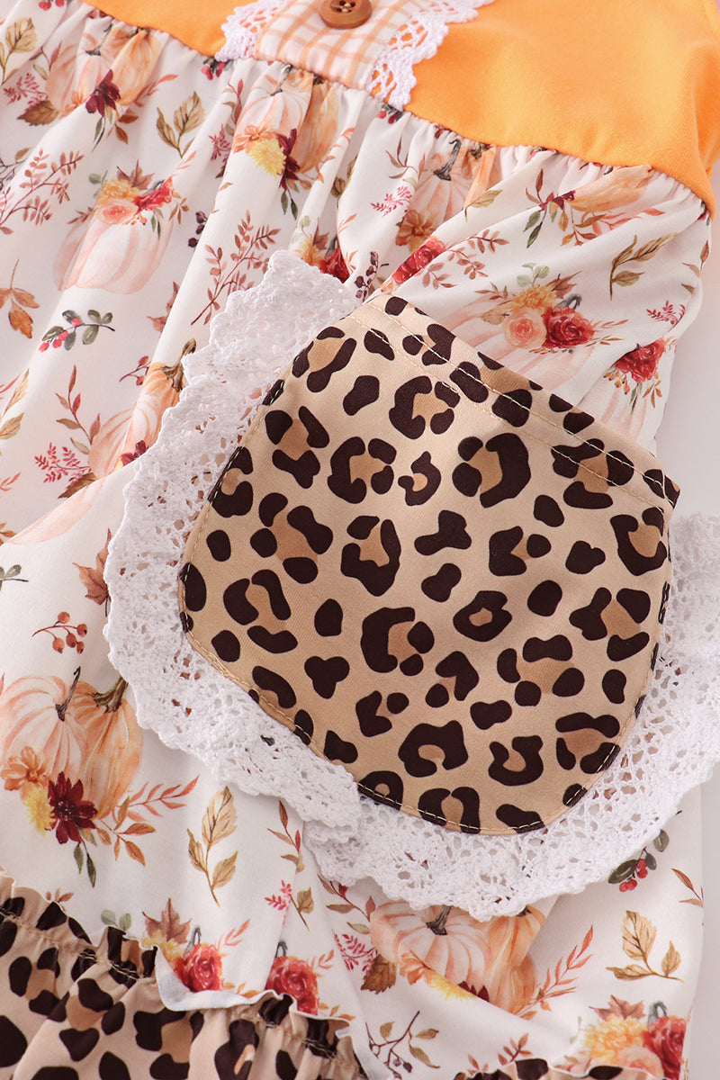 Add some whimsy to your wardrobe with our Orange Pumpkin Leopard Ruffle Dress! This charming dress features a bold orange color, playful pumpkin and leopard print, and stylish ruffle detailing. Perfect for those who love to stand out and have fun with fashion.