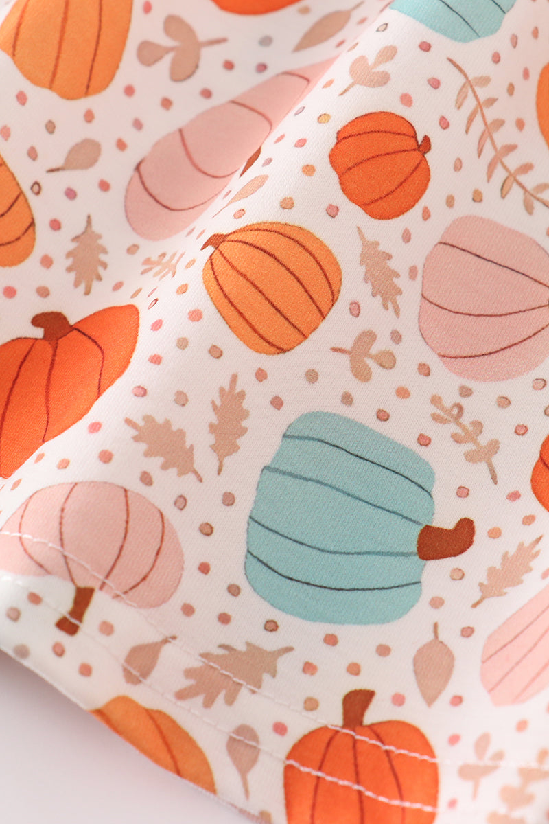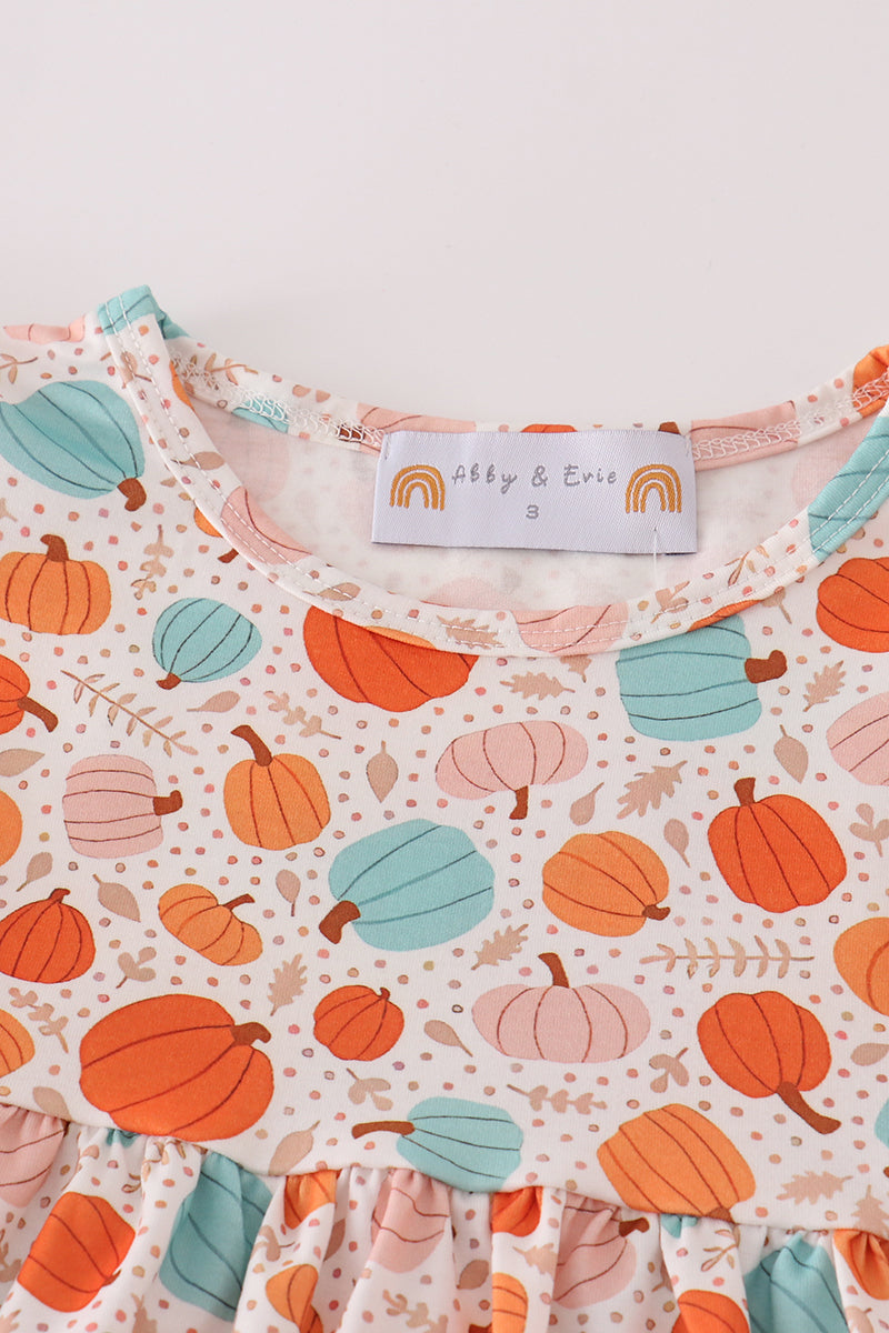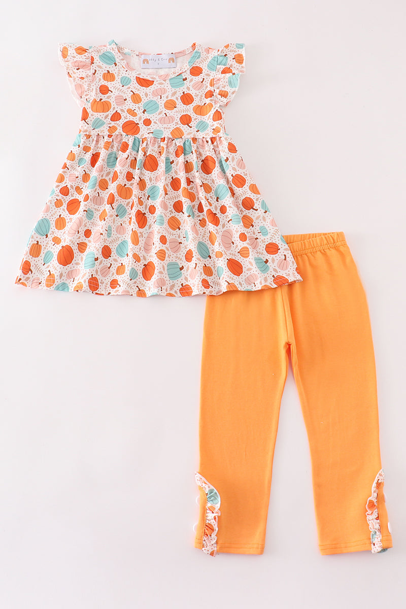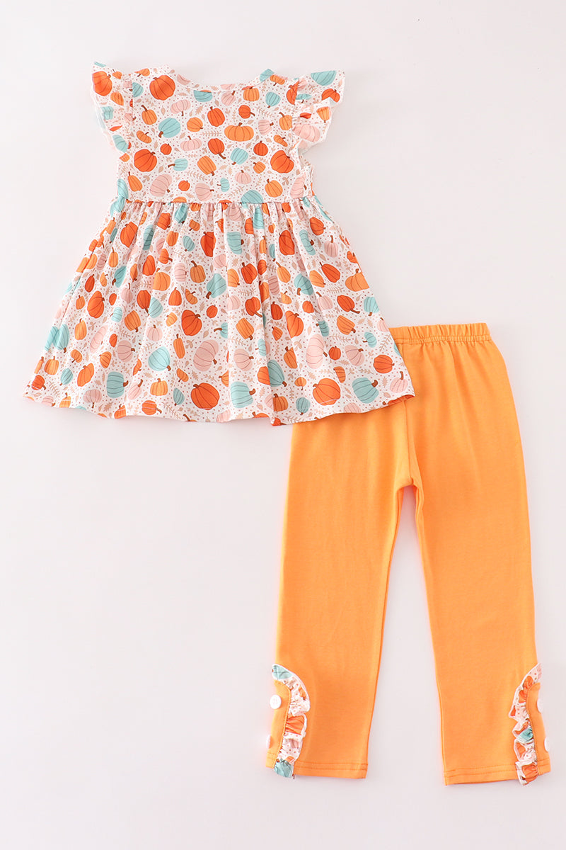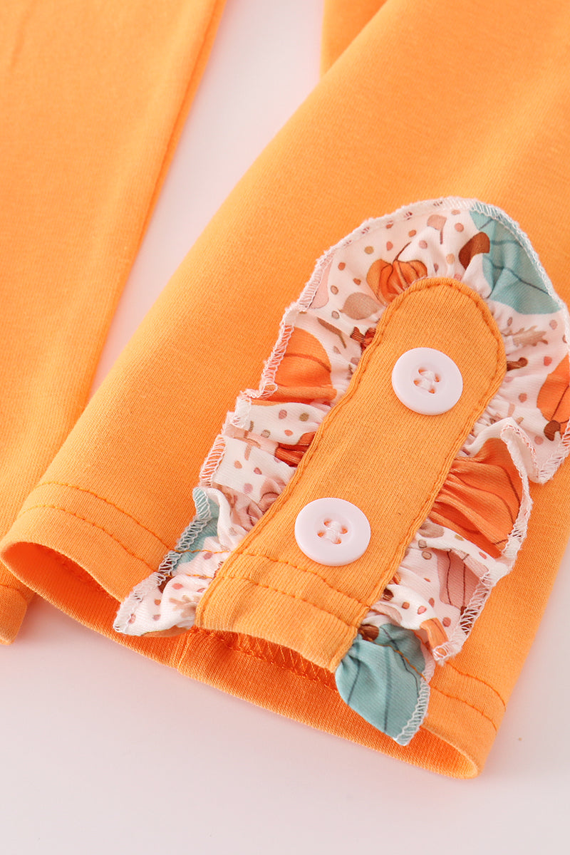 Get ready for fall with this adorable orange pumpkin print girl ruffle set! Perfect for pumpkin patches and apple picking, this set is both stylish and comfortable. With its playful ruffles and cute pumpkin print, your little girl will be the center of attention. (Pumpkin spice and everything nice!)