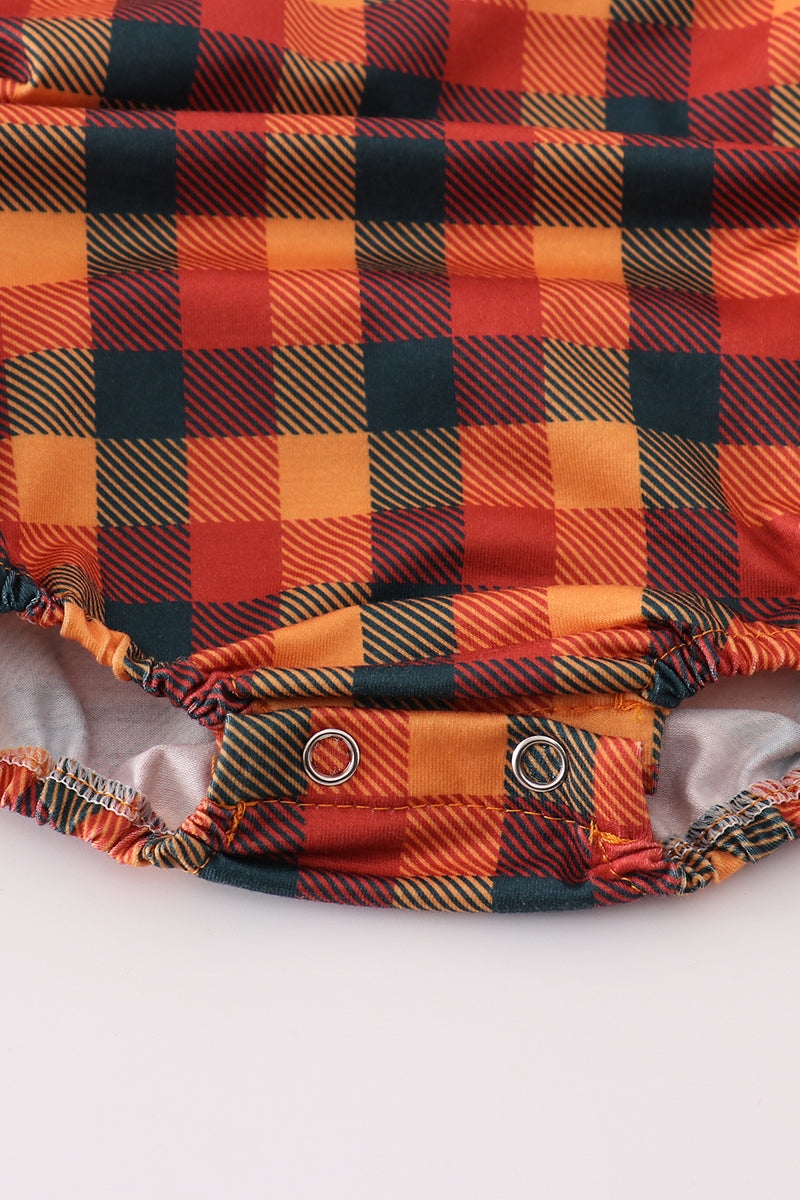 Get ready to gobble up some cuteness with our orange turkey embroidery plaid smocked boy bubble! This playful outfit features unique stitched detailing that will have your little one standing out from the flock. Perfect for Thanksgiving or any special occasion, this bubble combines style and comfort in one quirky package. (Feathers not included!)