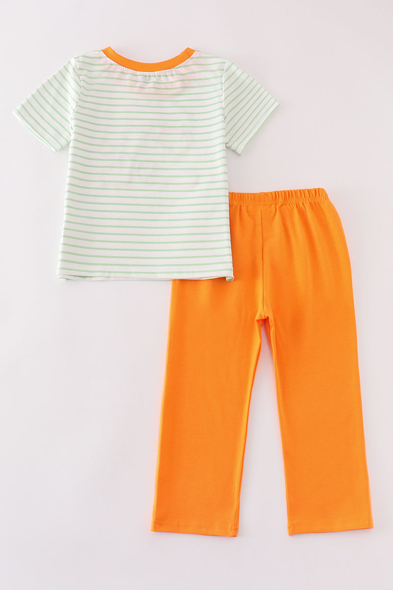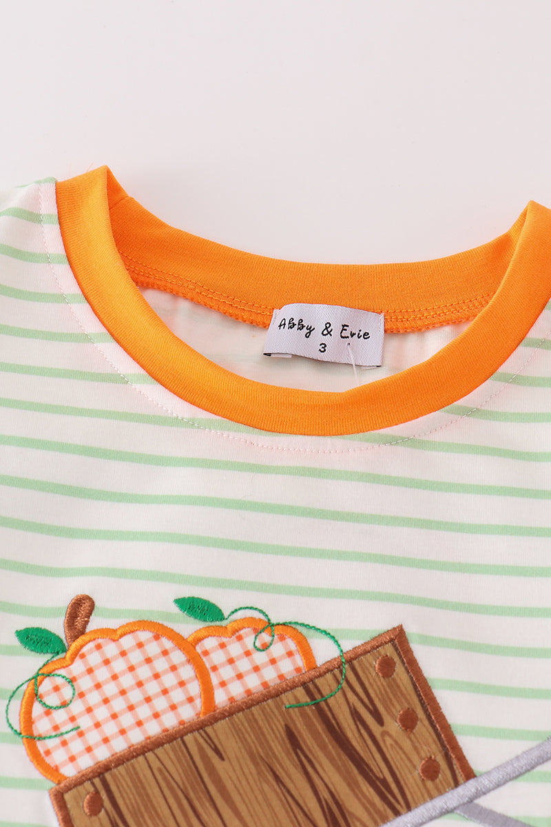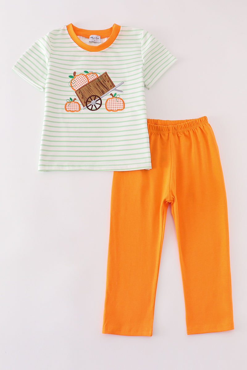 Get ready for some fall fun with our Orange Wheelbarrow Pumpkin Applique Boy Set! This playful set features a charming pumpkin applique and comes complete with a cute wheelbarrow design. Perfect for keeping your little one looking stylish while they play! (Pumpkin spice sold separately.)