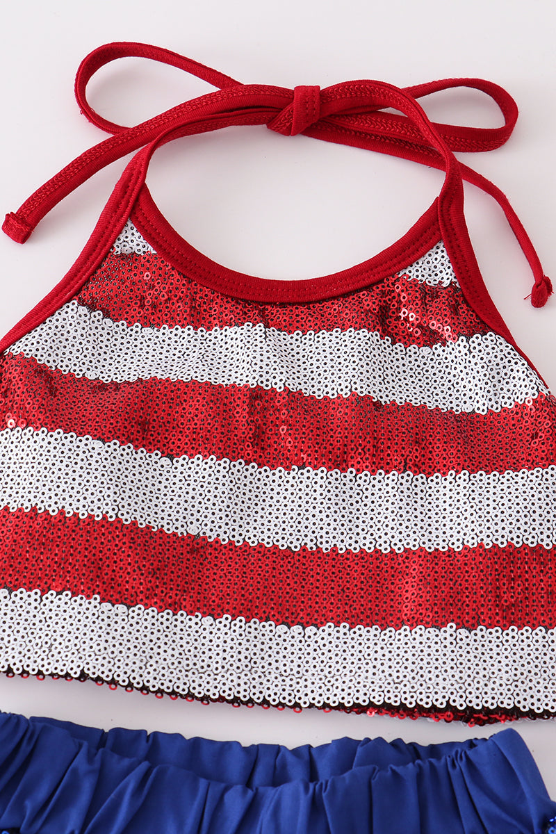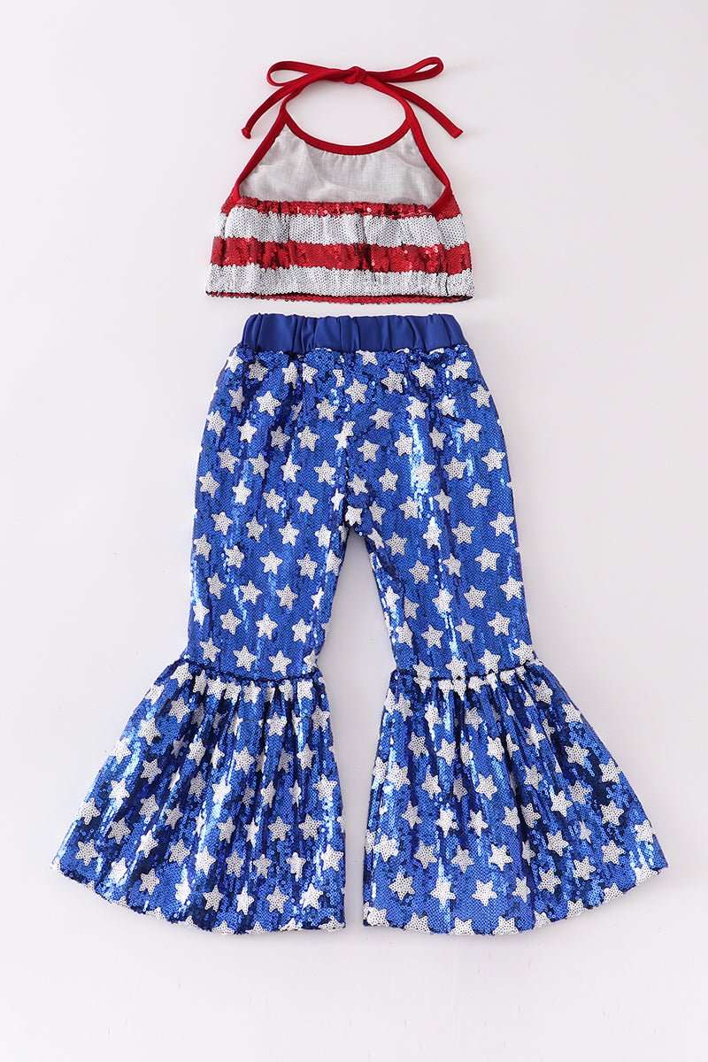 Sparkle and shine with this patriotic sequin girl set! Perfect for showing off your love for our country, this set is sure to turn heads. Get ready for all the compliments and fun with this unique and playful outfit. (And yes, it's as comfy as it is stylish!)