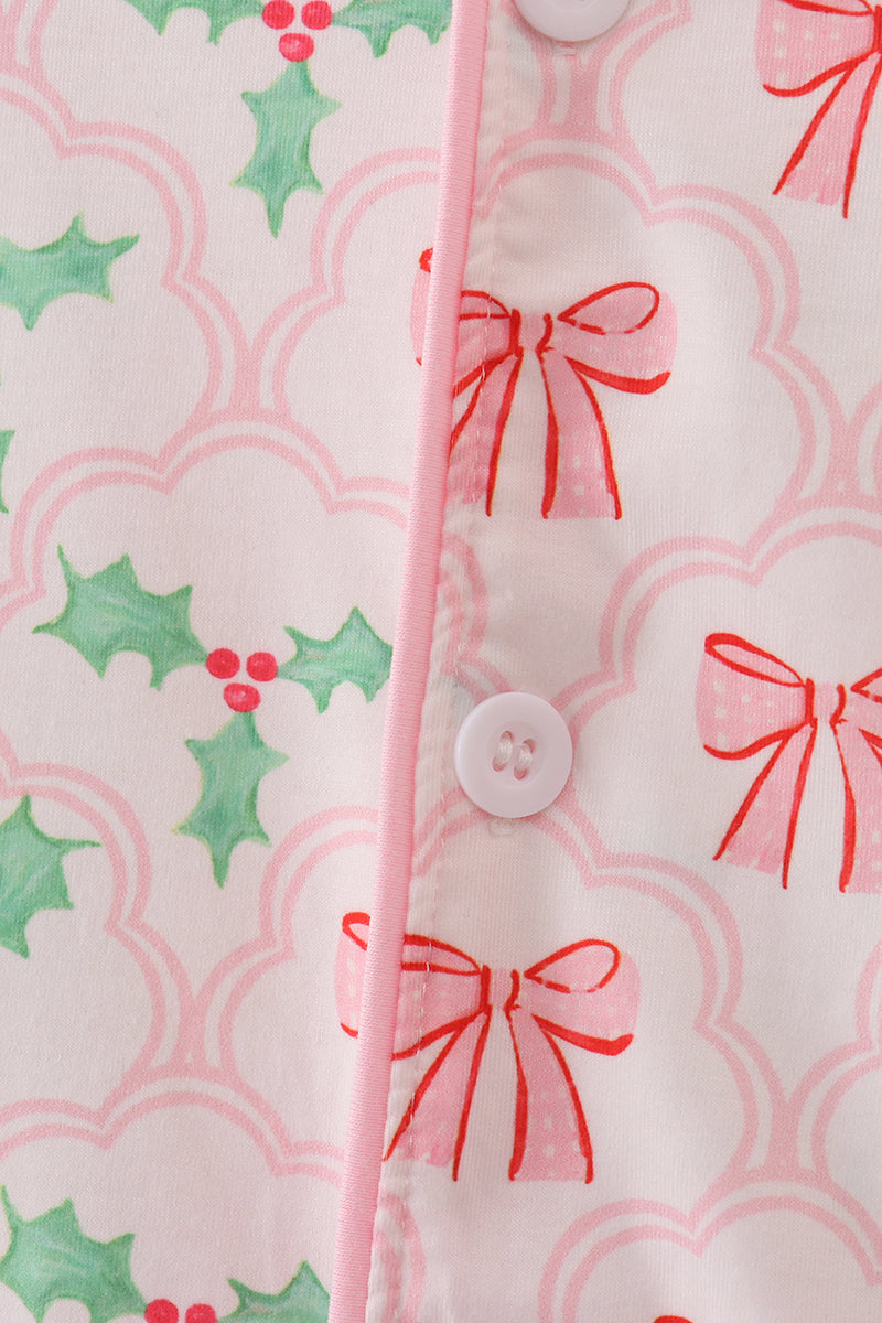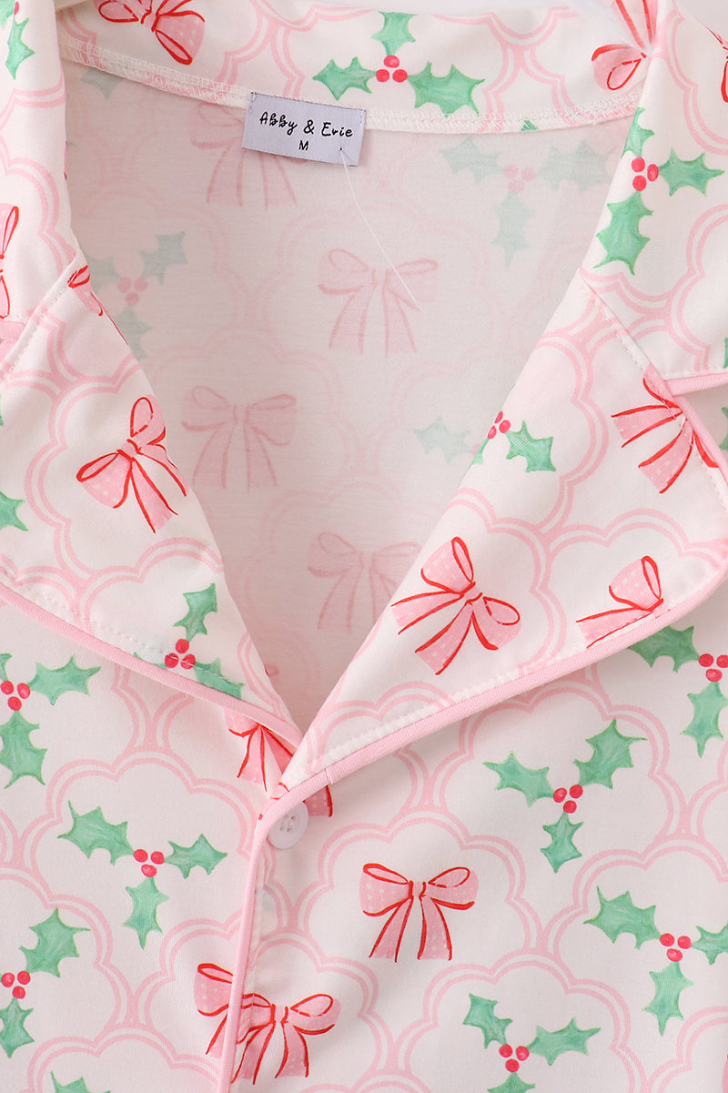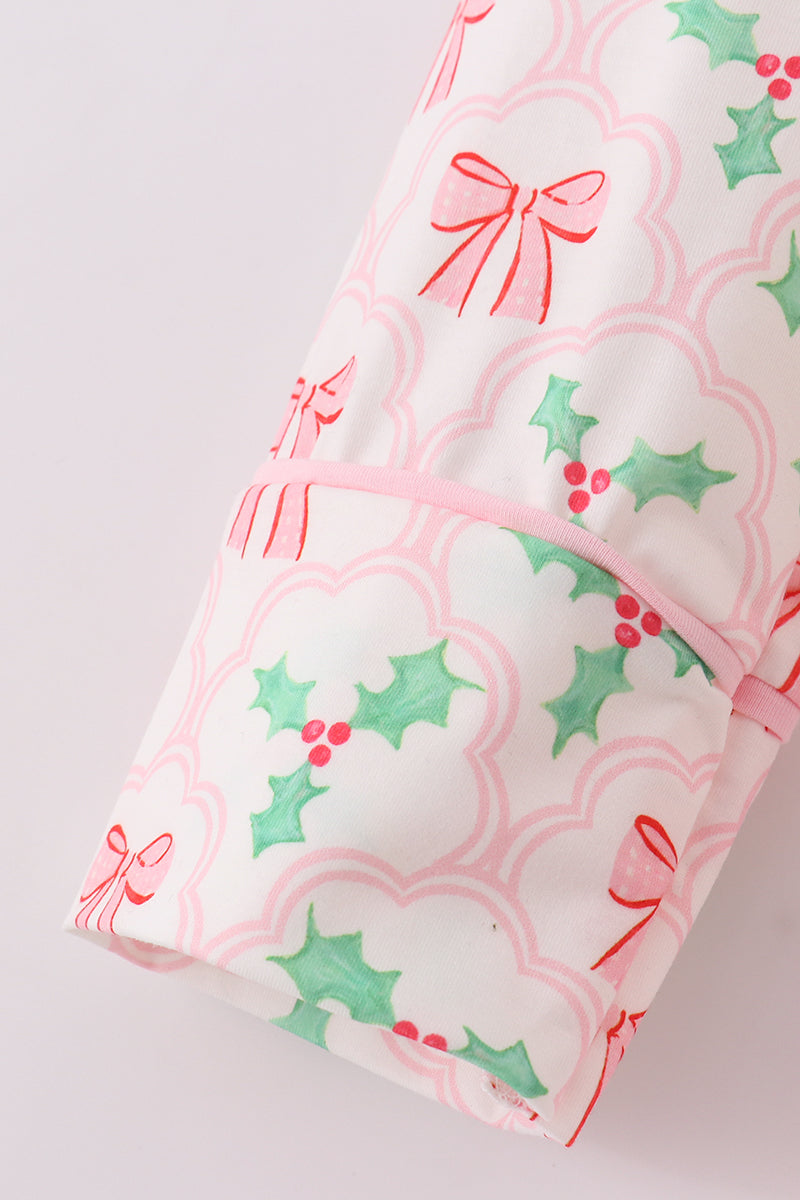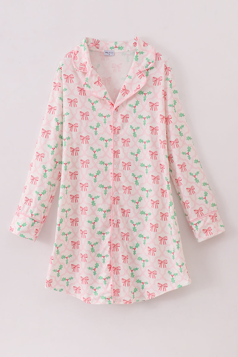 Get in the holiday spirit with our Pink Christmas Holly Bow Print Women Gown! This vibrant gown features a festive holly bow print, perfect for spreading holiday cheer. Stay stylish and comfortable this season with this quirky and playful gown. Limited quantities available, so get yours now!
