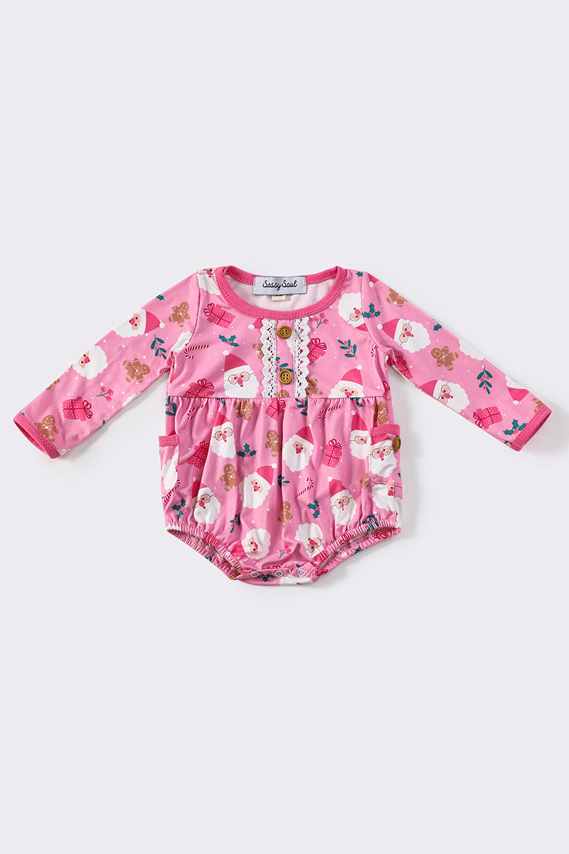 Get into the holiday spirit with this playful and quirky pink Christmas Santa print girl bubble outfit. Perfect for your little one to spread cheer and joy with its festive design. Celebrate the season in style with this unique and fun clothing piece!