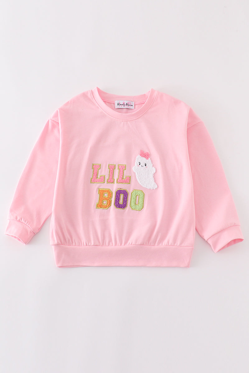 Get spooky in style with our cute Pink halloween LIL BOO chenille patch girl top! Made with soft chenille fabric, this top will keep you cozy while showing off your Halloween spirit. Perfect for celebrating or just adding a touch of whimsy to your wardrobe. Trick or treat yourself to this adorable top today!