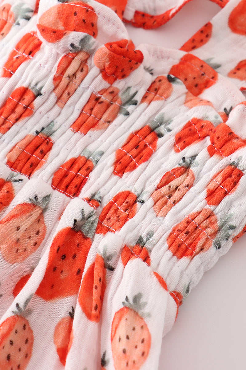 Get ready to look berry cute in this playful pink muslin strawberry smocked ruffle dress. Perfect for any occasion, the smocked design provides a comfortable and flattering fit, while the ruffle details add a touch of sweetness. Don't miss out on this must-have dress!